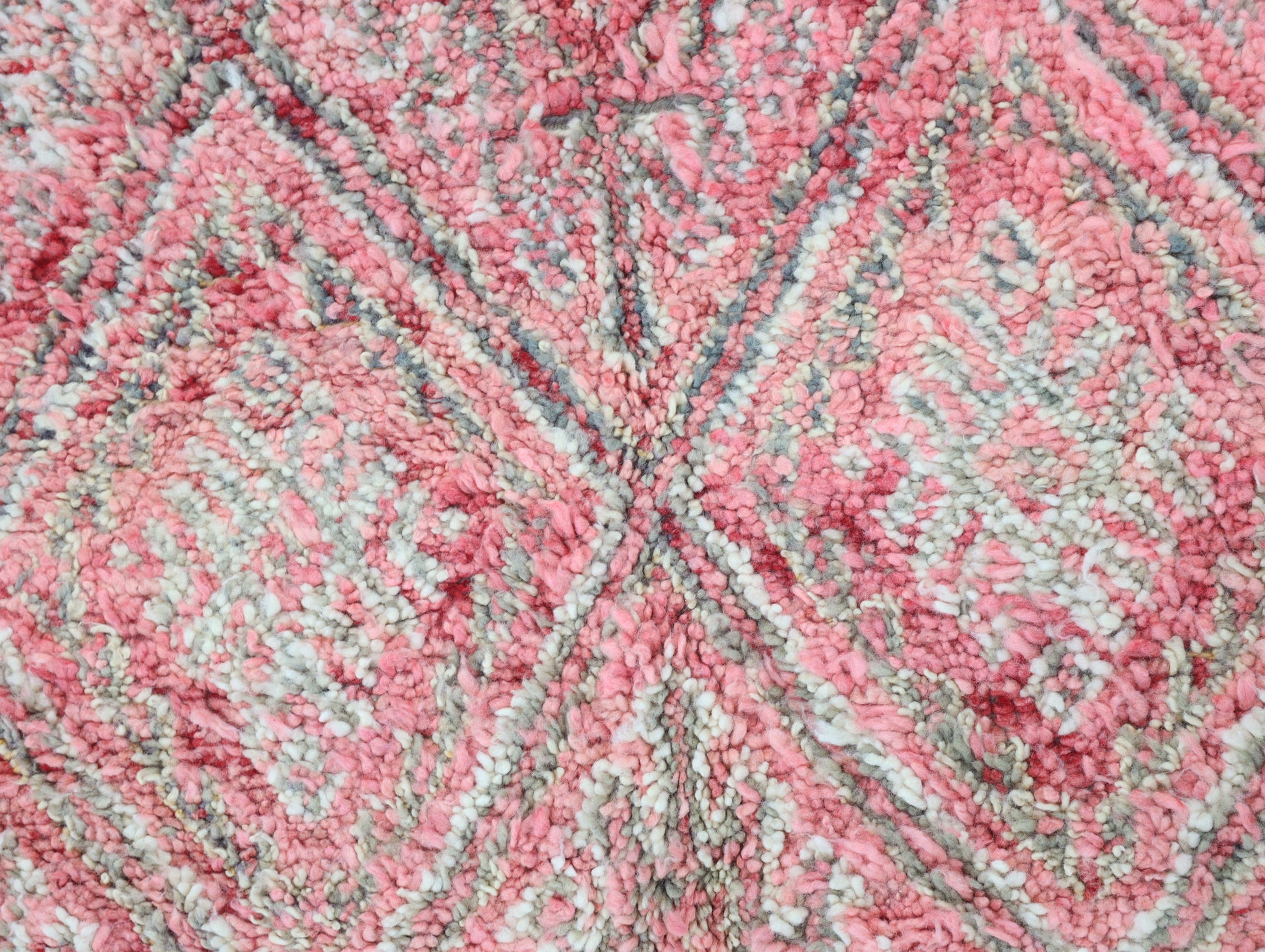 Originating in the Holy town of Boujad, these rugs, woven by diverse tribes, exhibit a wide spectrum of color, composition, and weave. Described as surreal, mystic, and mesmerizing, Boujad rugs transport us to a world beyond reality. Their construction, with twice as many horizontal as vertical knots, renders them floppy and easy to move.