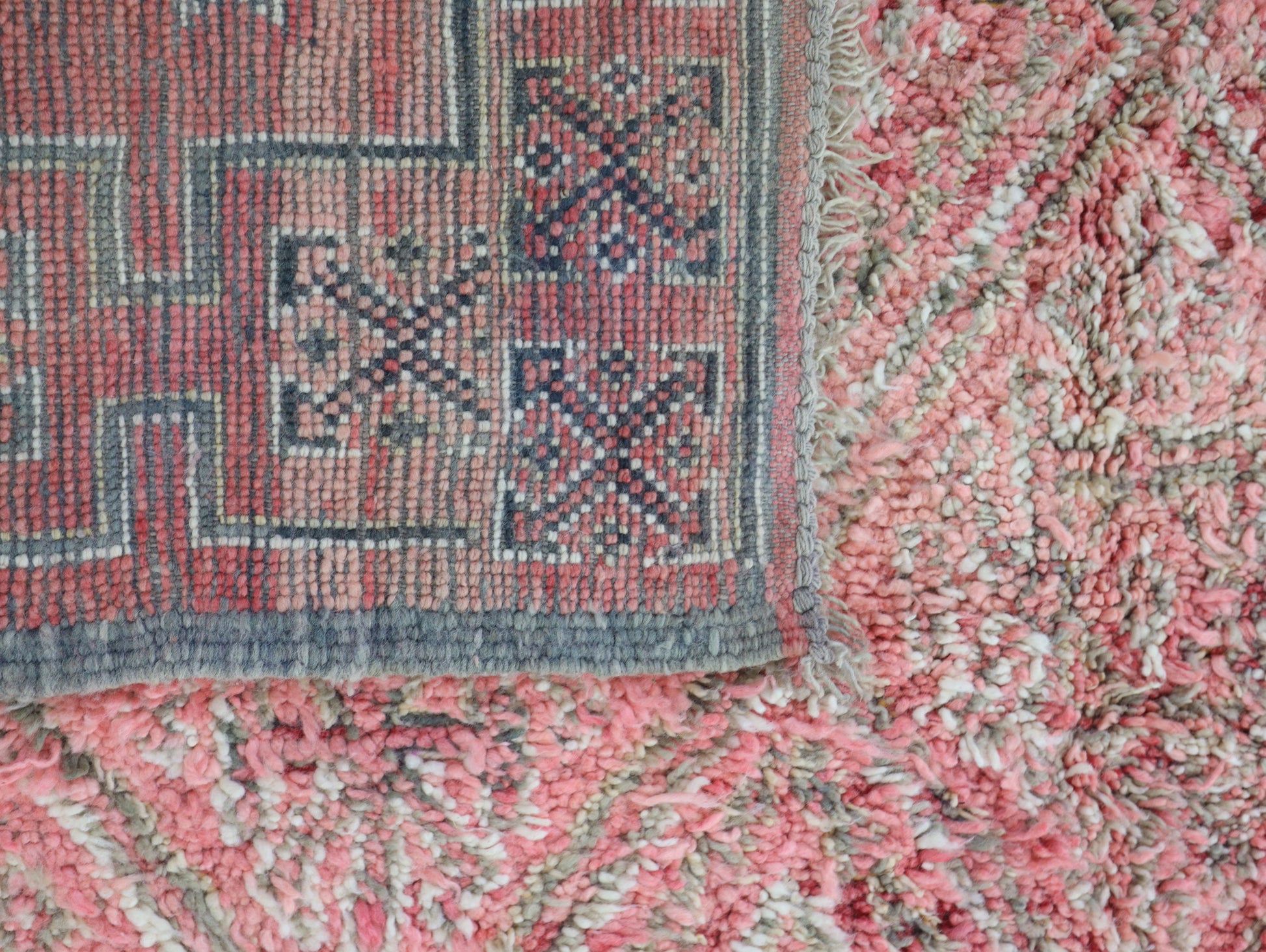 Wool, a sacred material for the Amazigh (Berber) people, forms the cornerstone of Moroccan rug design. Durable, long-lasting, and soft underfoot, wool is both functional and comfortable. In this piece, the wool pile is expertly knotted onto a wool foundation, adding substance and allowing it to gracefully embrace the floor.