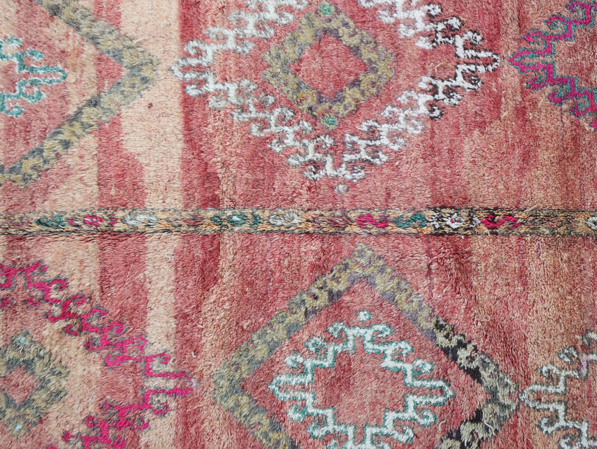 Originating in the Holy town of Boujad, these rugs, woven by diverse tribes, exhibit a wide spectrum of color, composition, and weave. Described as surreal, mystic, and mesmerizing, Boujad rugs transport us to a world beyond reality. Their construction, with twice as many horizontal as vertical knots, renders them floppy and easy to move.
