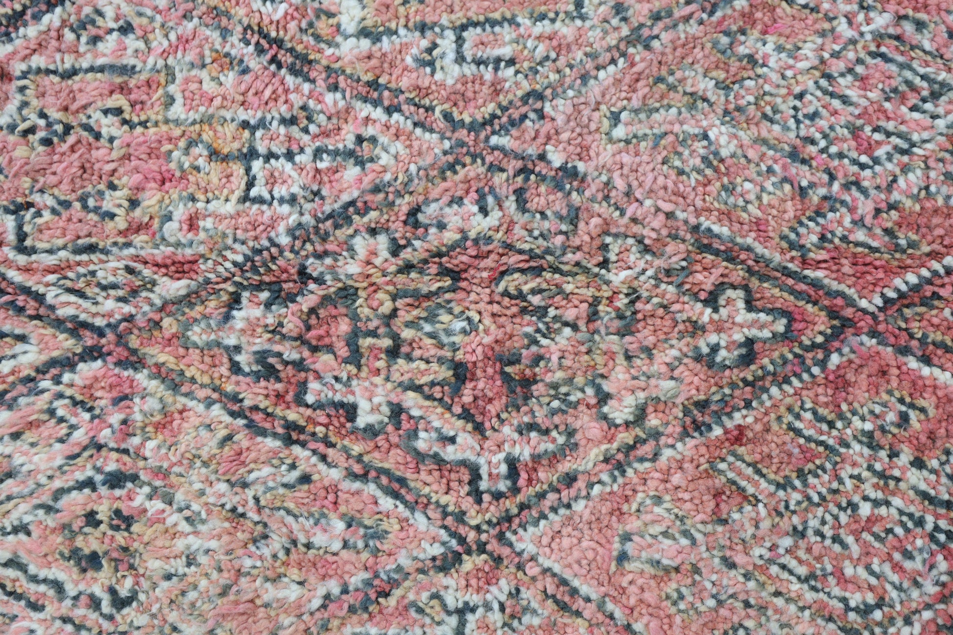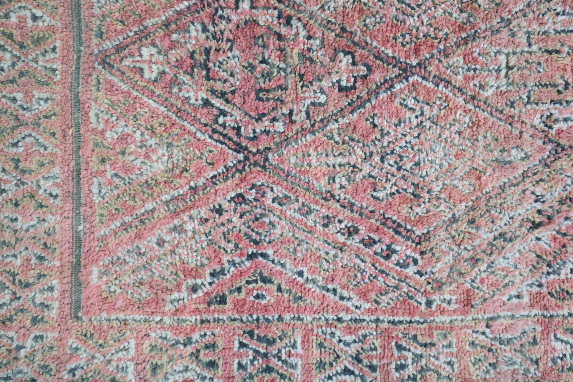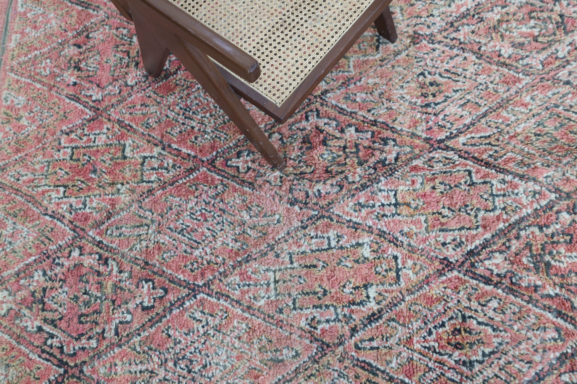 Wool, a sacred material for the Amazigh (Berber) people, forms the cornerstone of Moroccan rug design. Durable, long-lasting, and soft underfoot, wool is both functional and comfortable. In this piece, the wool pile is expertly knotted onto a wool foundation, adding substance and allowing it to gracefully embrace the floor.
