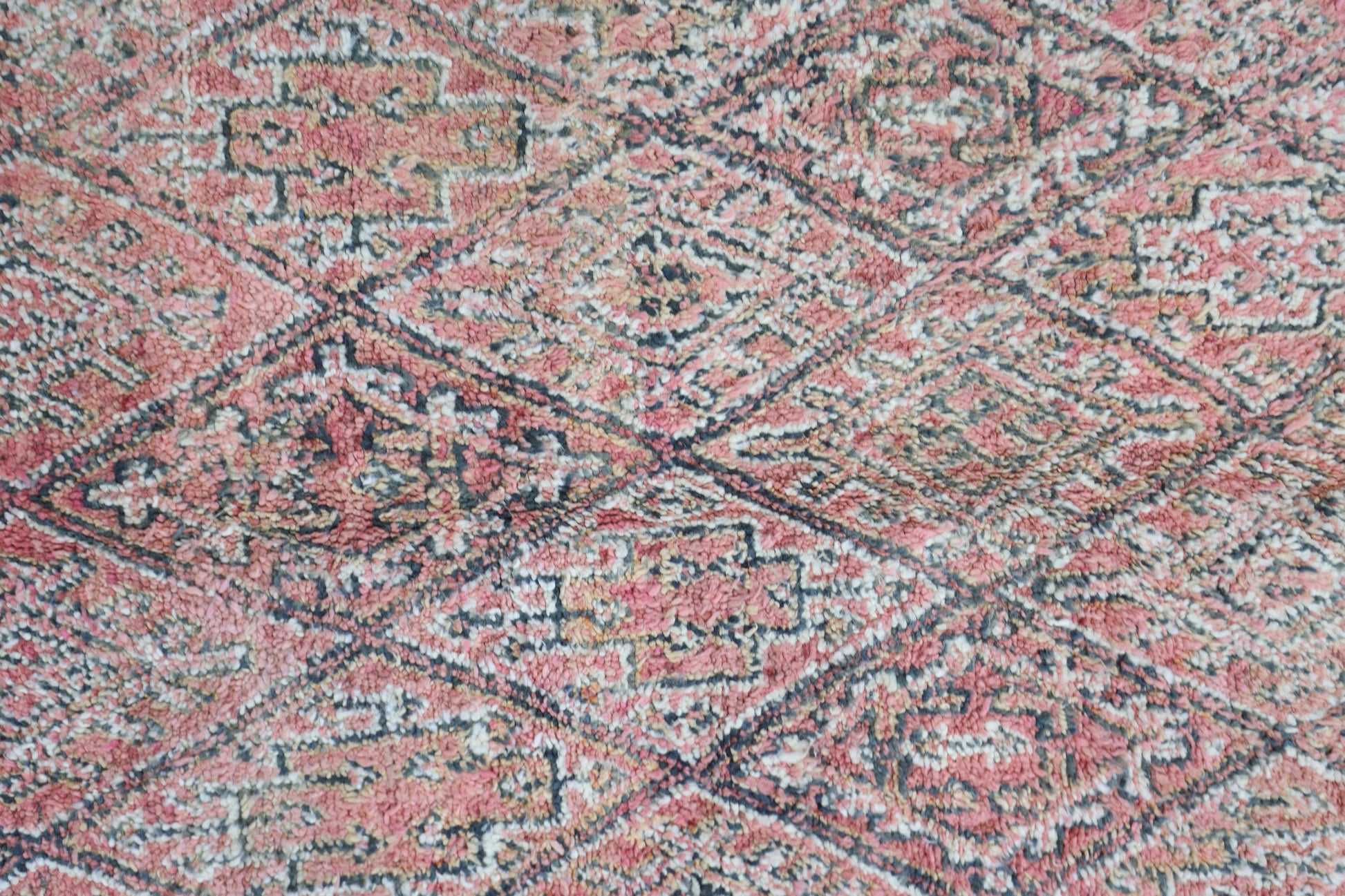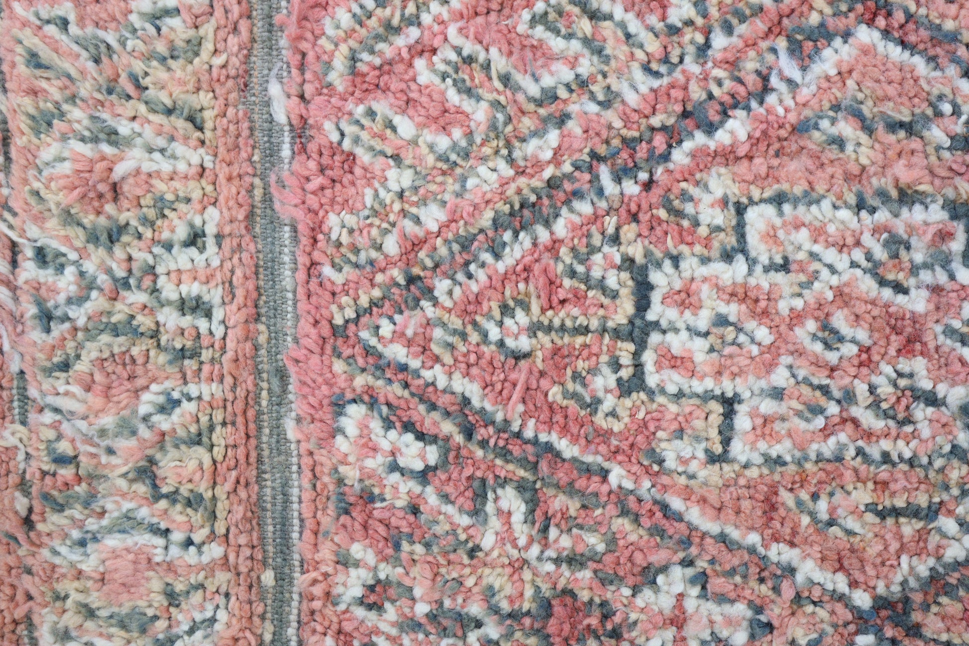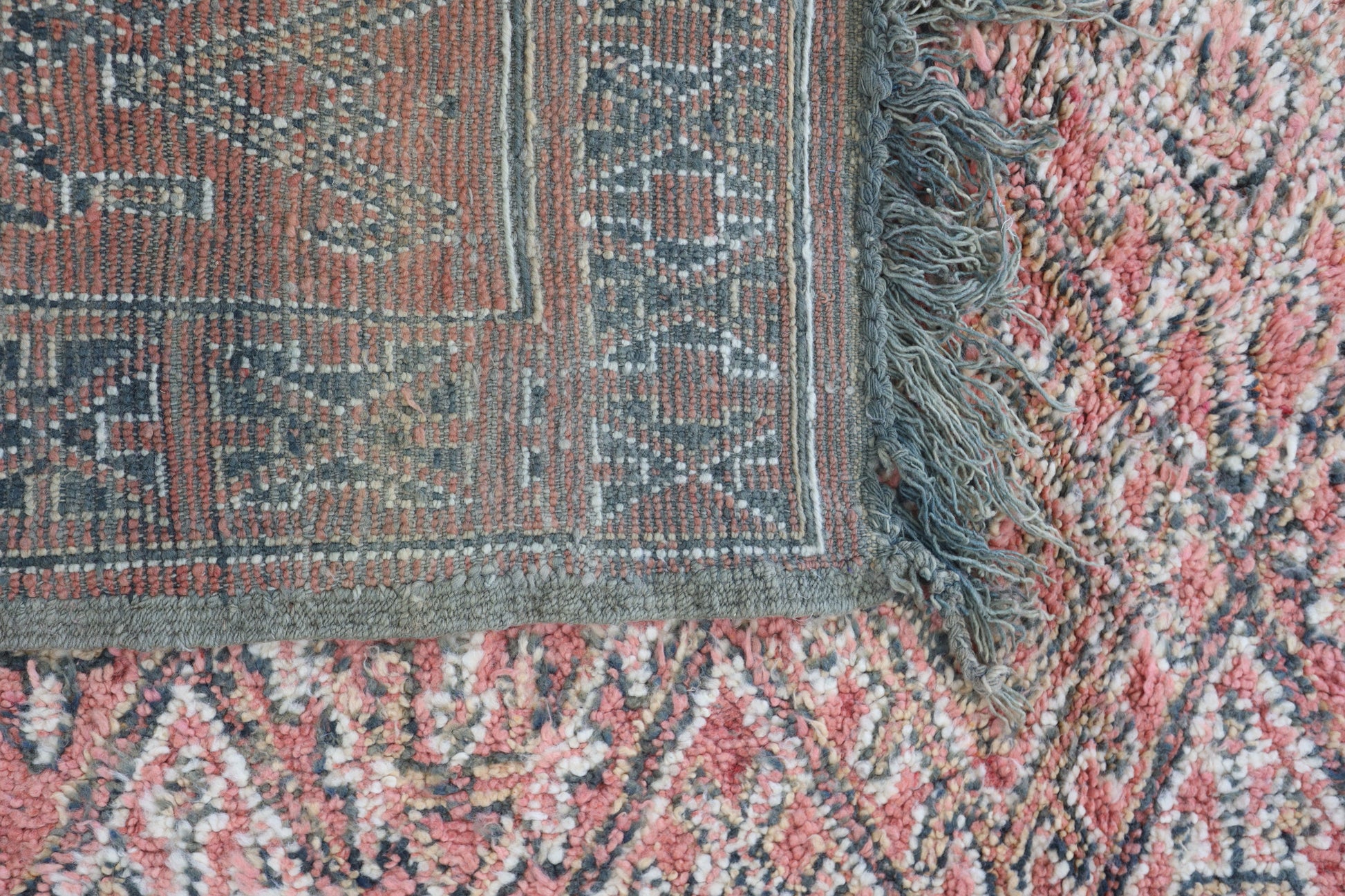 Wool, a sacred material for the Amazigh (Berber) people, forms the cornerstone of Moroccan rug design. Durable, long-lasting, and soft underfoot, wool is both functional and comfortable. In this piece, the wool pile is expertly knotted onto a wool foundation, adding substance and allowing it to gracefully embrace the floor.
