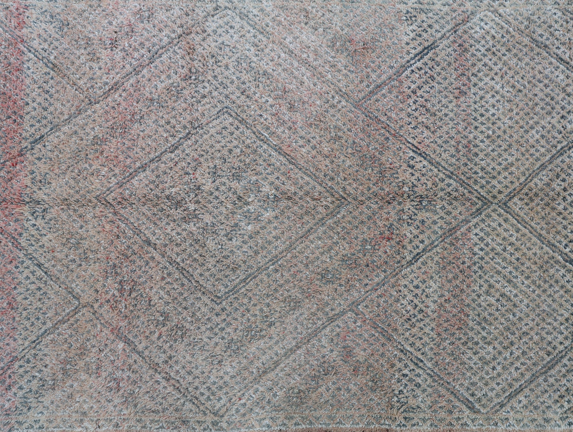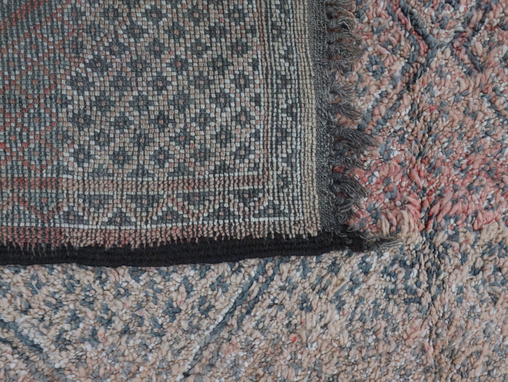 Wool, a sacred material for the Amazigh (Berber) people, forms the cornerstone of Moroccan rug design. Durable, long-lasting, and soft underfoot, wool is both functional and comfortable. In this piece, the wool pile is expertly knotted onto a wool foundation, adding substance and allowing it to gracefully embrace the floor.