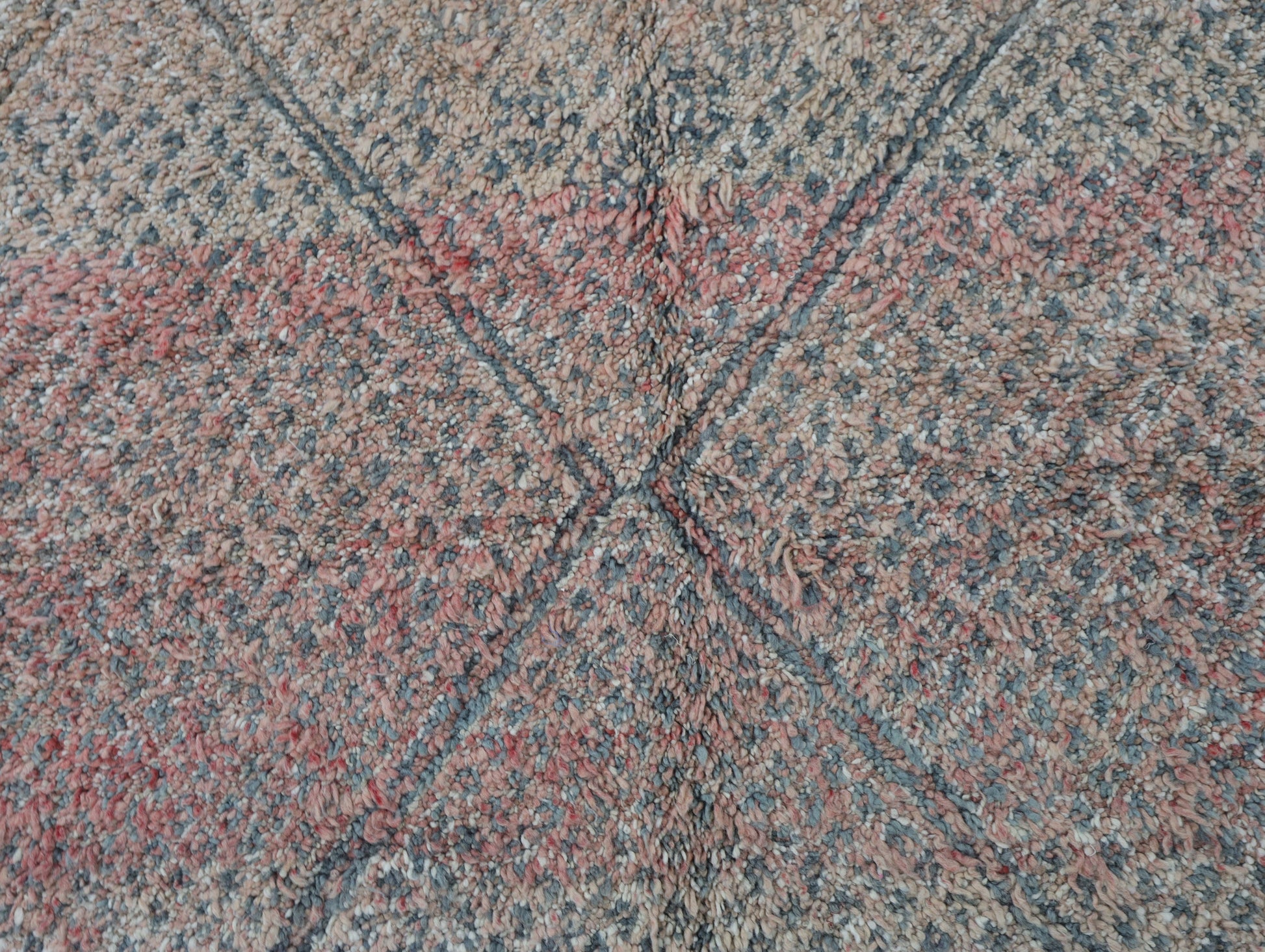 Originating in the Holy town of Boujad, these rugs, woven by diverse tribes, exhibit a wide spectrum of color, composition, and weave. Described as surreal, mystic, and mesmerizing, Boujad rugs transport us to a world beyond reality. Their construction, with twice as many horizontal as vertical knots, renders them floppy and easy to move.