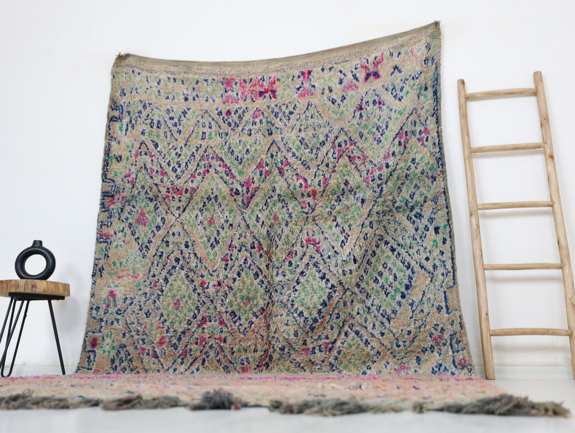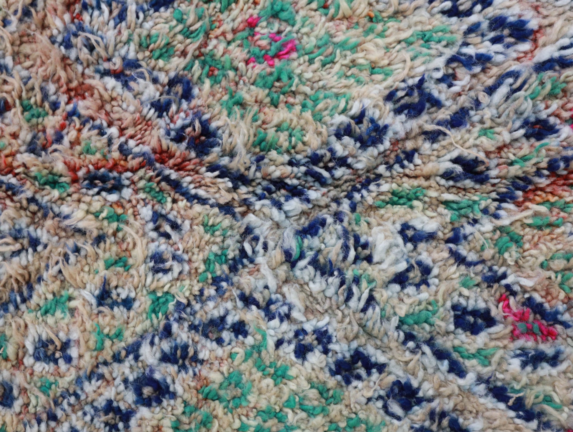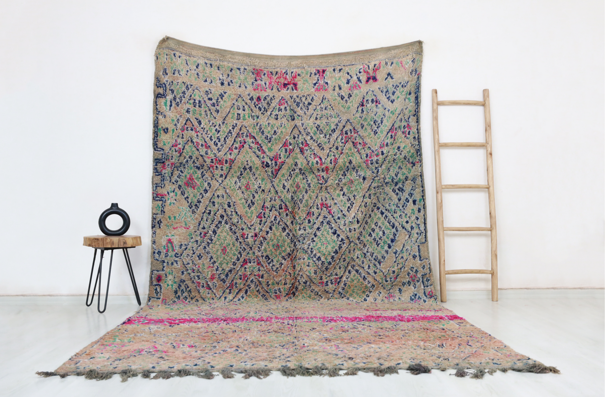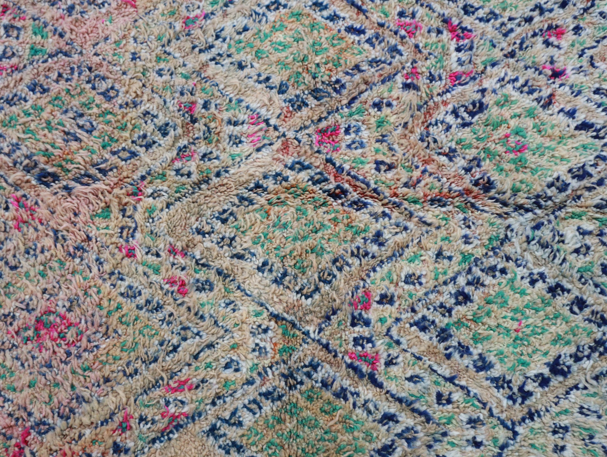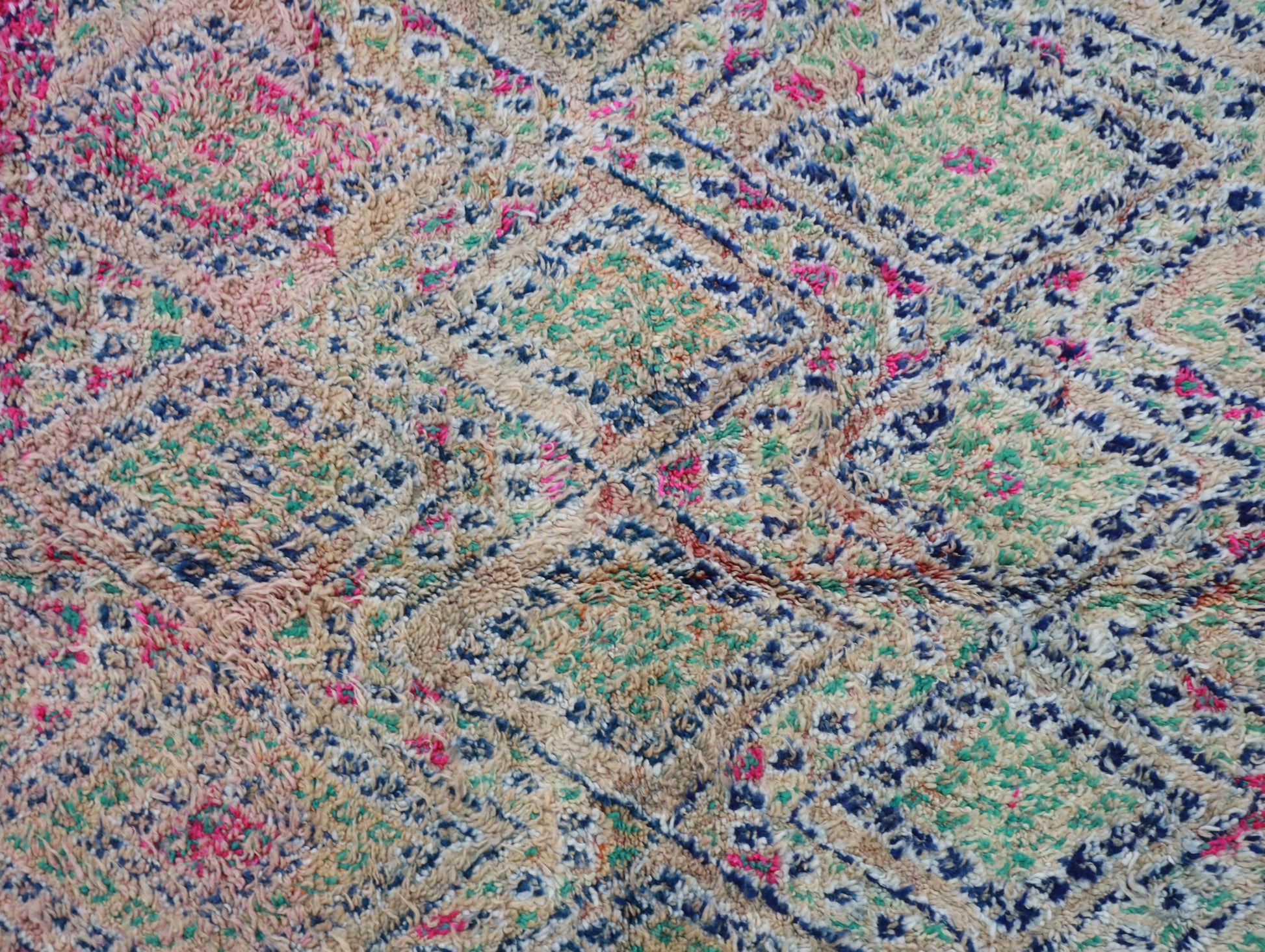 Originating in the Holy town of Boujad, these rugs, woven by diverse tribes, exhibit a wide spectrum of color, composition, and weave. Described as surreal, mystic, and mesmerizing, Boujad rugs transport us to a world beyond reality. Their construction, with twice as many horizontal as vertical knots, renders them floppy and easy to move.