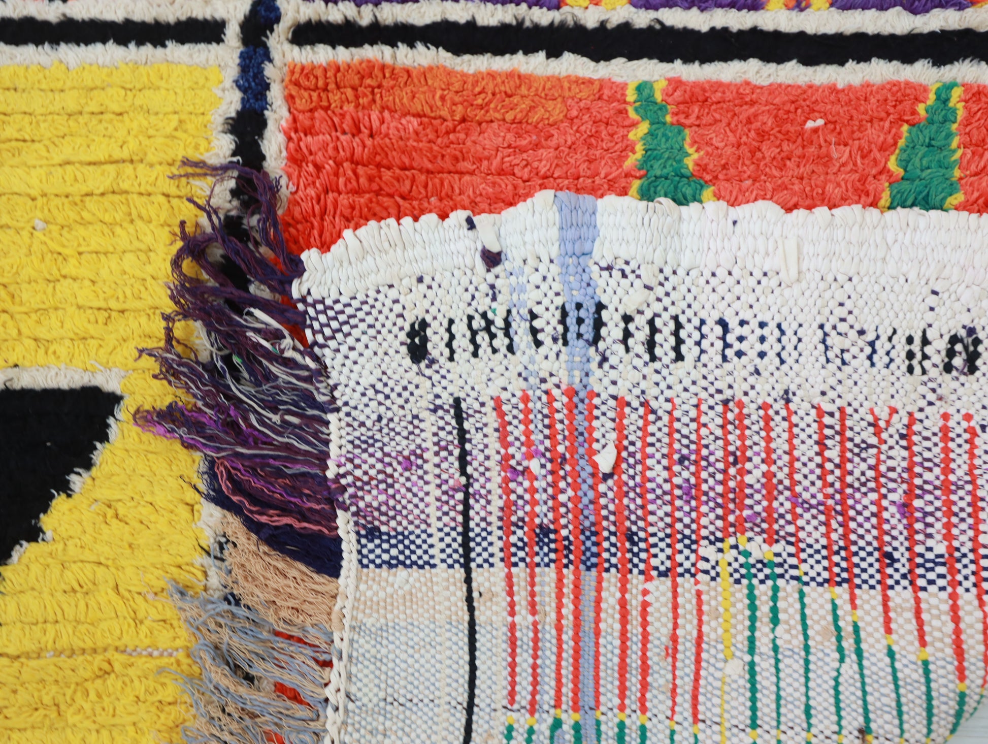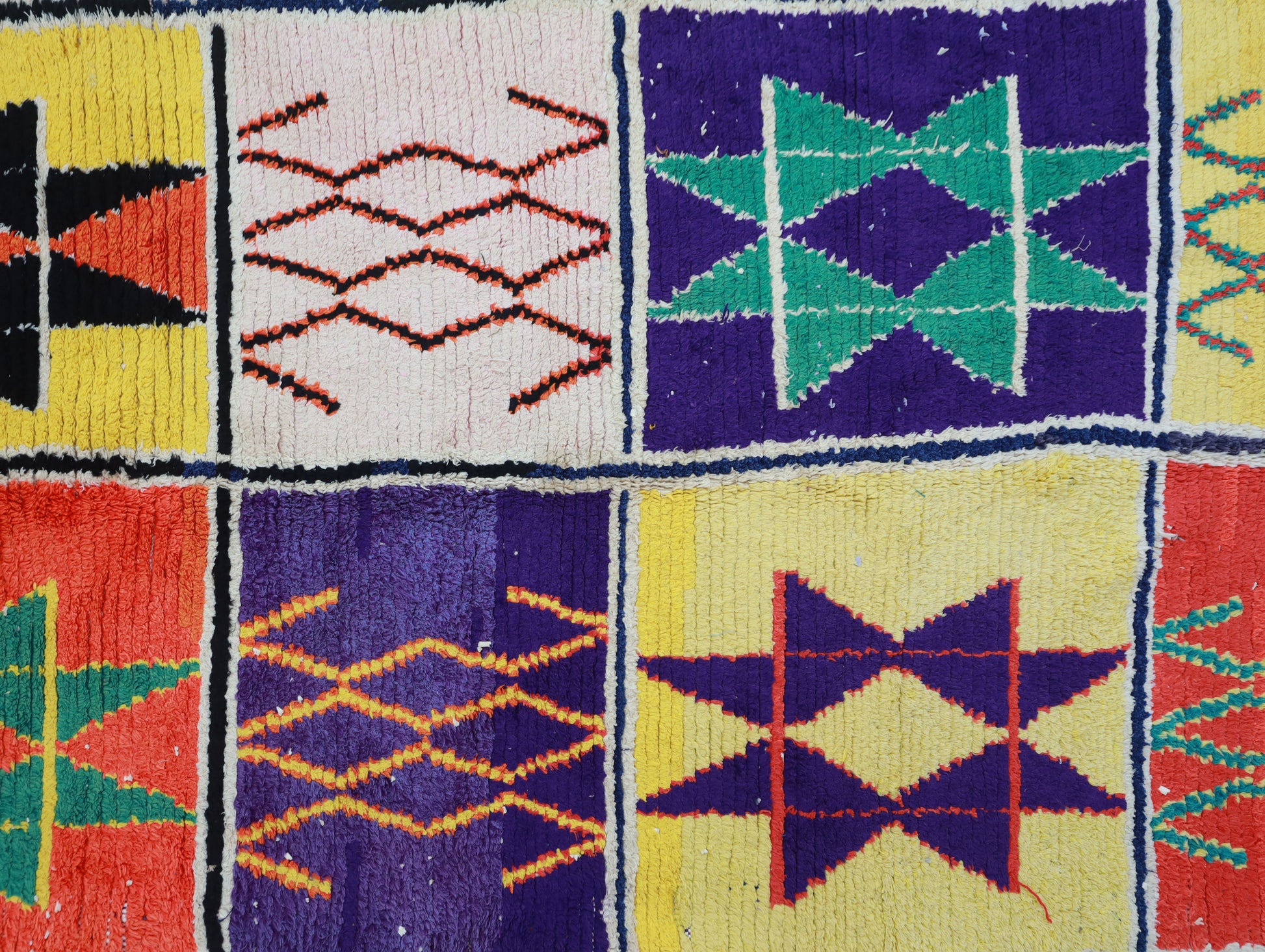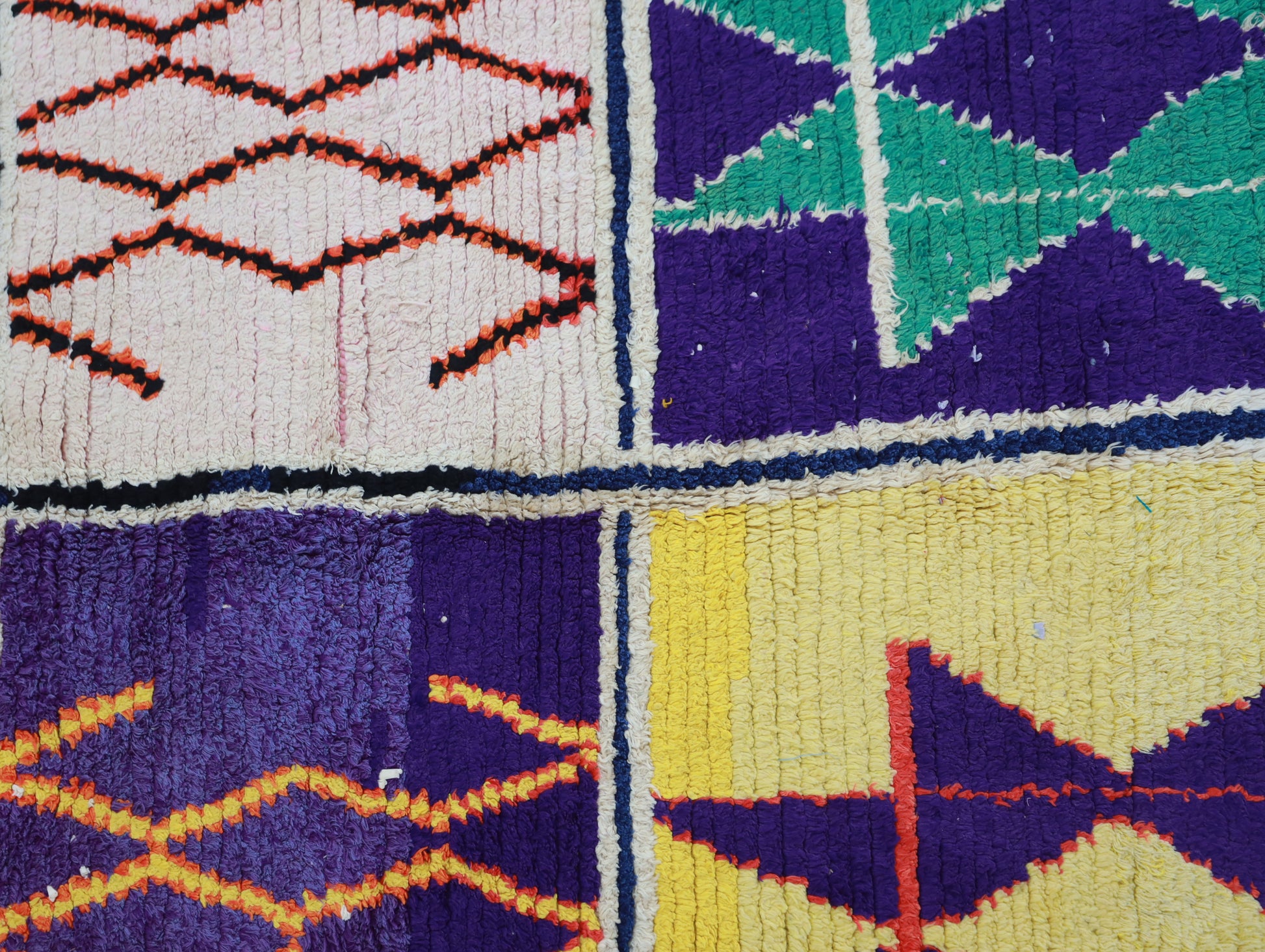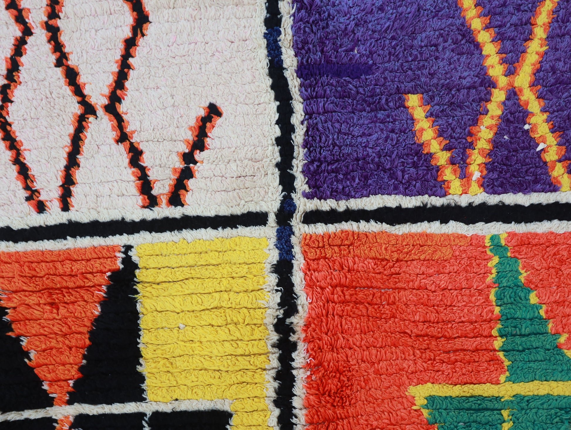 Azilal rugs boast abstract, painterly designs reminiscent of rugs from Ourika. What sets them apart is a vibrant color palette, achieved through the incorporation of cotton alongside wool..