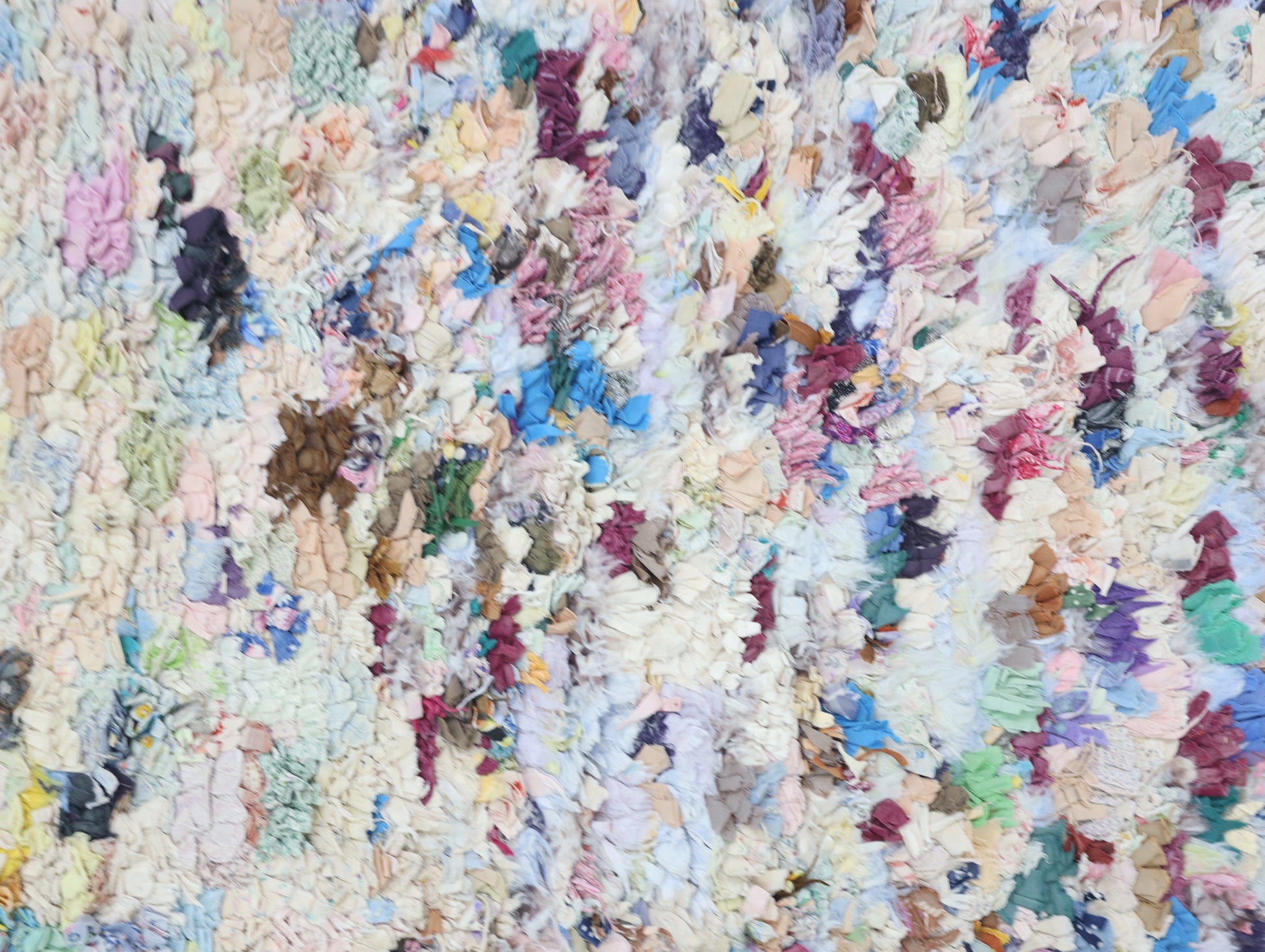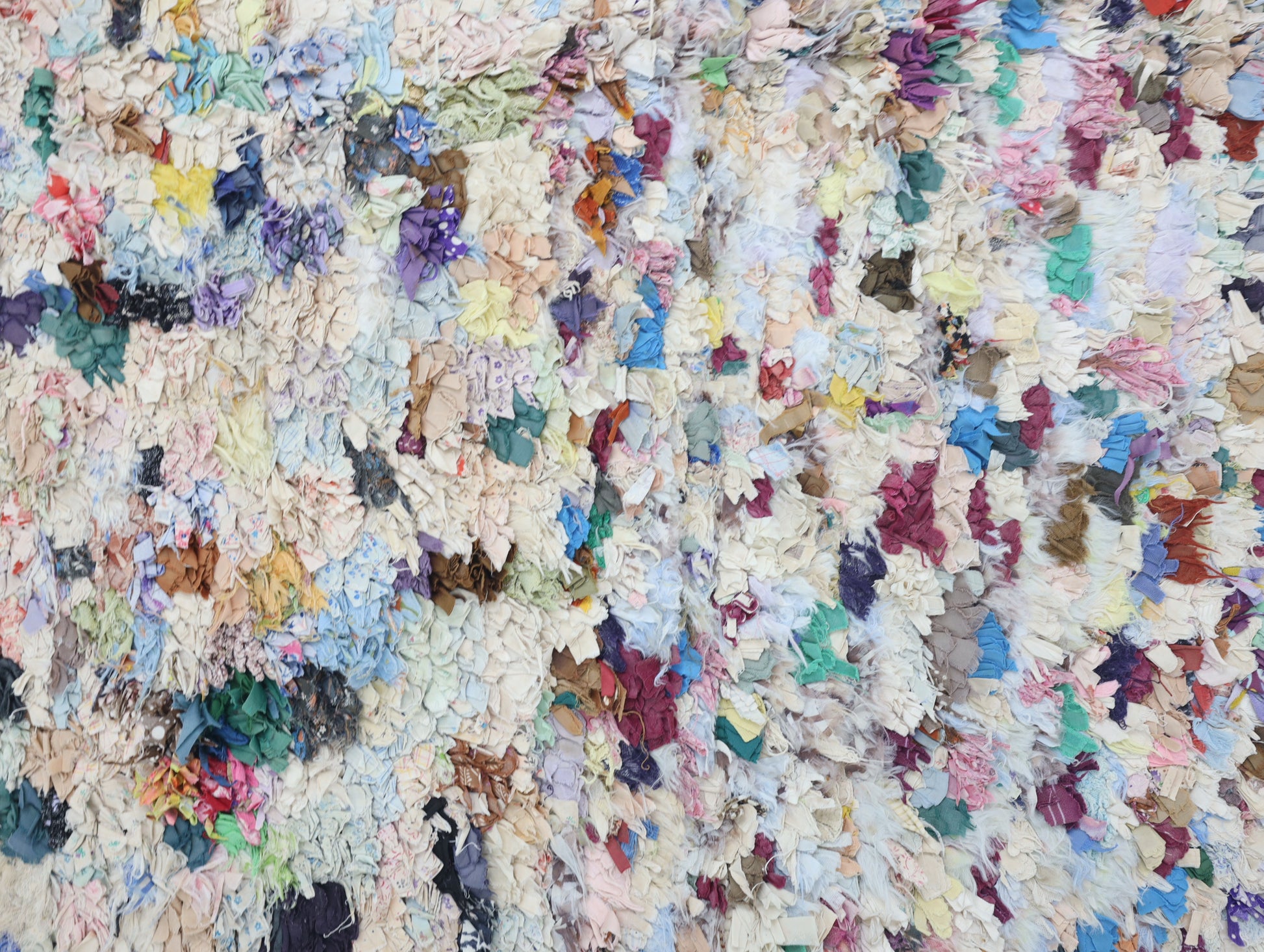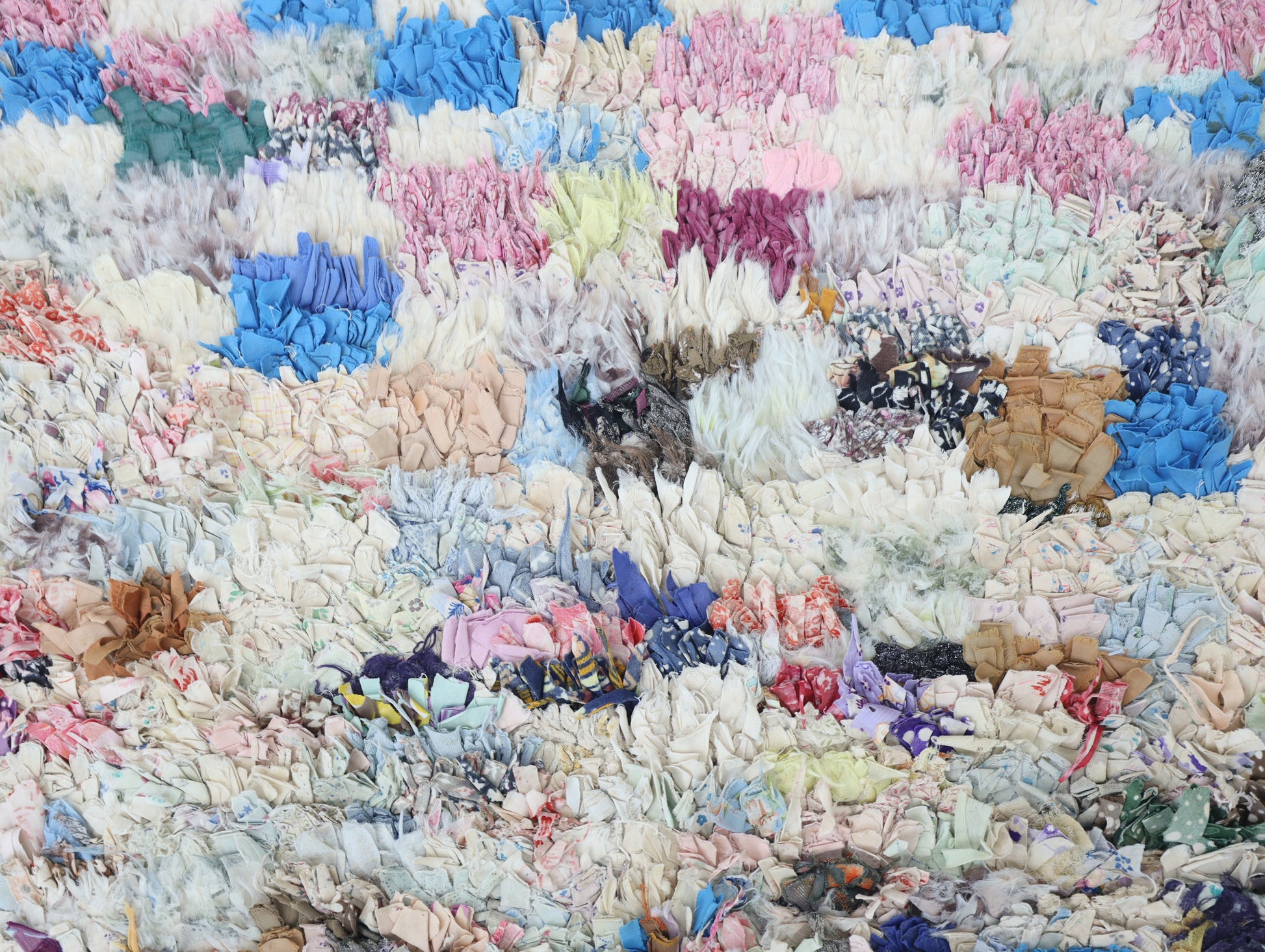 An unparalleled vintage masterpiece, carefully crafted by Berber Tribes in the Boucherouite style using upcycled textiles. Measurements: 4'1" x 6'3" (126 cm x 192 cm),