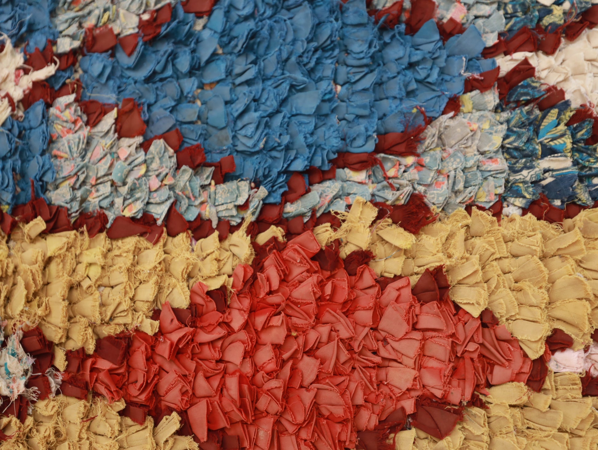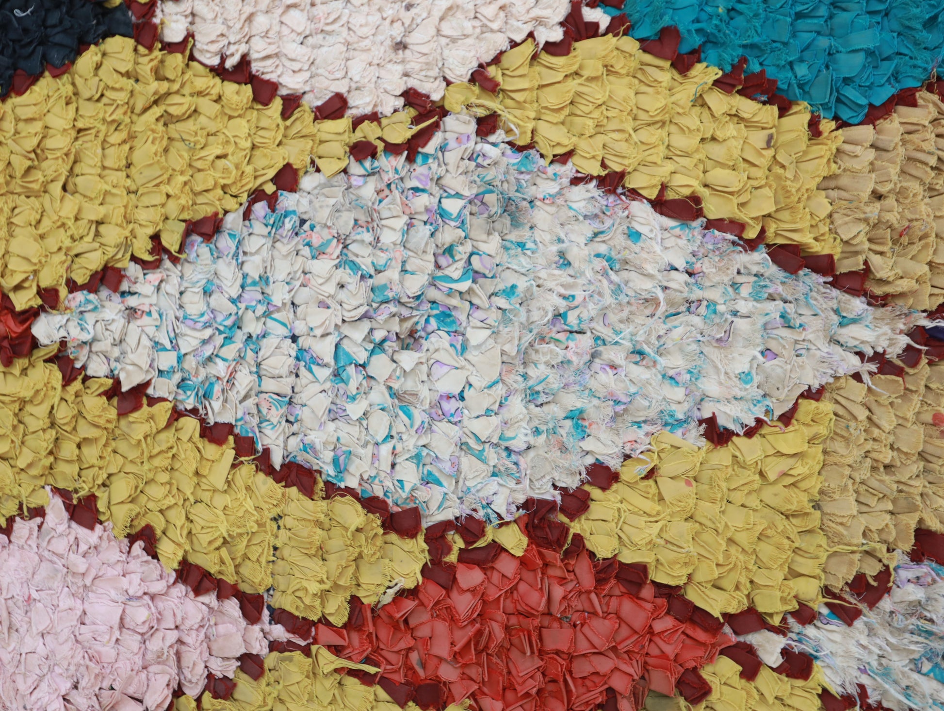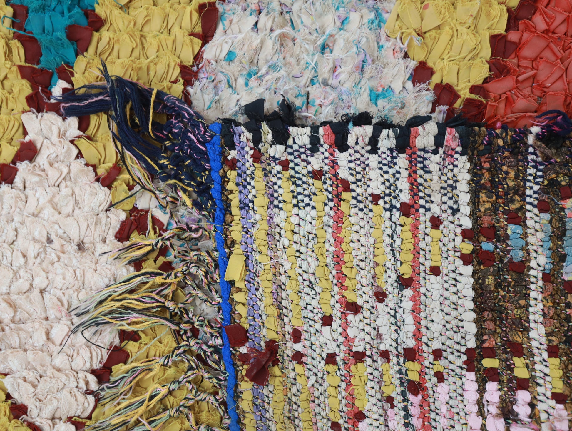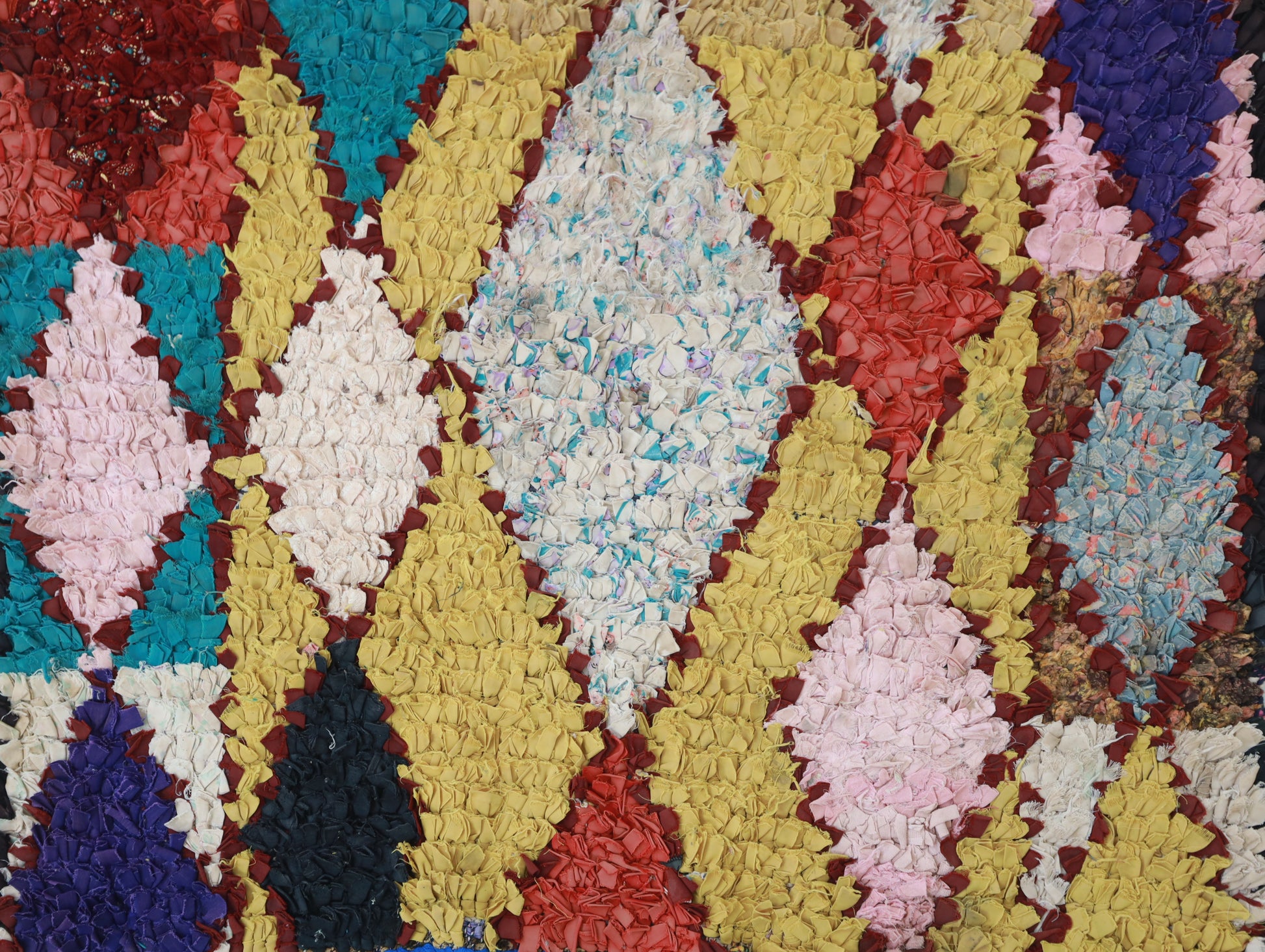 An unparalleled vintage masterpiece, carefully crafted by Berber Tribes in the Boucherouite style using upcycled textiles. Measurements: 3'0" x 6'6" (90 cm x 200 cm),