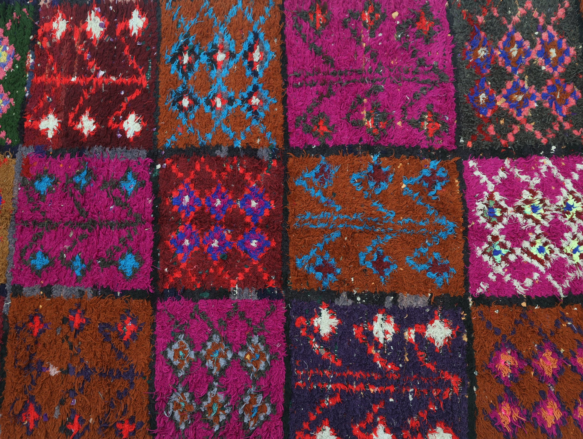 An unparalleled vintage masterpiece, carefully crafted by Berber Tribes in the Boucherouite style using upcycled textiles. Measurements: 4'1" x 8'3" (124 cm x 254 cm),