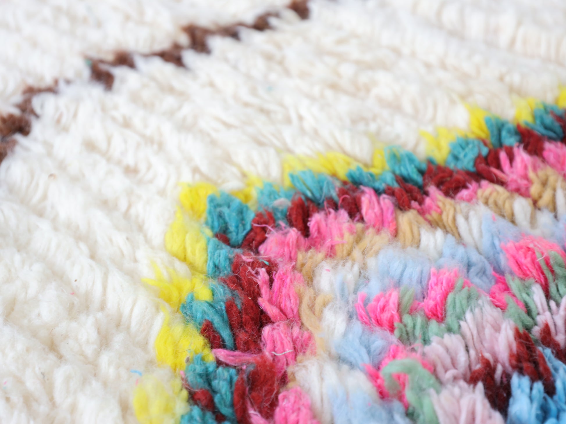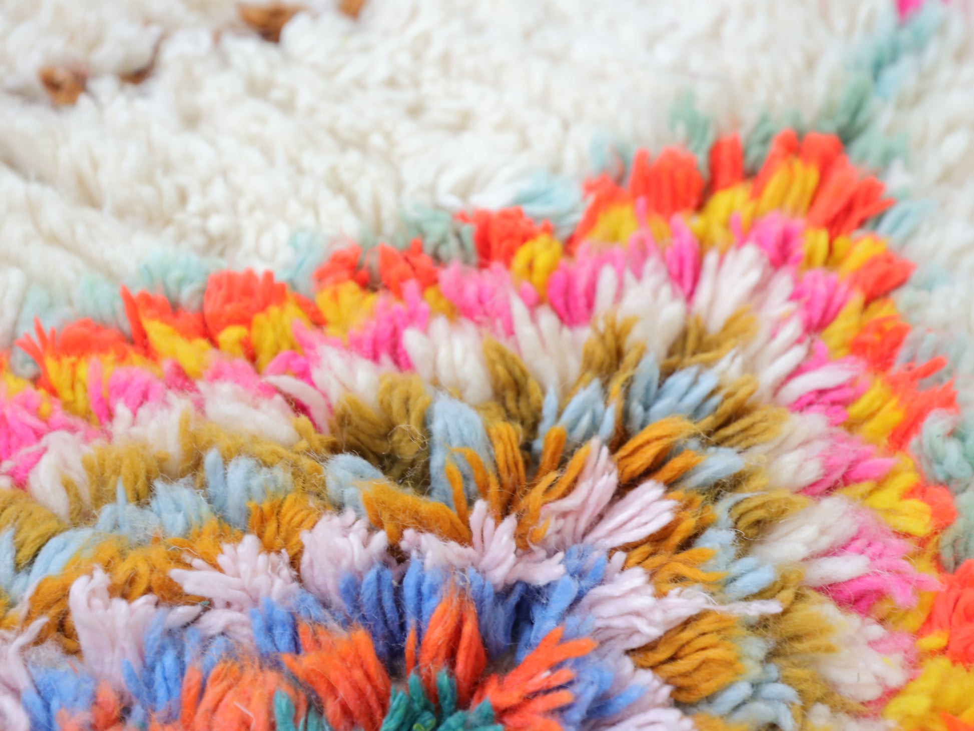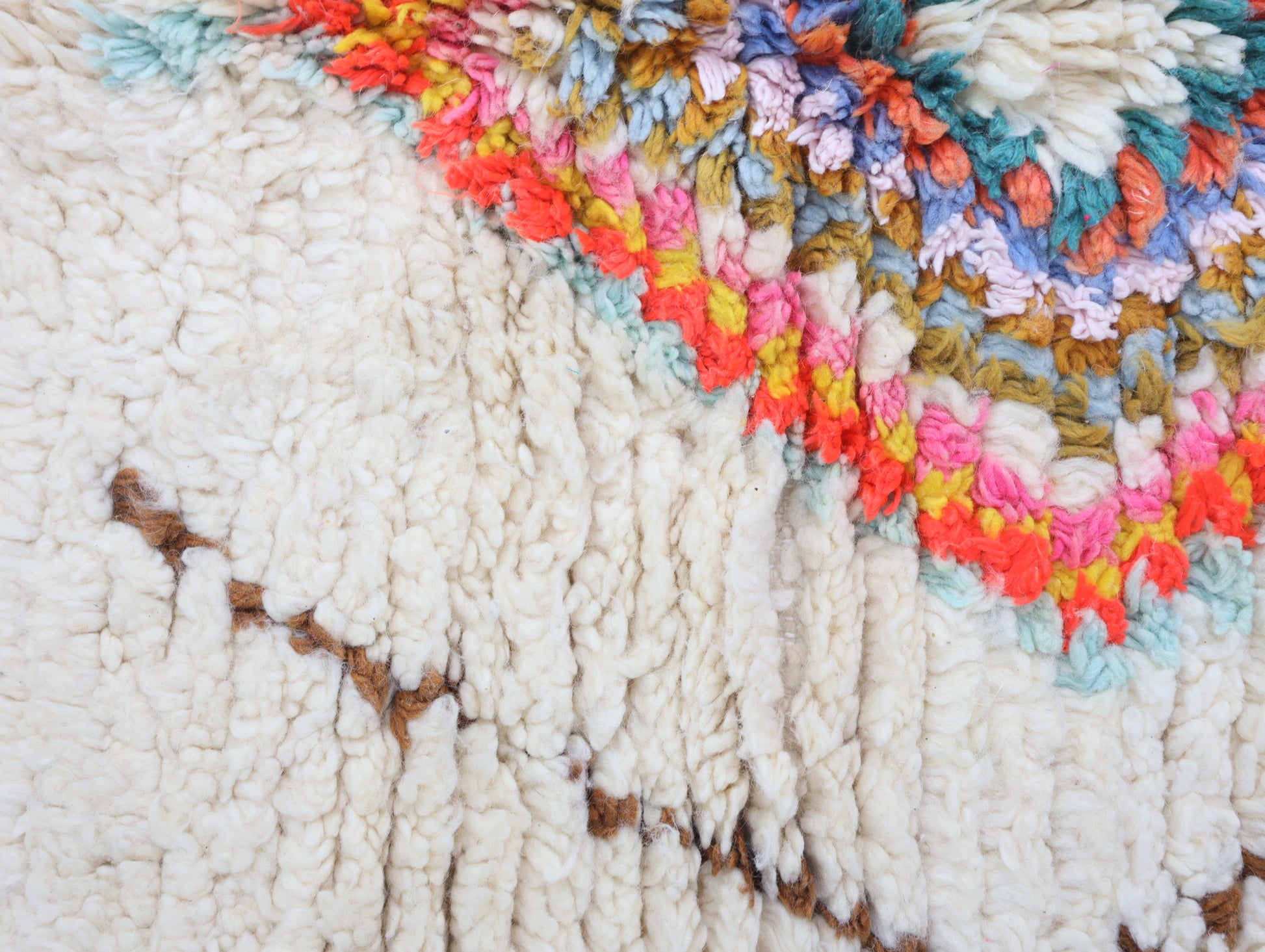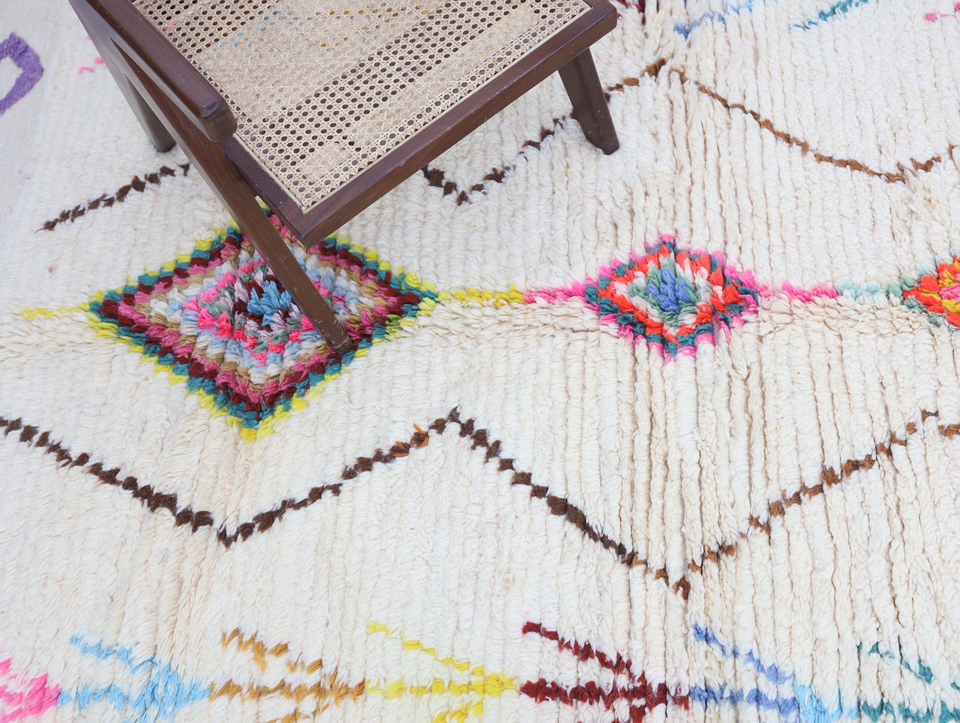 Sourced locally, Moroccan wool produces a dense, sturdy pile that feels soft and fluffy underfoot. While a touch of shedding is natural, it's a small price to pay for the cherished wild, tousled texture of the high pile—a comfort beloved for its durability, longevity, and the soft embrace it offers with every step.