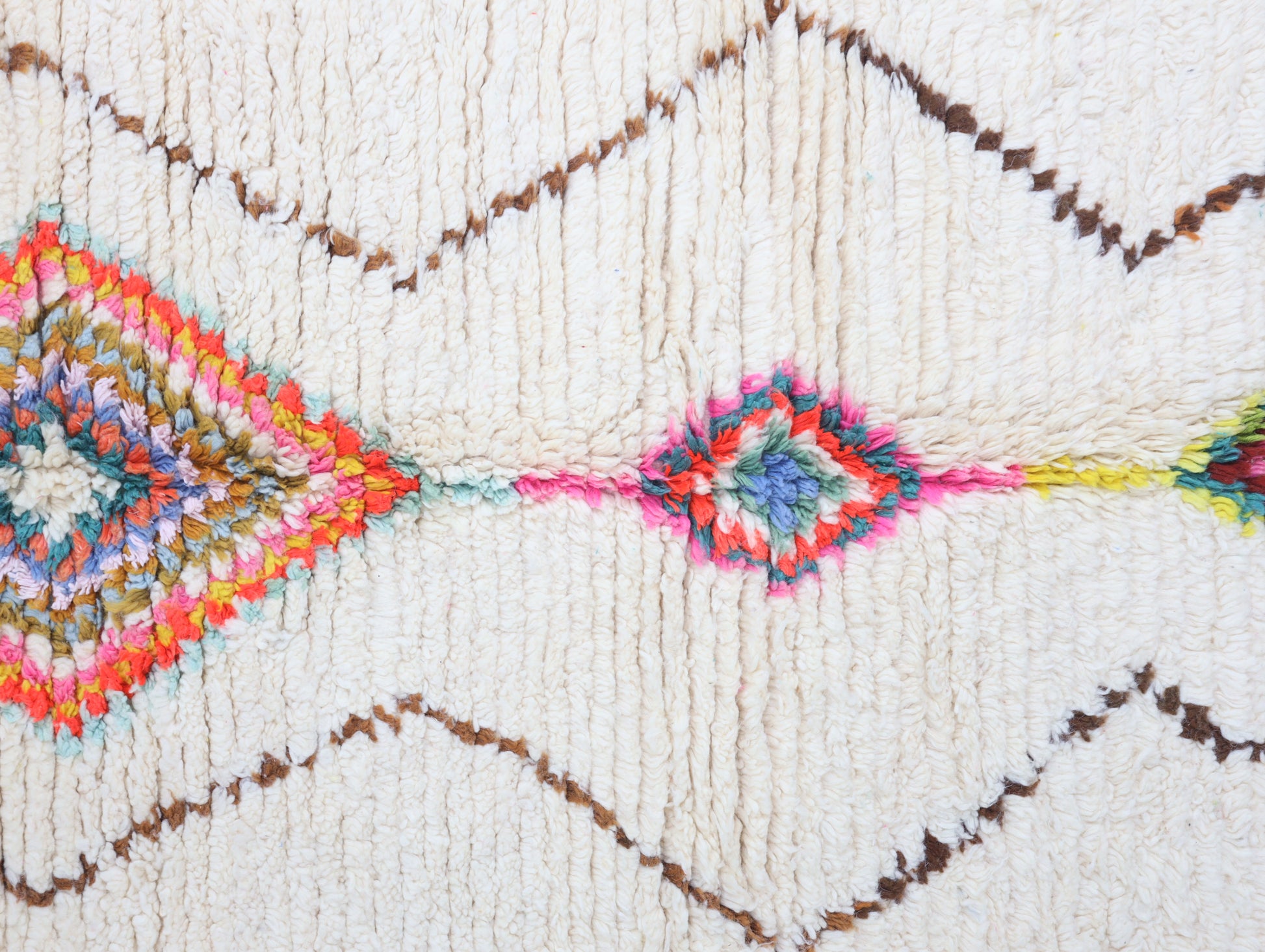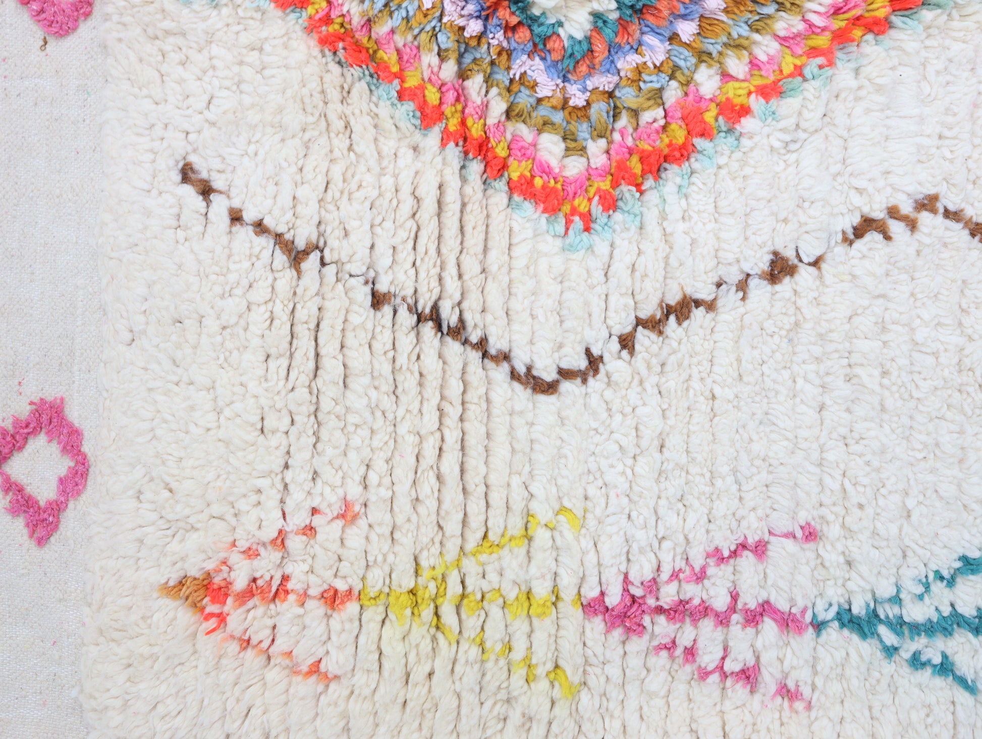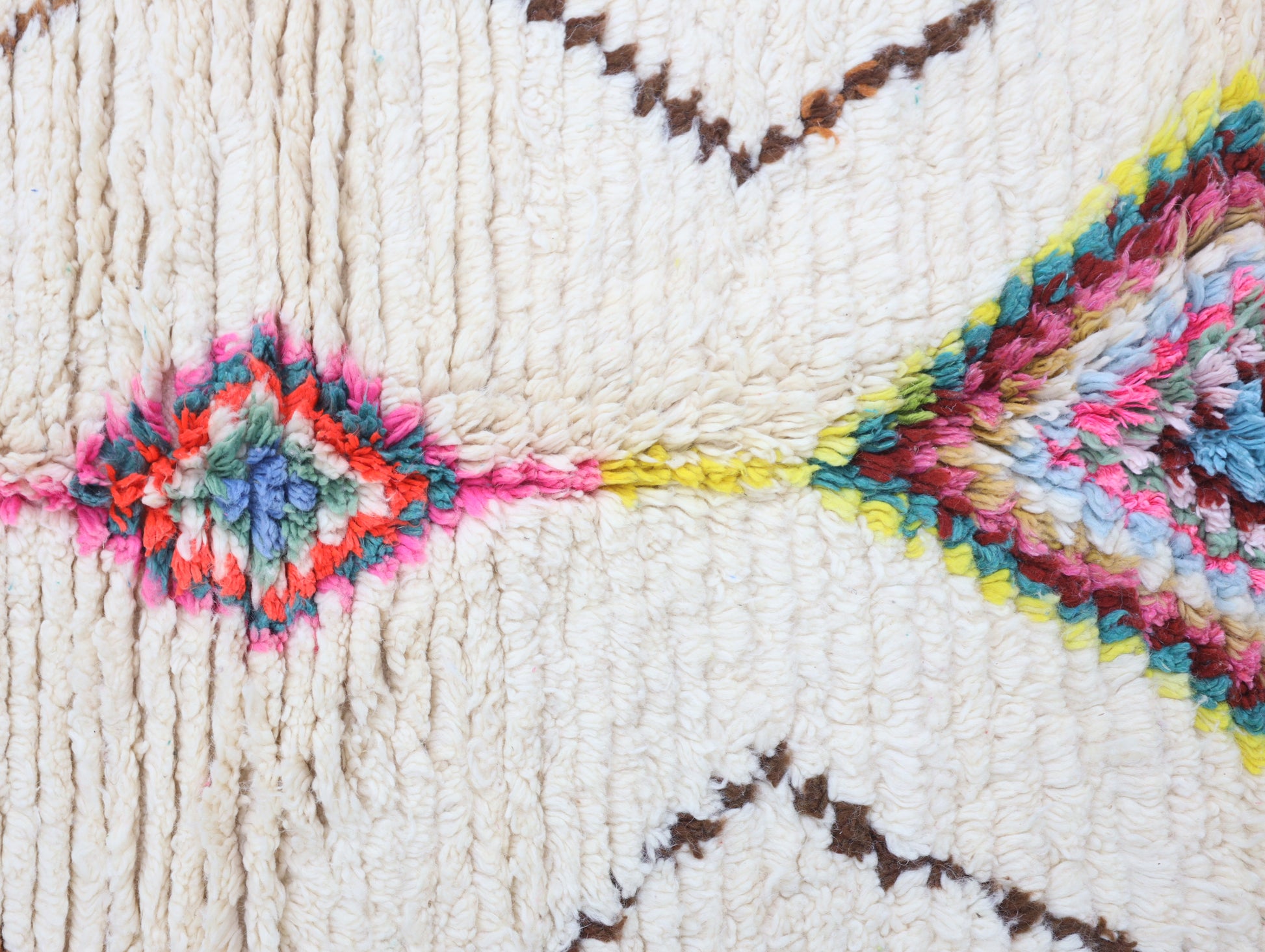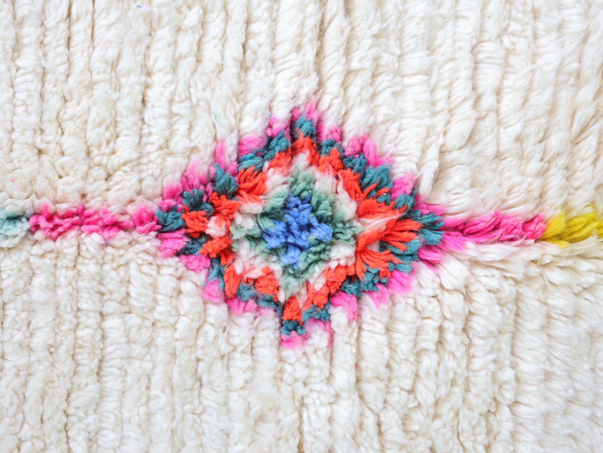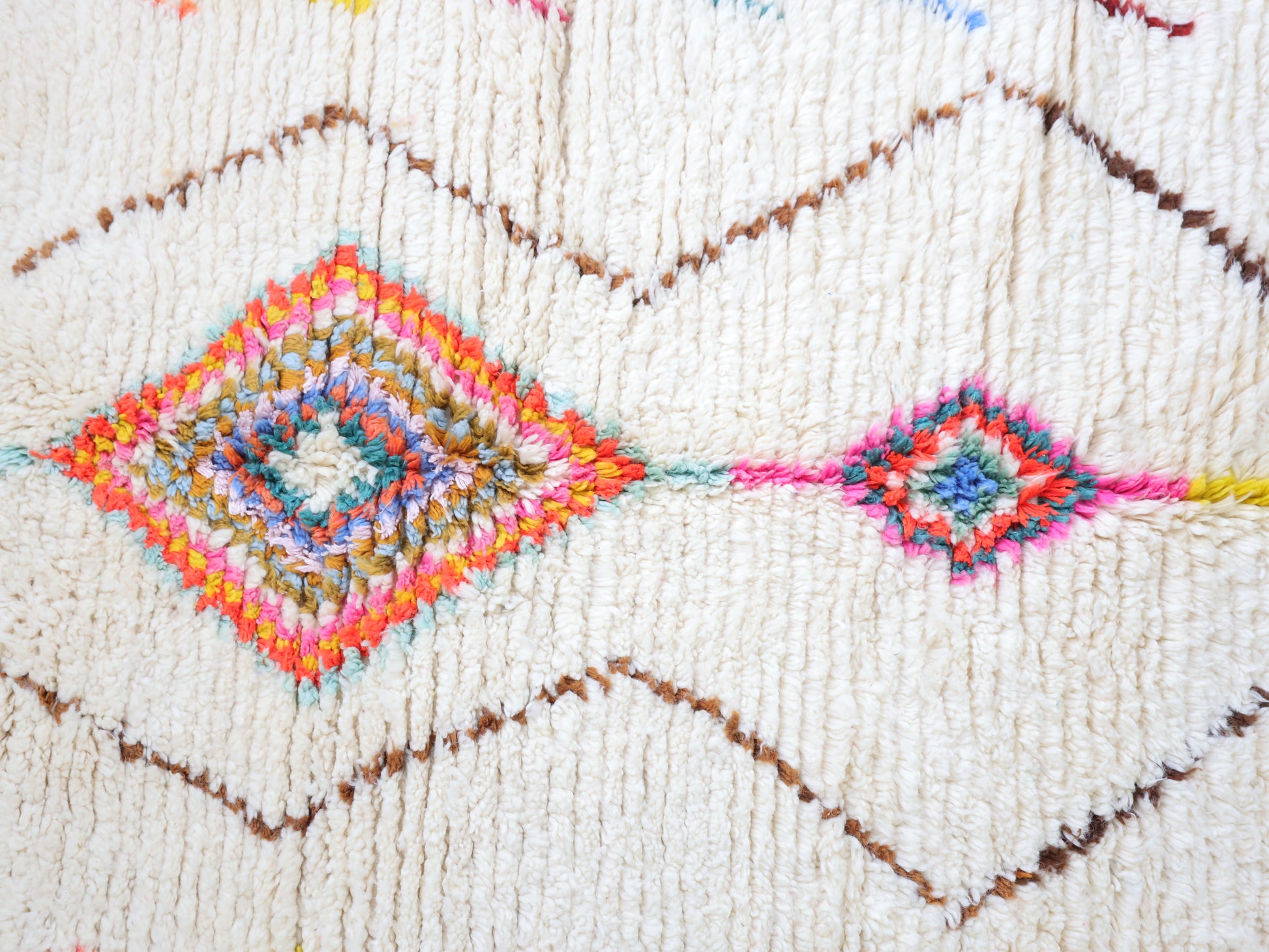 Sourced locally, Moroccan wool produces a dense, sturdy pile that feels soft and fluffy underfoot. While a touch of shedding is natural, it's a small price to pay for the cherished wild, tousled texture of the high pile—a comfort beloved for its durability, longevity, and the soft embrace it offers with every step.