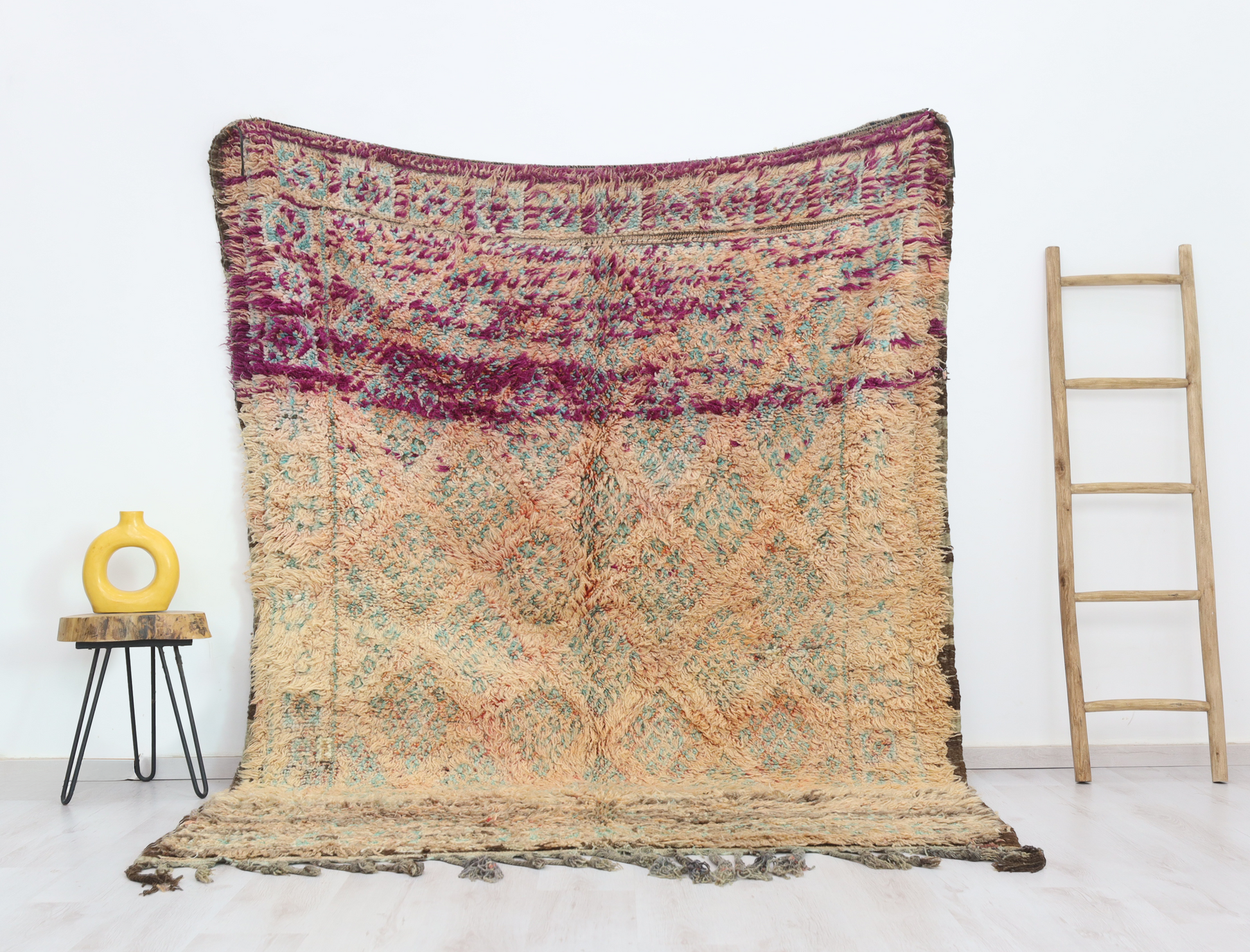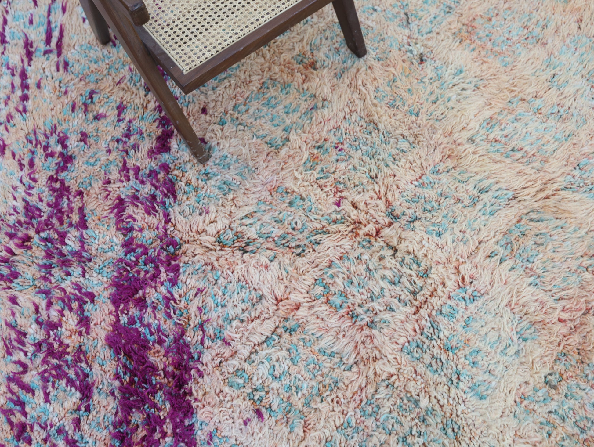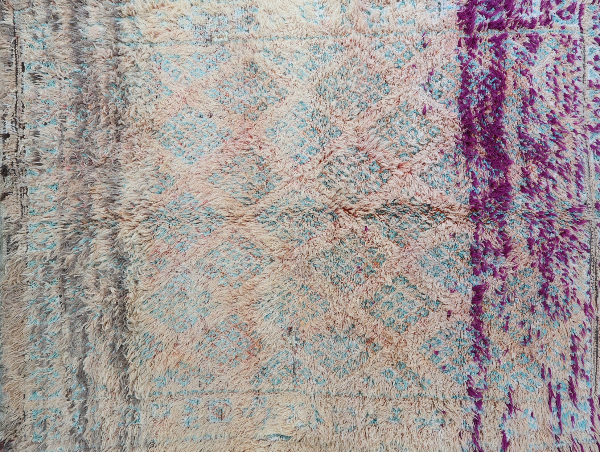 Wool, a sacred material for the Amazigh (Berber) people, forms the cornerstone of Moroccan rug design. Durable, long-lasting, and soft underfoot, wool is both functional and comfortable. In this piece, the wool pile is expertly knotted onto a wool foundation, adding substance and allowing it to gracefully embrace the floor.