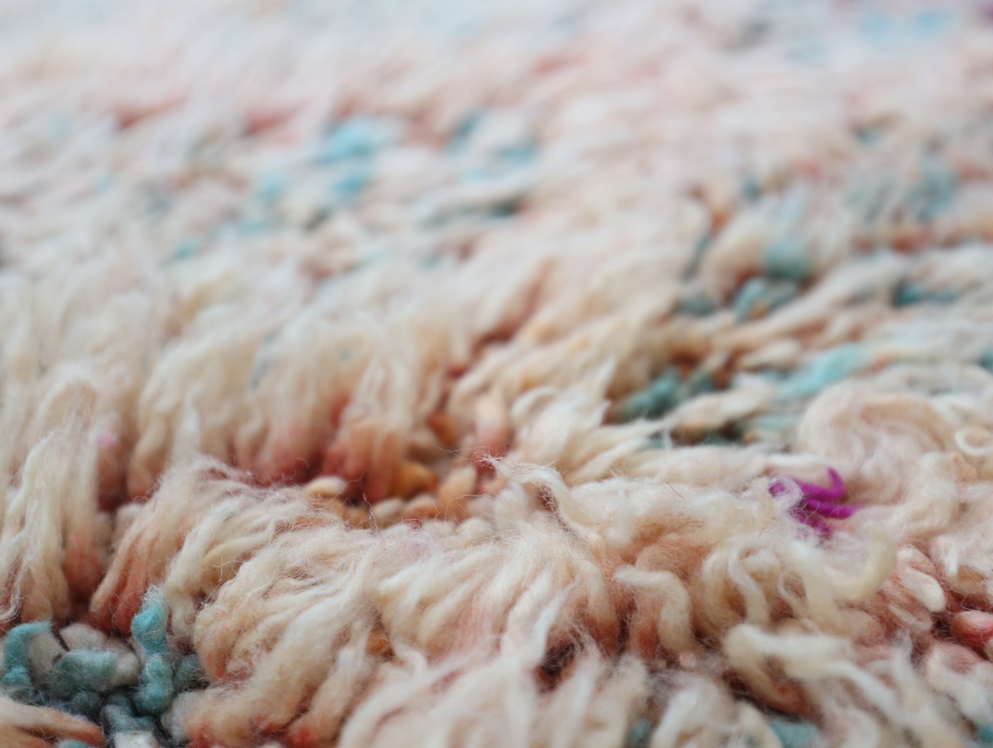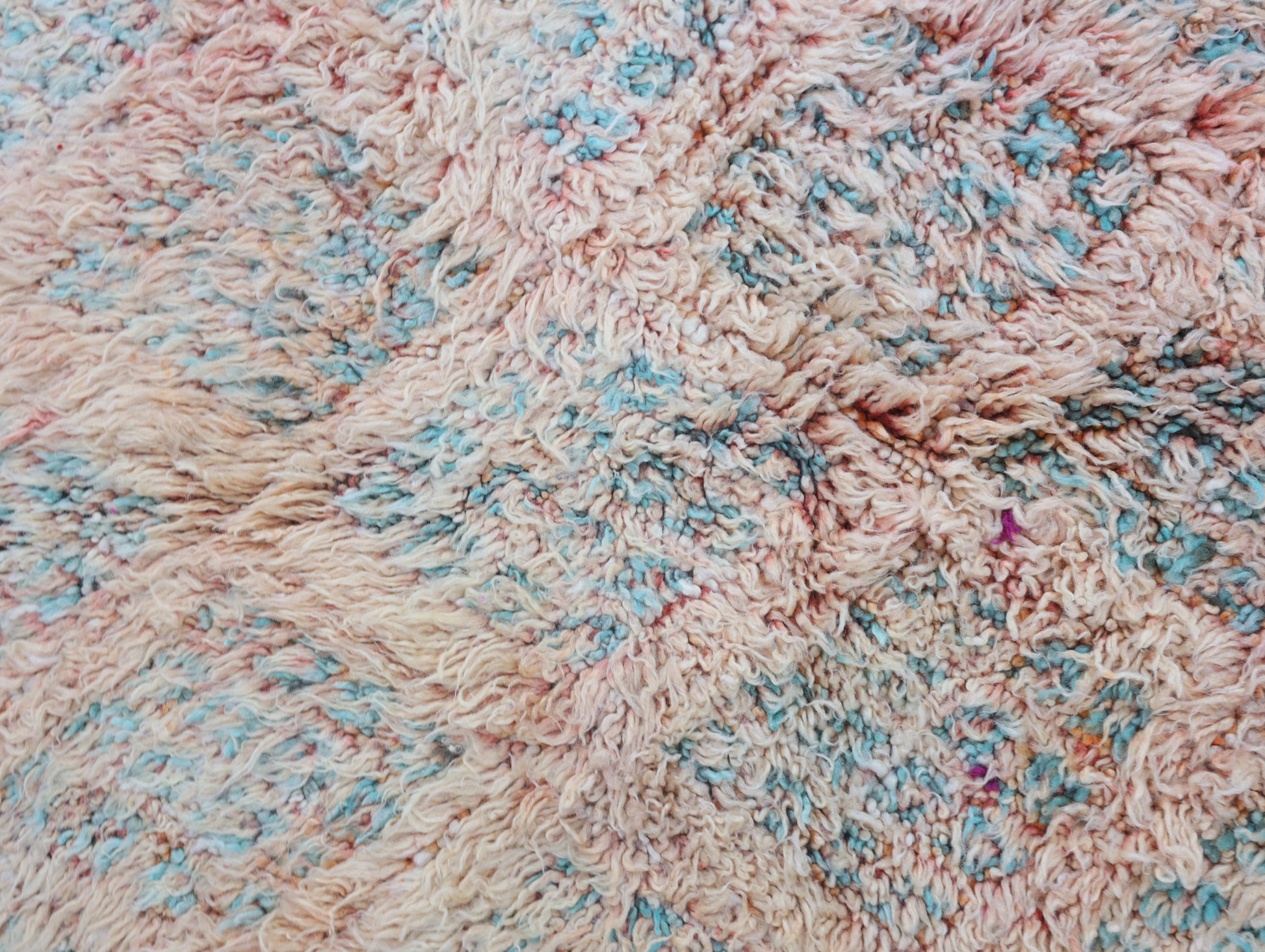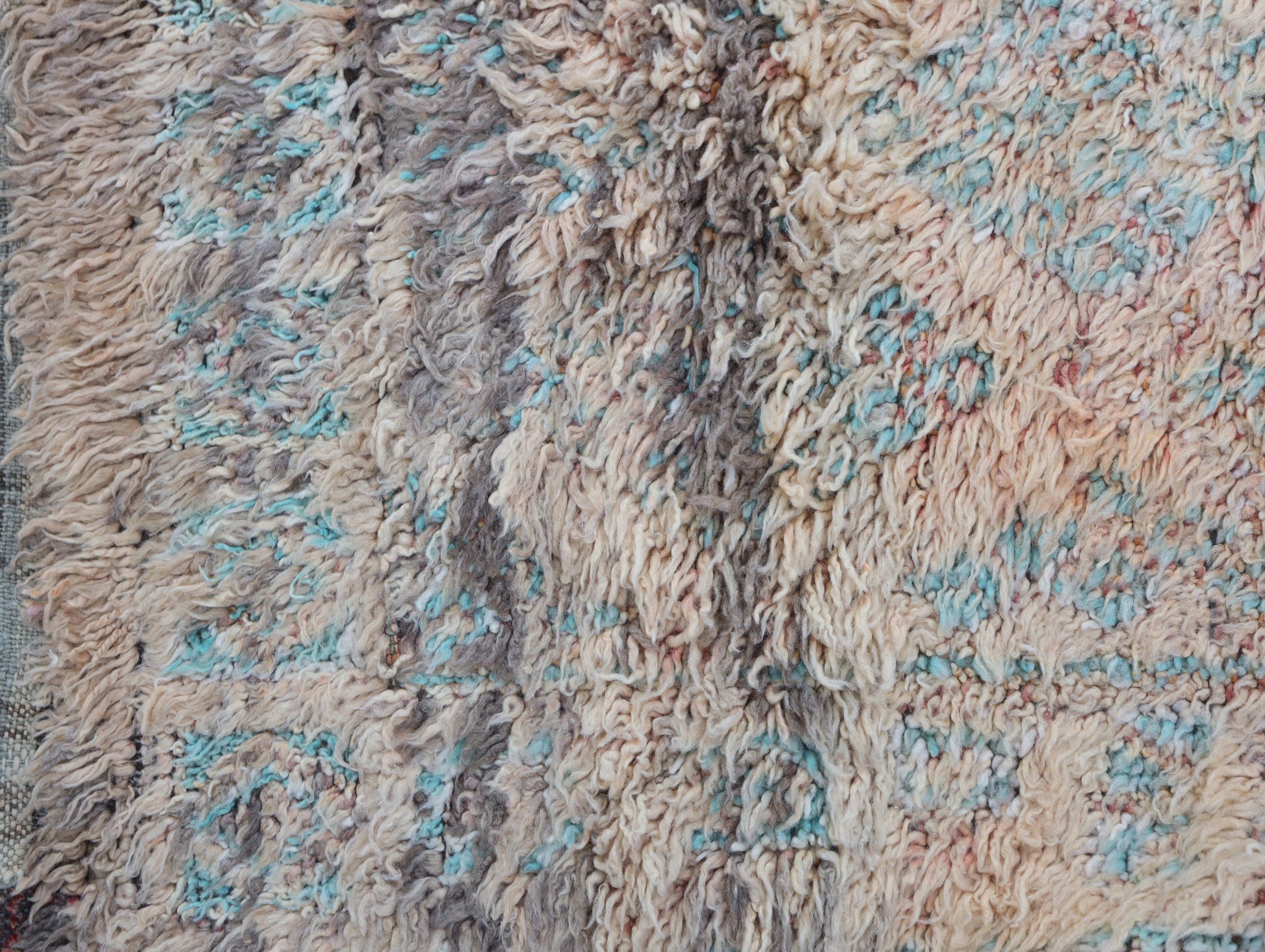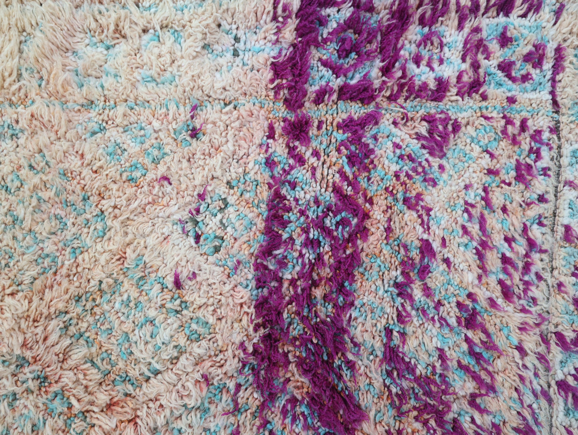 Wool, a sacred material for the Amazigh (Berber) people, forms the cornerstone of Moroccan rug design. Durable, long-lasting, and soft underfoot, wool is both functional and comfortable. In this piece, the wool pile is expertly knotted onto a wool foundation, adding substance and allowing it to gracefully embrace the floor.