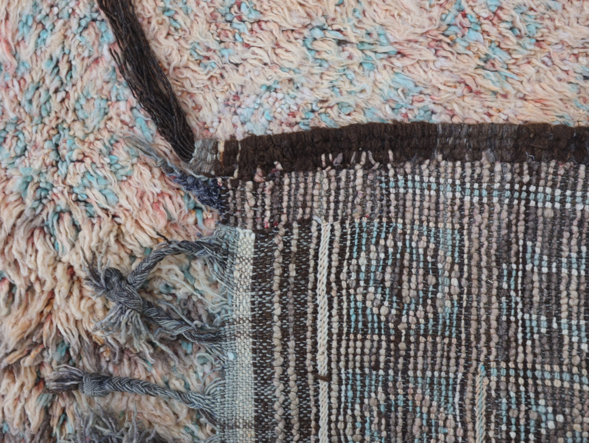 Locally sourced Moroccan wool produces a thick, strong pile with a soft feel underfoot. Having weathered time, this hand-processed wool exudes an untamed, nubby appearance, a testament to its journey through diverse environments.