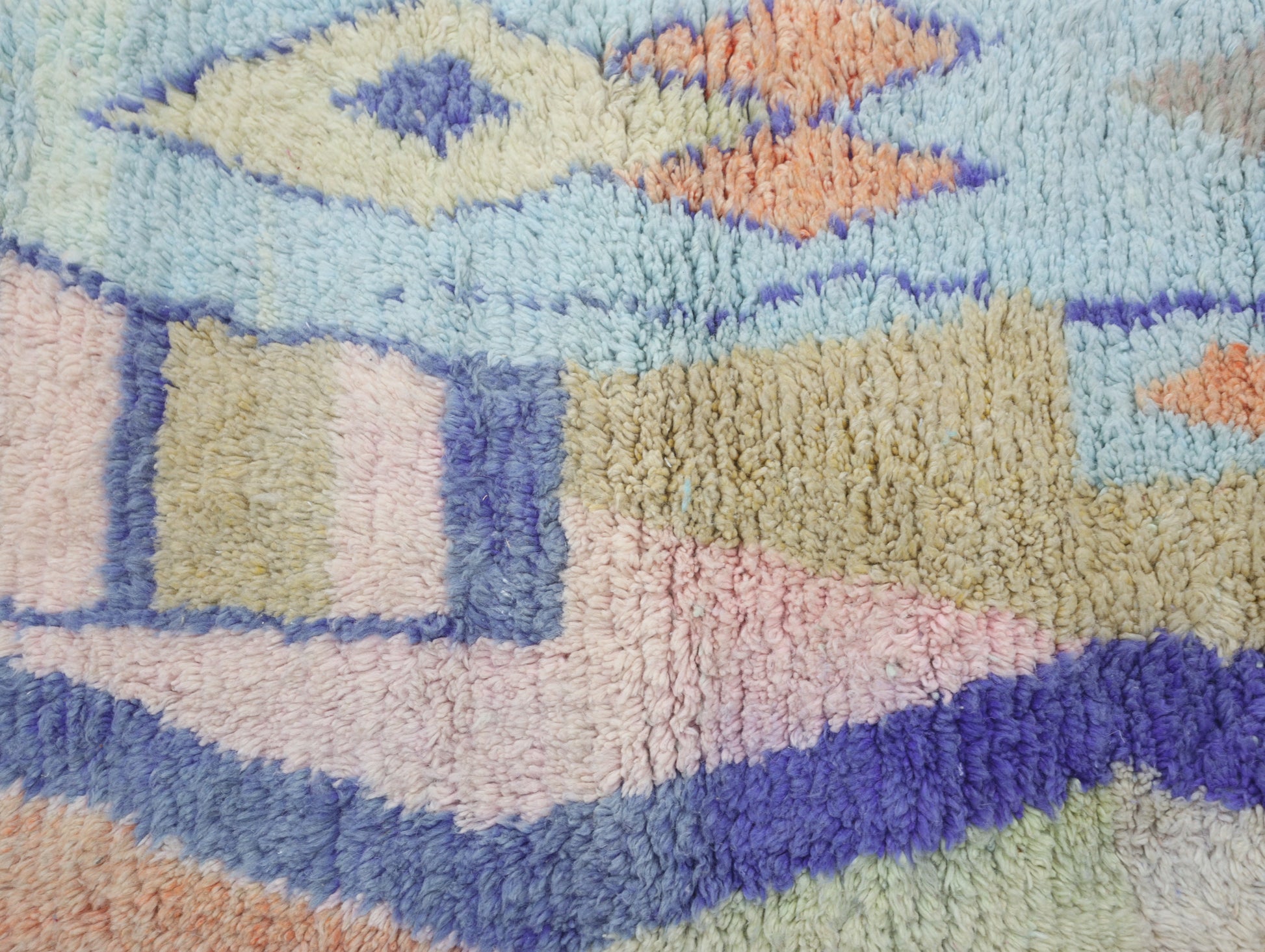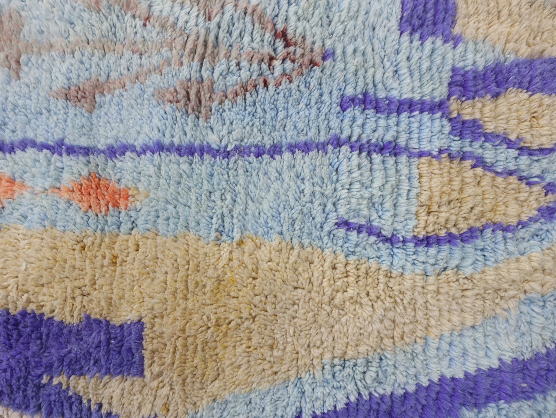 Wool, a sacred material for the Amazigh (Berber) people, forms the cornerstone of Moroccan rug design. Durable, long-lasting, and soft underfoot, wool is both functional and comfortable. In this piece, the wool pile is expertly knotted onto a wool foundation, adding substance and allowing it to gracefully embrace the floor.