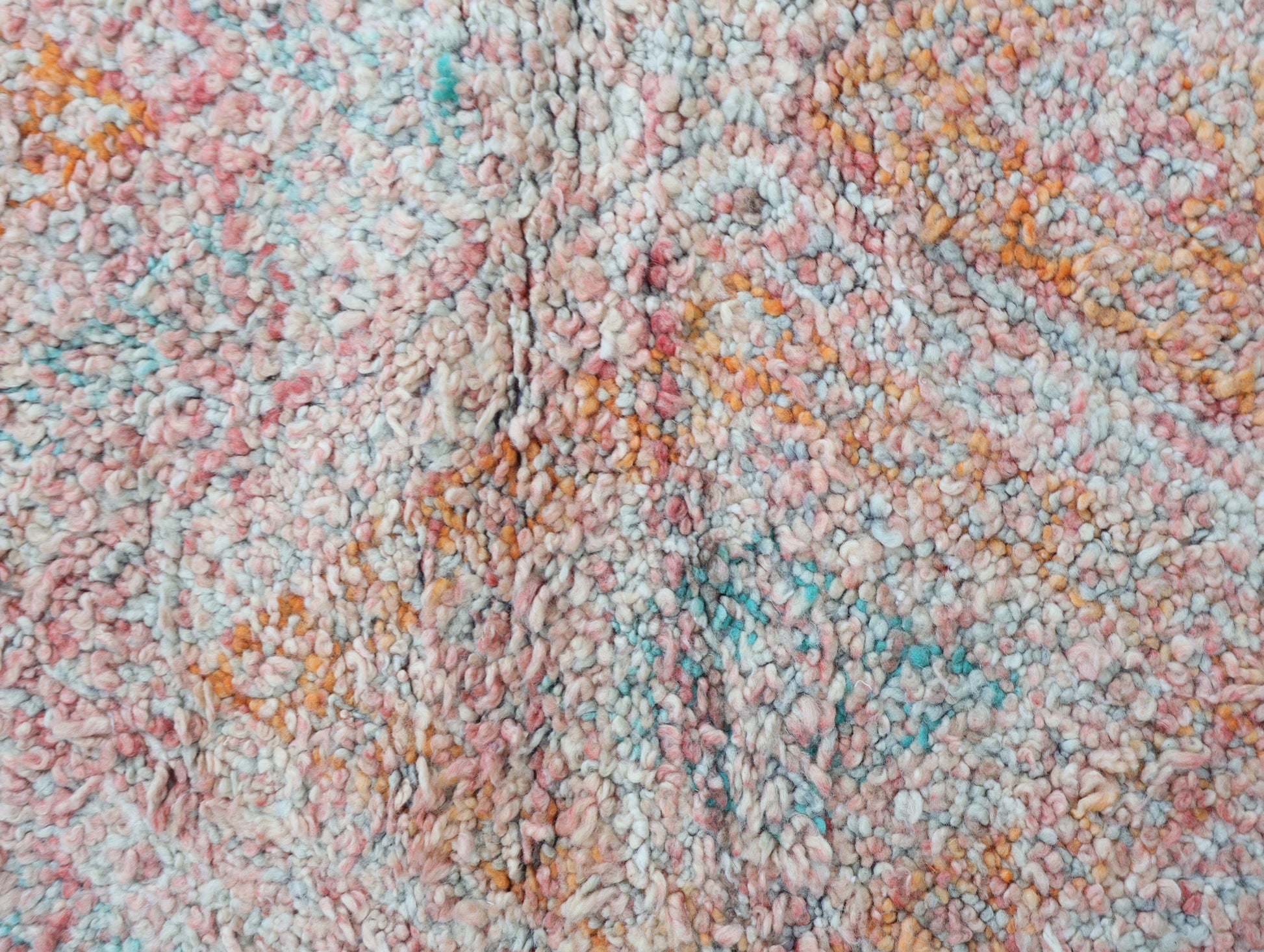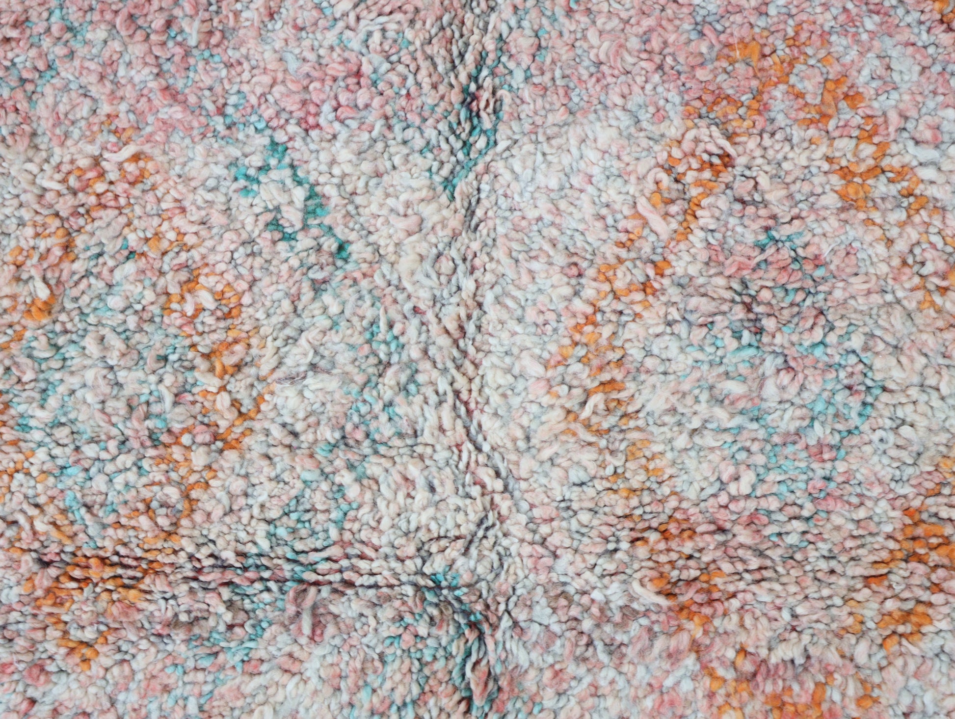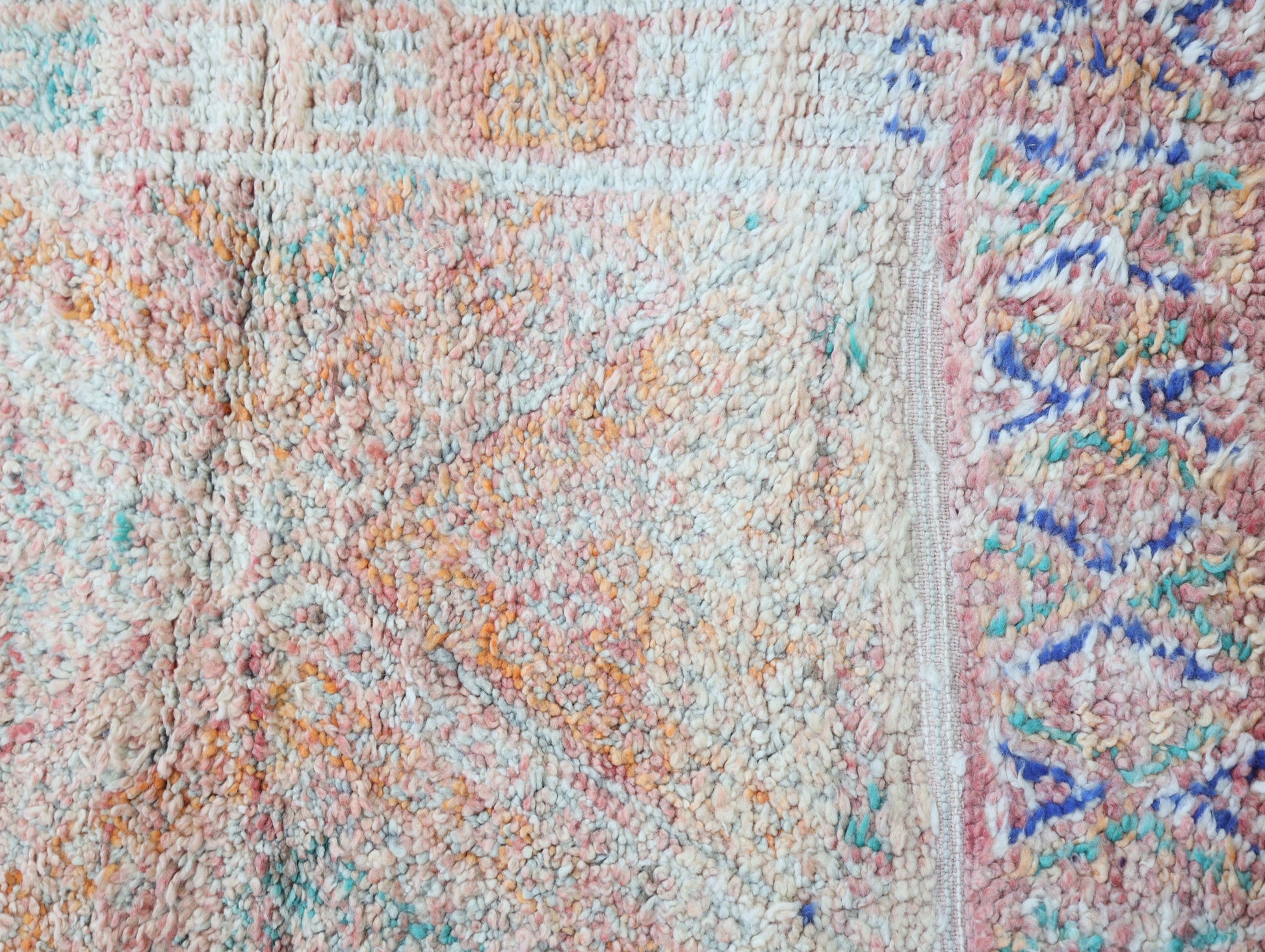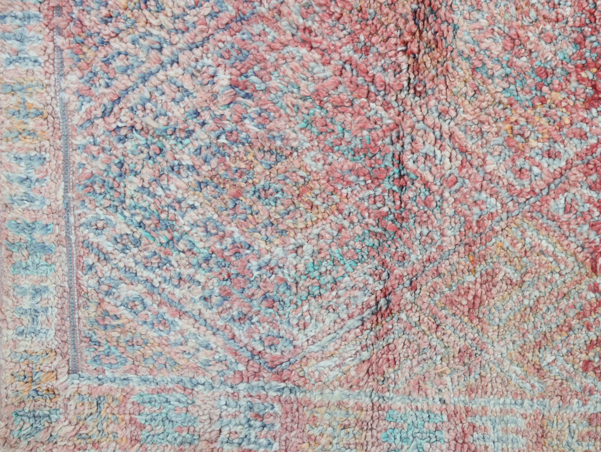 Wool, a sacred material for the Amazigh (Berber) people, forms the cornerstone of Moroccan rug design. Durable, long-lasting, and soft underfoot, wool is both functional and comfortable. In this piece, the wool pile is expertly knotted onto a wool foundation, adding substance and allowing it to gracefully embrace the floor.