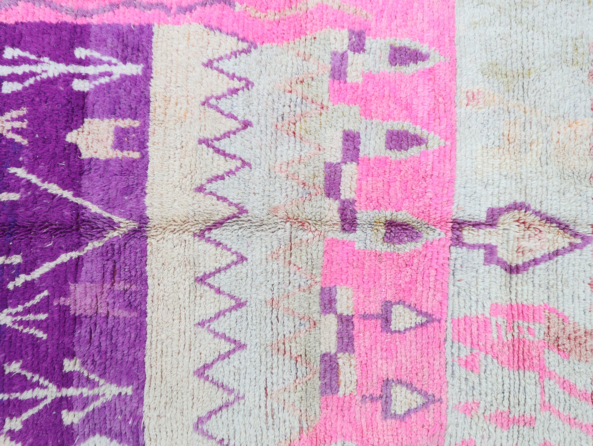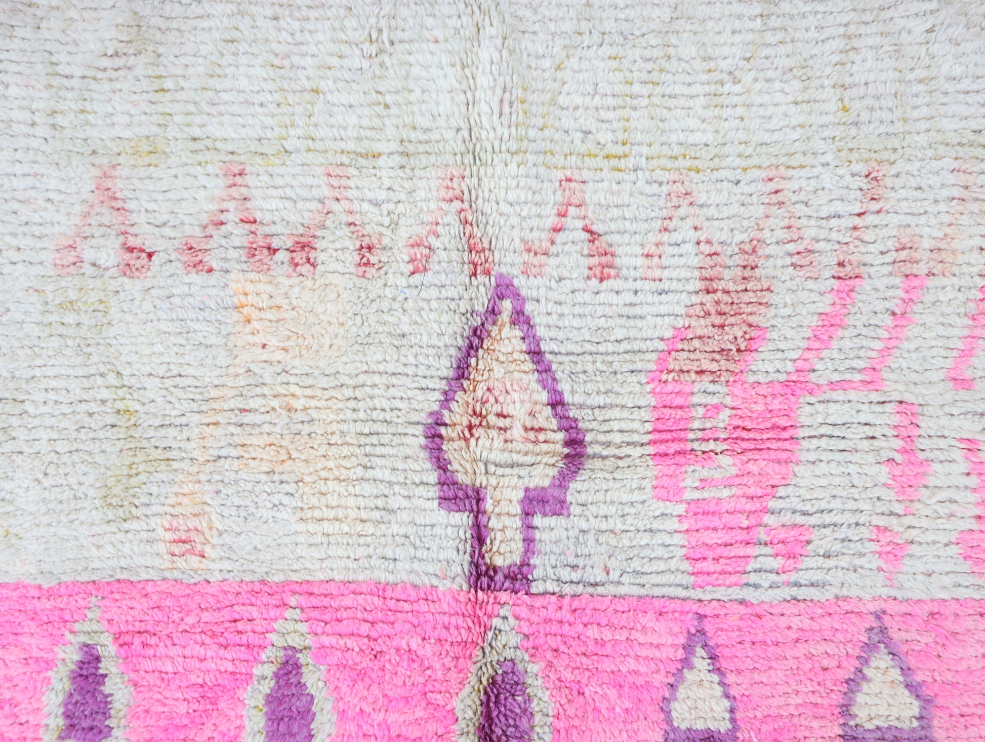 Wool, a sacred material for the Amazigh (Berber) people, forms the cornerstone of Moroccan rug design. Durable, long-lasting, and soft underfoot, wool is both functional and comfortable. In this piece, the wool pile is expertly knotted onto a wool foundation, adding substance and allowing it to gracefully embrace the floor.