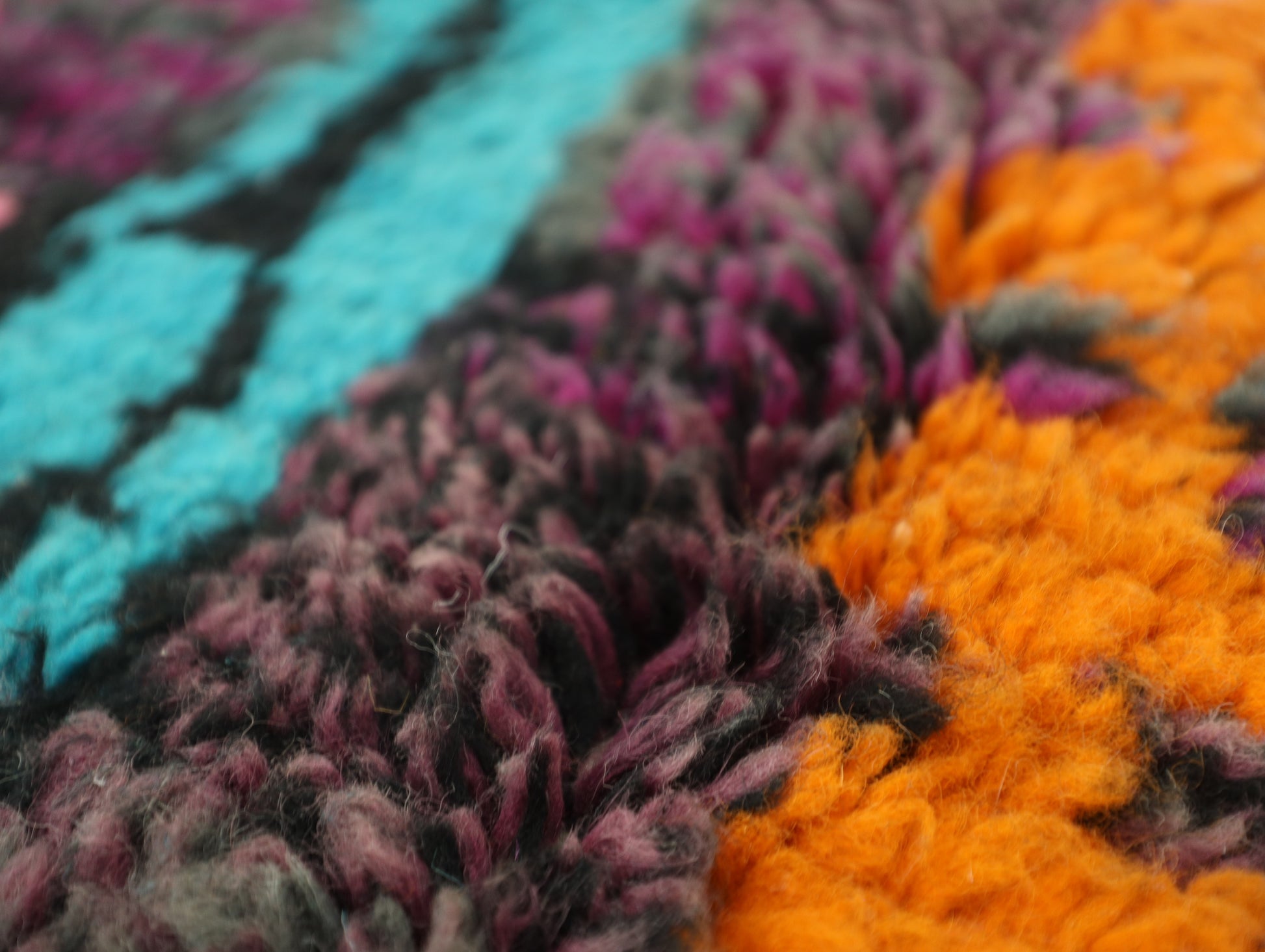 Originating in the Holy town of Boujad, these rugs, woven by diverse tribes, exhibit a wide spectrum of color, composition, and weave. Described as surreal, mystic, and mesmerizing, Boujad rugs transport us to a world beyond reality. Their construction, with twice as many horizontal as vertical knots, renders them floppy and easy to move.