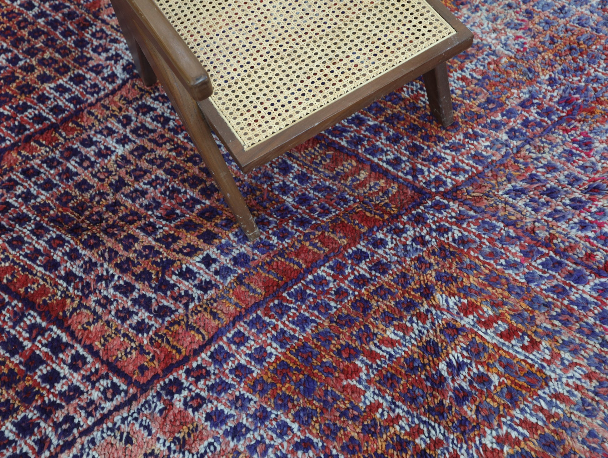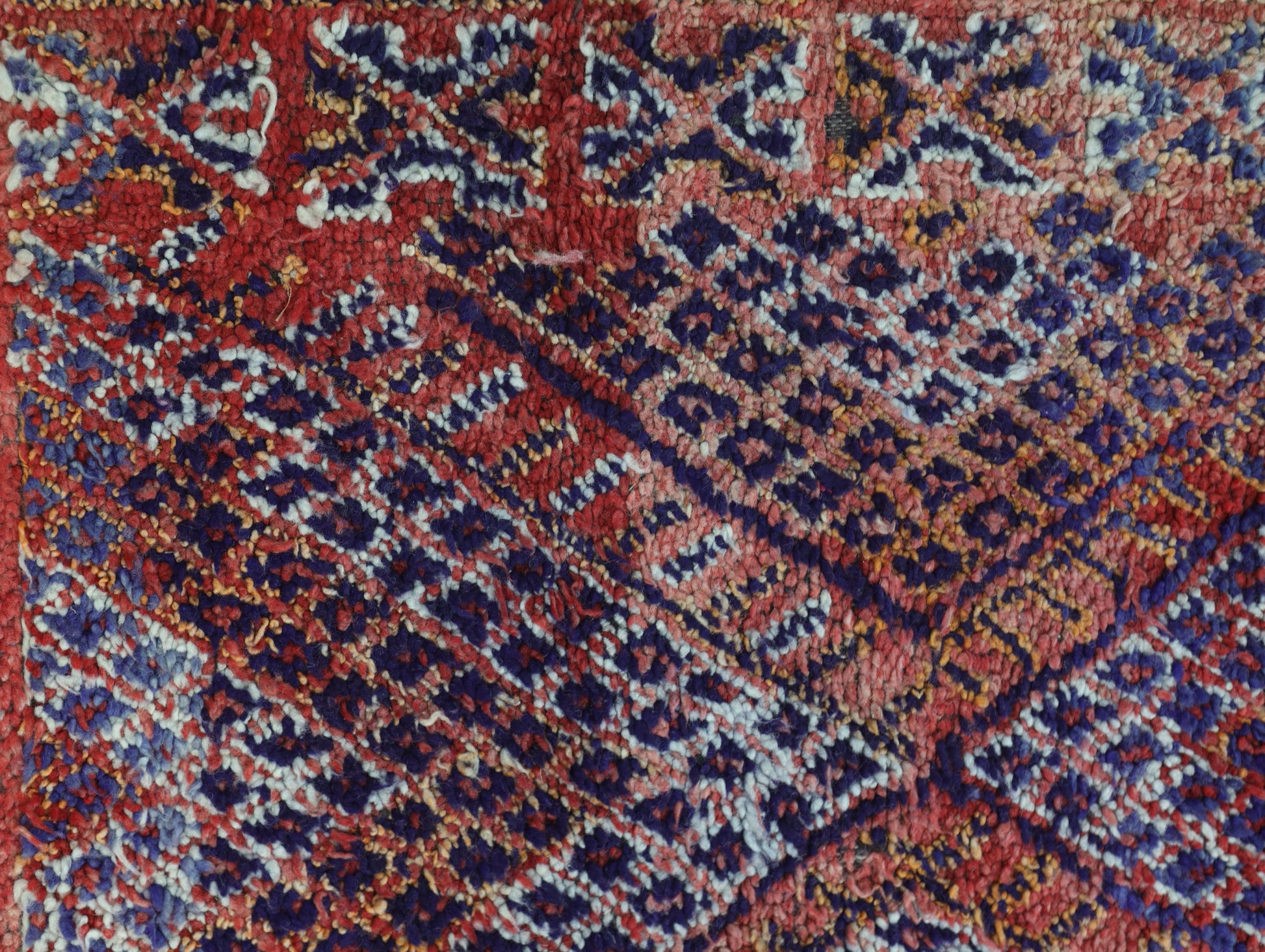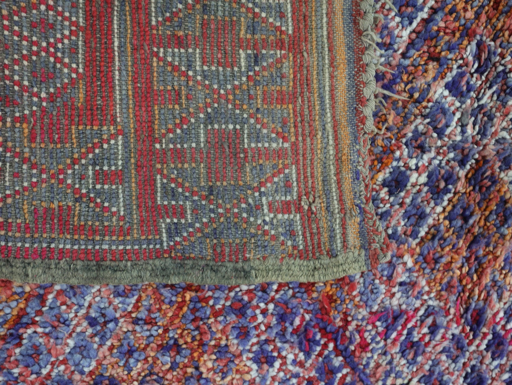 Originating in the Holy town of Boujad, these rugs, woven by diverse tribes, exhibit a wide spectrum of color, composition, and weave. Described as surreal, mystic, and mesmerizing, Boujad rugs transport us to a world beyond reality. Their construction, with twice as many horizontal as vertical knots, renders them floppy and easy to move.