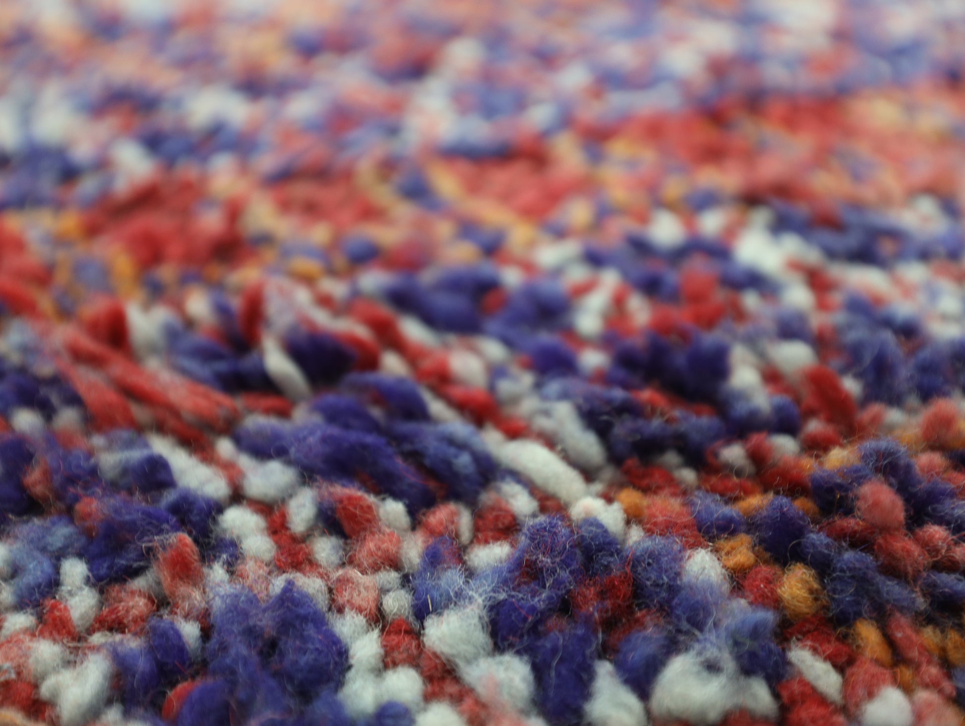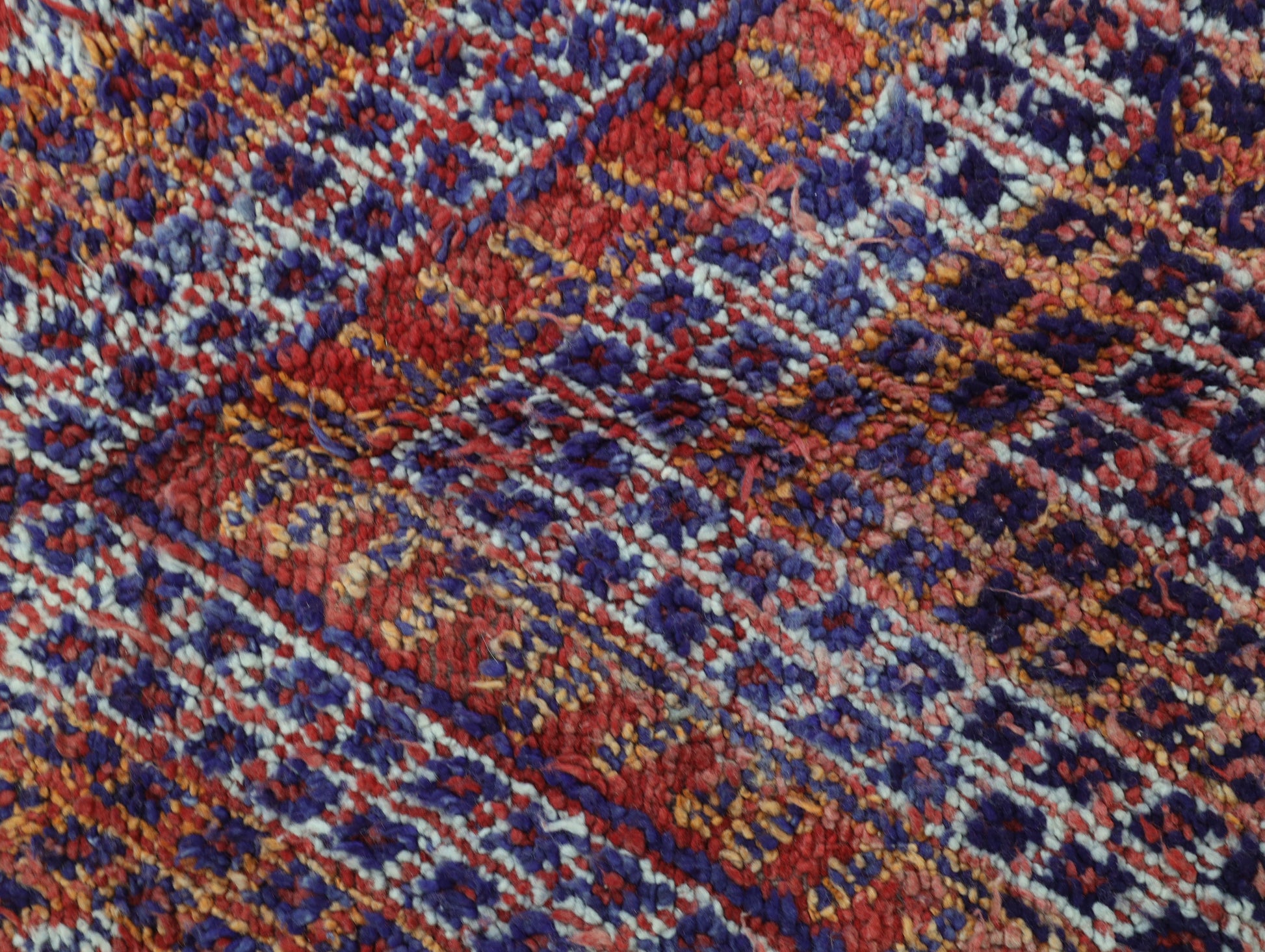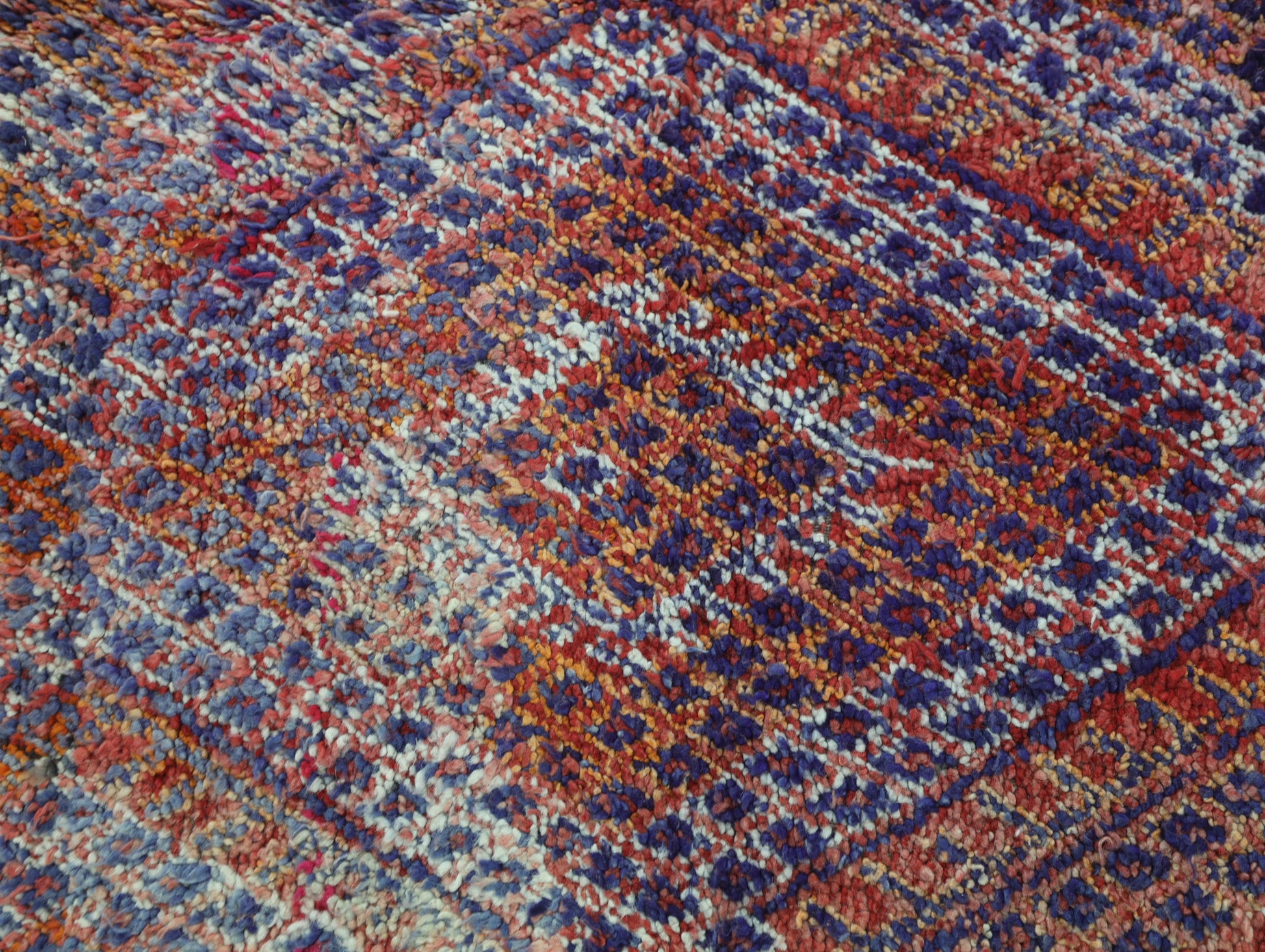 Originating in the Holy town of Boujad, these rugs, woven by diverse tribes, exhibit a wide spectrum of color, composition, and weave. Described as surreal, mystic, and mesmerizing, Boujad rugs transport us to a world beyond reality. Their construction, with twice as many horizontal as vertical knots, renders them floppy and easy to move.