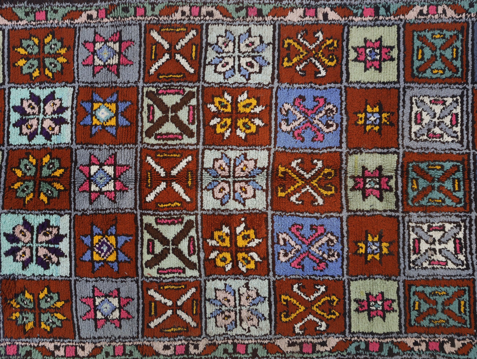 Azilal rugs boast abstract, painterly designs reminiscent of rugs from Ourika. What sets them apart is a vibrant color palette, achieved through the incorporation of cotton alongside wool..