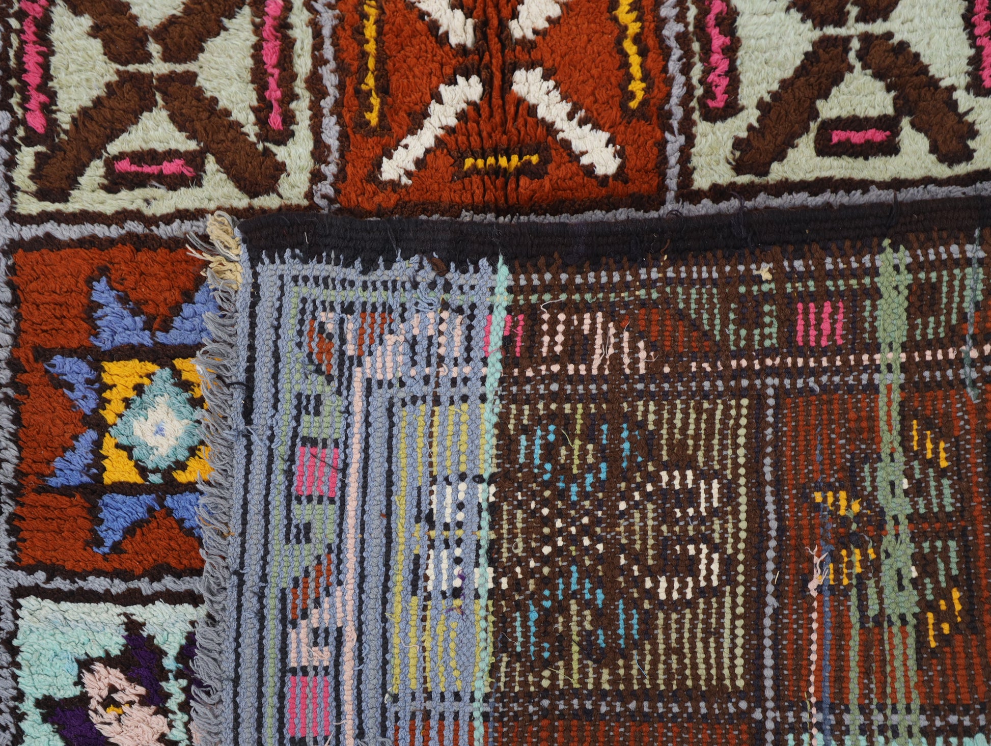 An unparalleled vintage masterpiece, carefully crafted by Berber Tribes in the Boucherouite style using upcycled textiles. Measurements: 3'6" x 7'3" (111 cm x 224 cm),