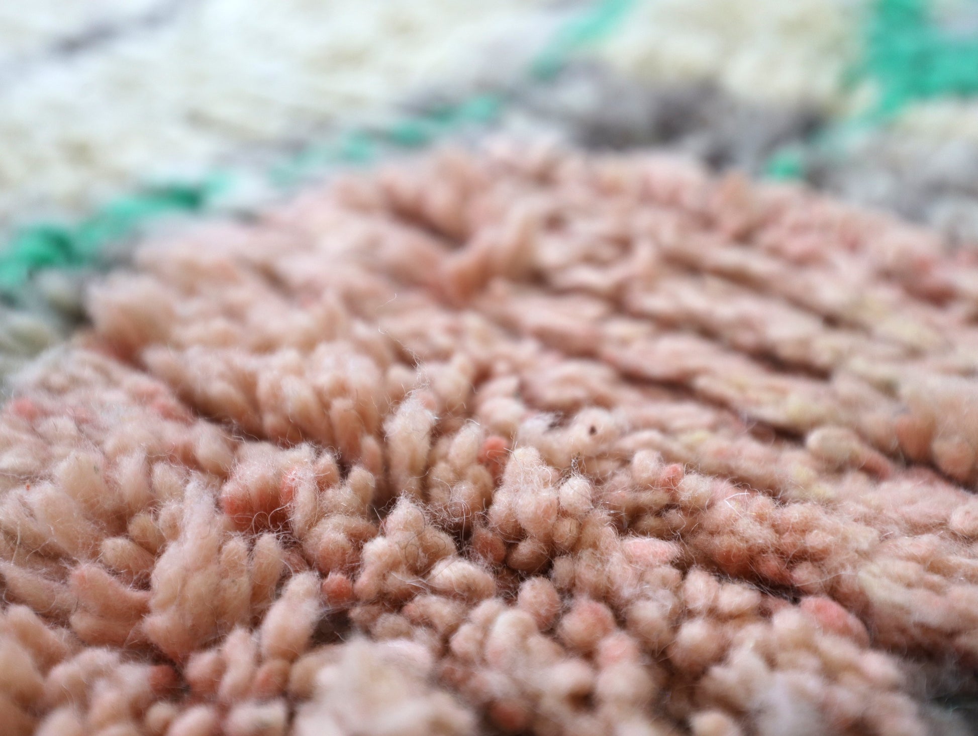 Wool, a sacred material for the Amazigh (Berber) people, forms the cornerstone of Moroccan rug design. Durable, long-lasting, and soft underfoot, wool is both functional and comfortable. In this piece, the wool pile is expertly knotted onto a wool foundation, adding substance and allowing it to gracefully embrace the floor.