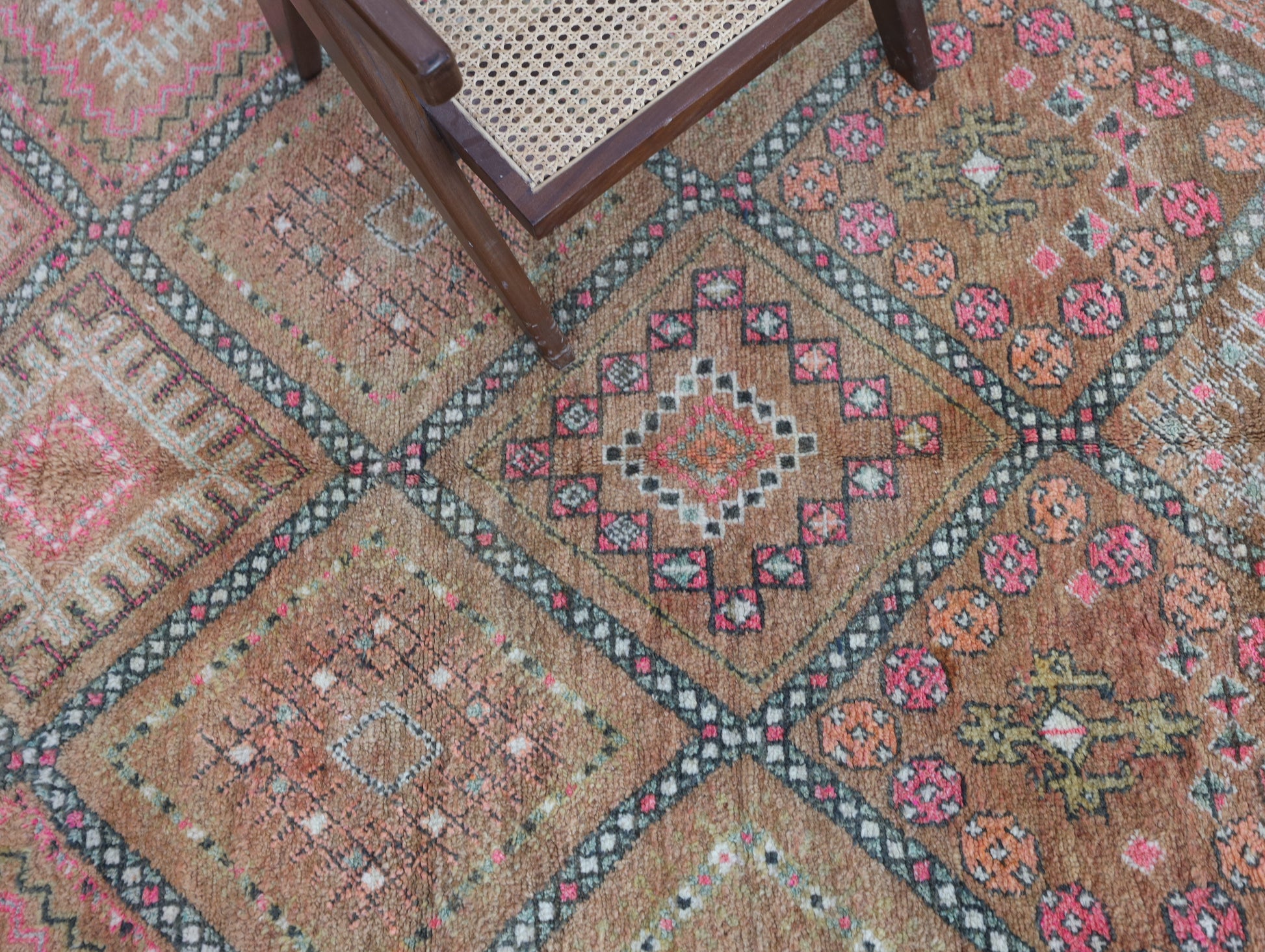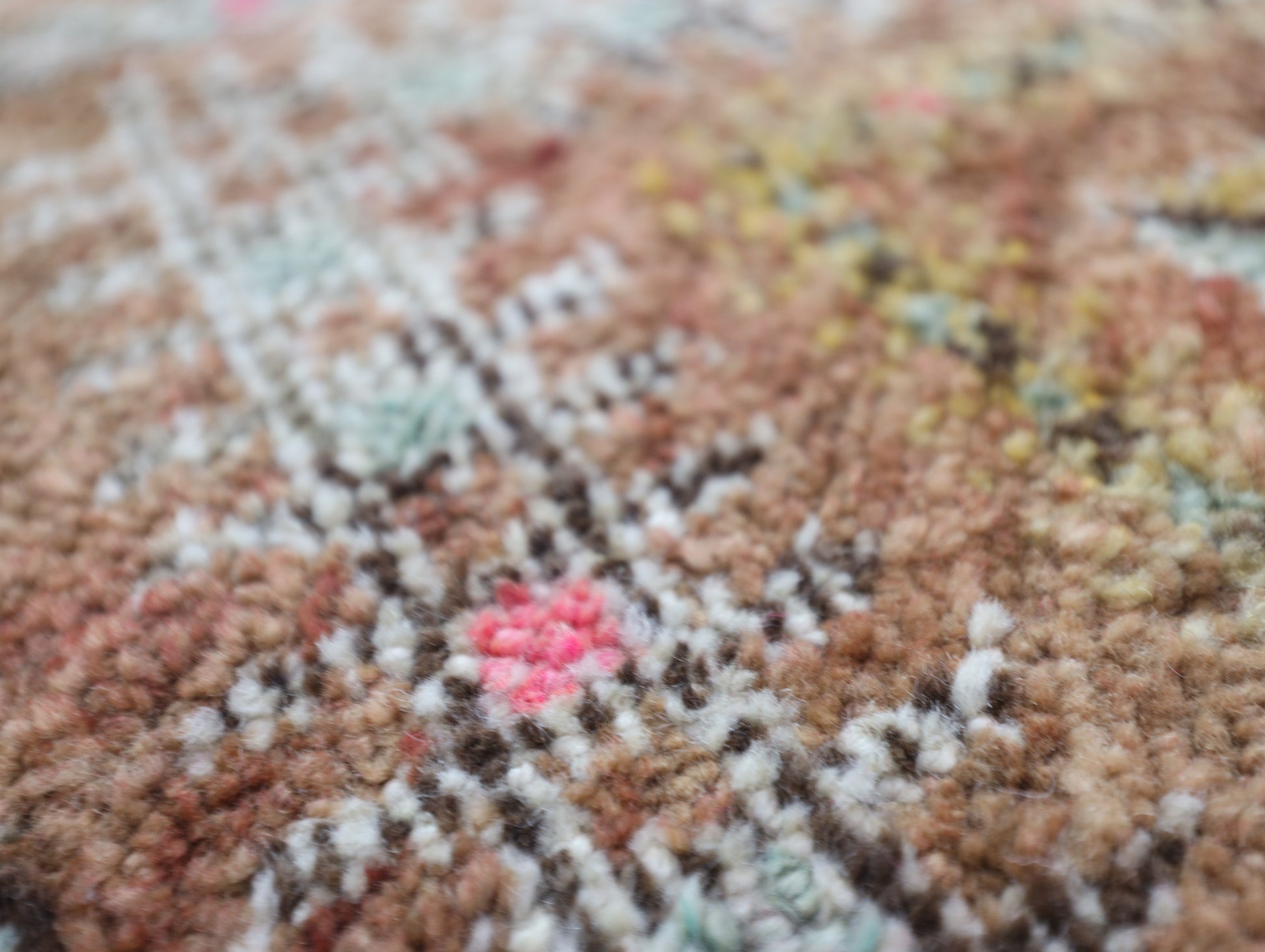 Wool, a sacred material for the Amazigh (Berber) people, forms the cornerstone of Moroccan rug design. Durable, long-lasting, and soft underfoot, wool is both functional and comfortable. In this piece, the wool pile is expertly knotted onto a wool foundation, adding substance and allowing it to gracefully embrace the floor.