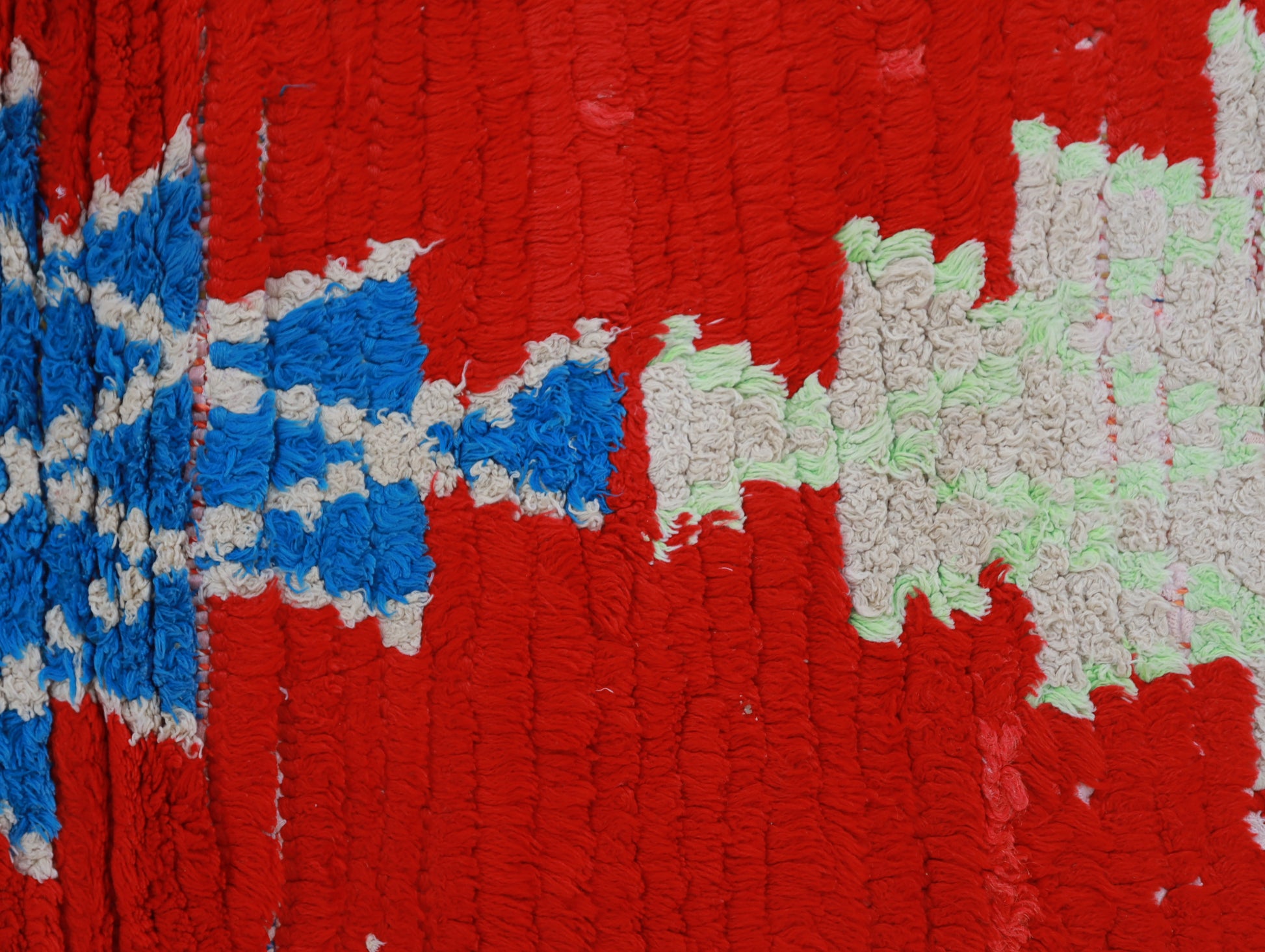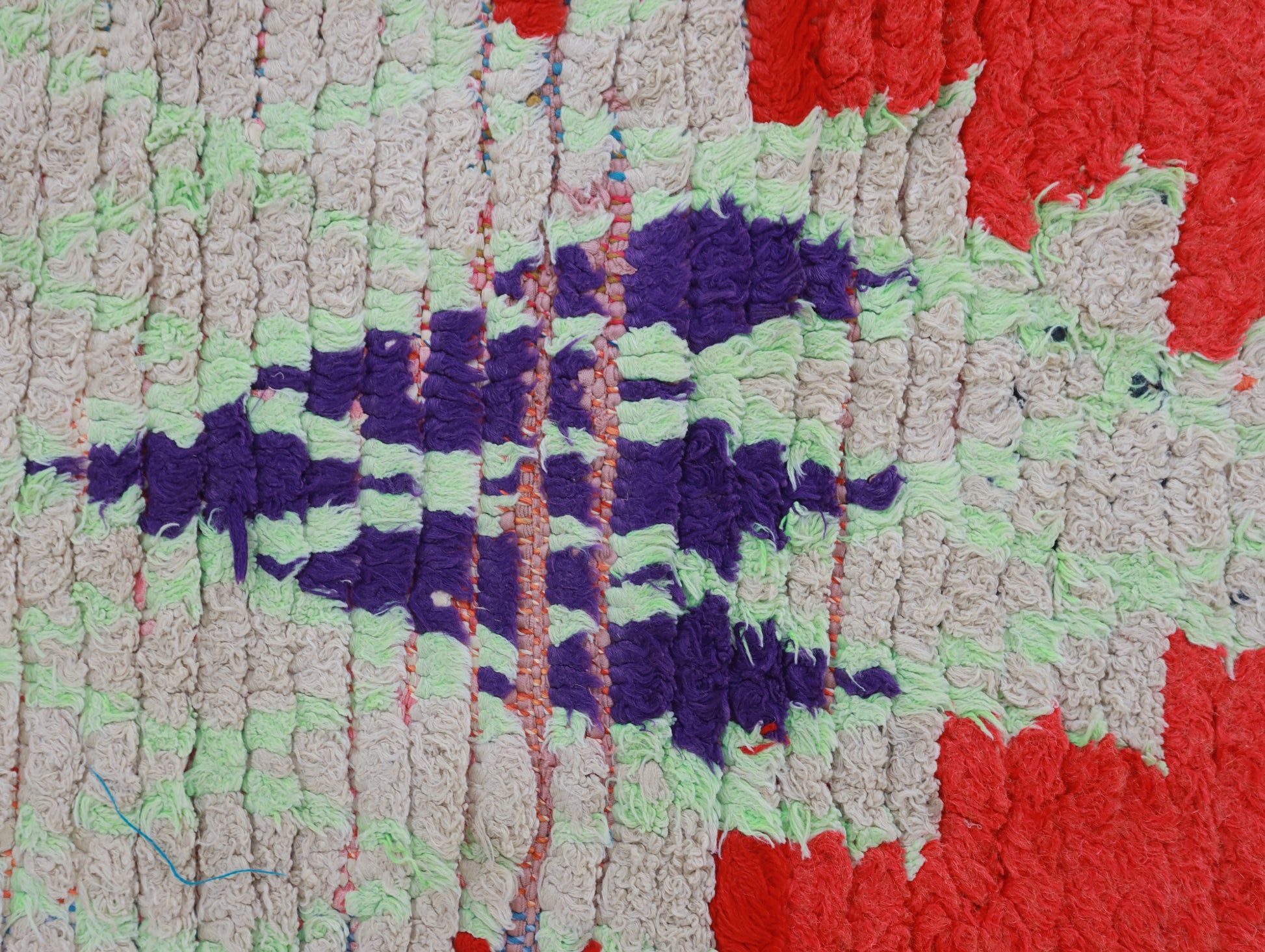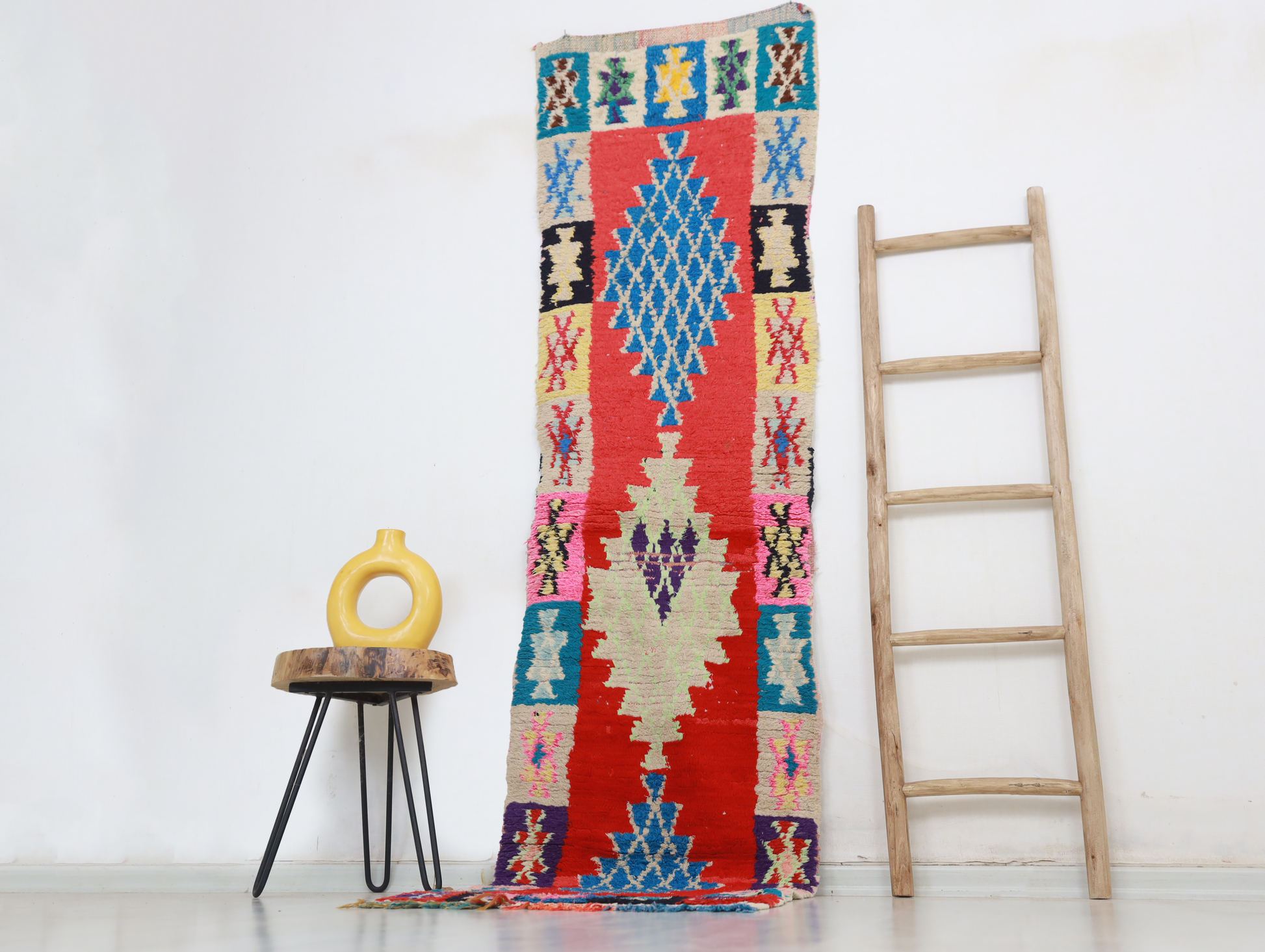 An unparalleled vintage masterpiece, carefully crafted by Berber Tribes in the Boucherouite style using upcycled textiles. Measurements: 2'3" x 8'9" (70 cm x 270 cm),