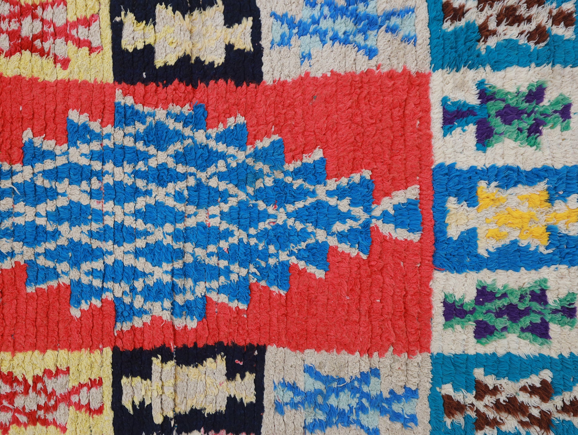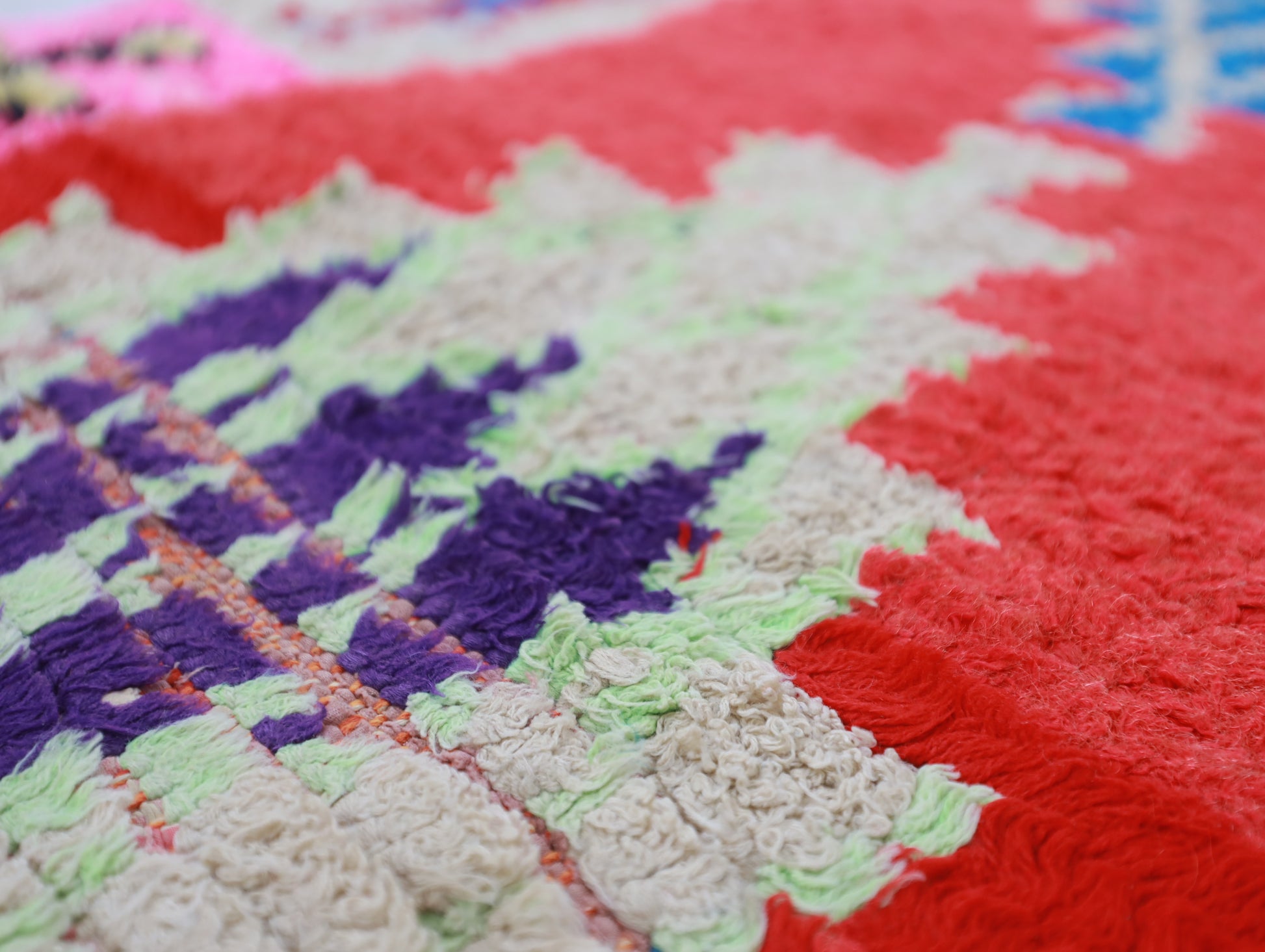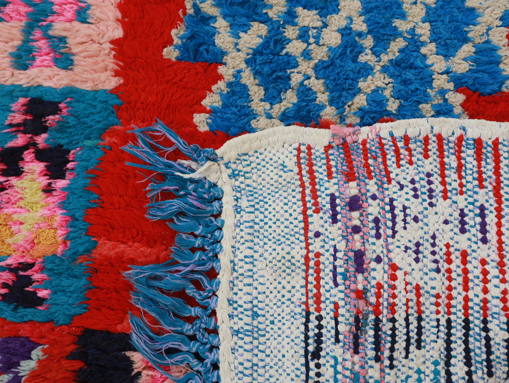 Azilal rugs boast abstract, painterly designs reminiscent of rugs from Ourika. What sets them apart is a vibrant color palette, achieved through the incorporation of cotton alongside wool..