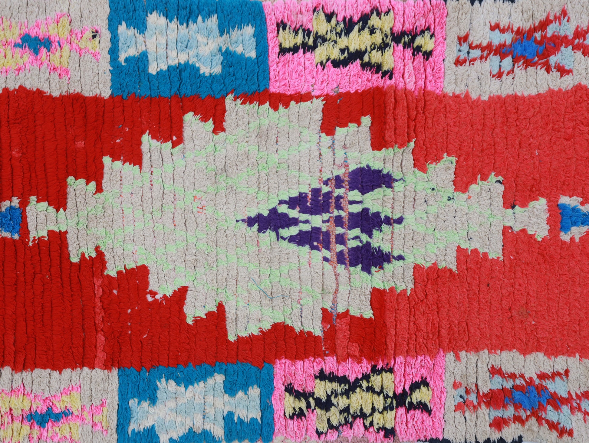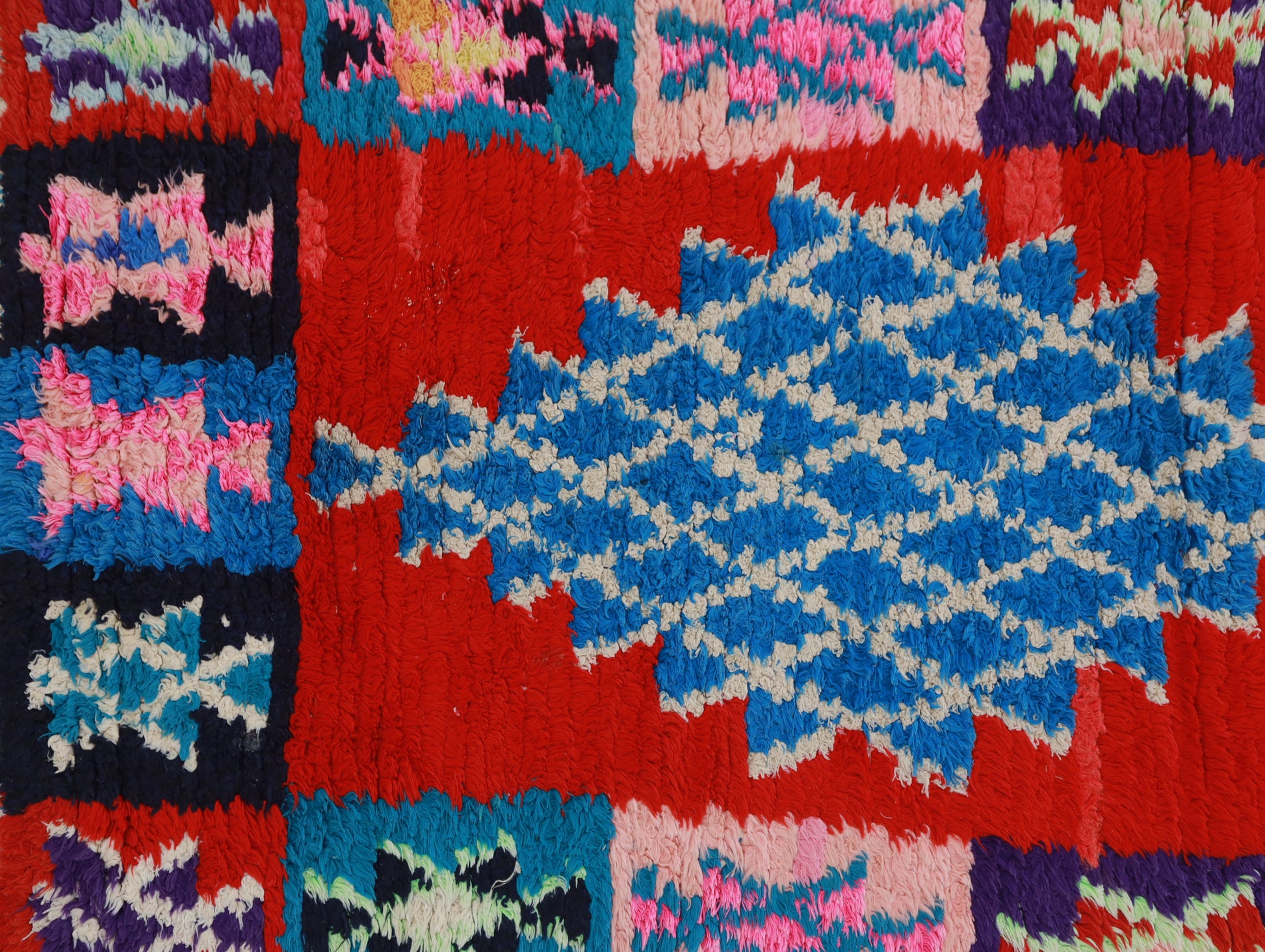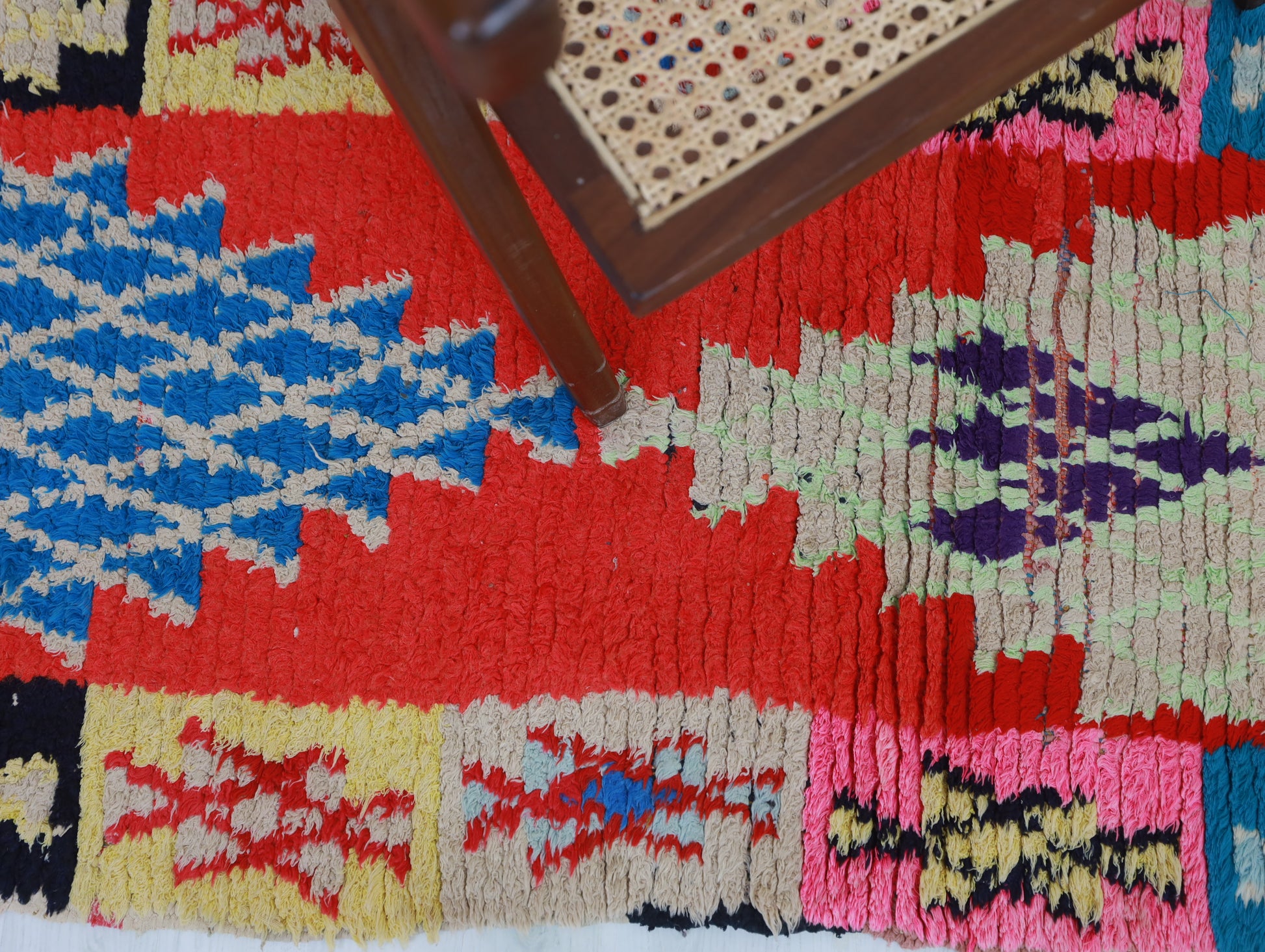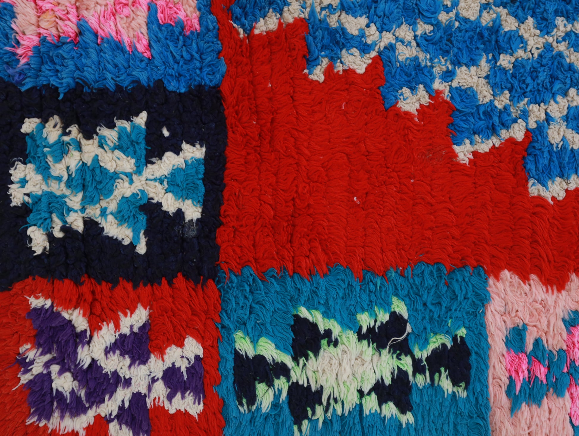 Azilal rugs boast abstract, painterly designs reminiscent of rugs from Ourika. What sets them apart is a vibrant color palette, achieved through the incorporation of cotton alongside wool..