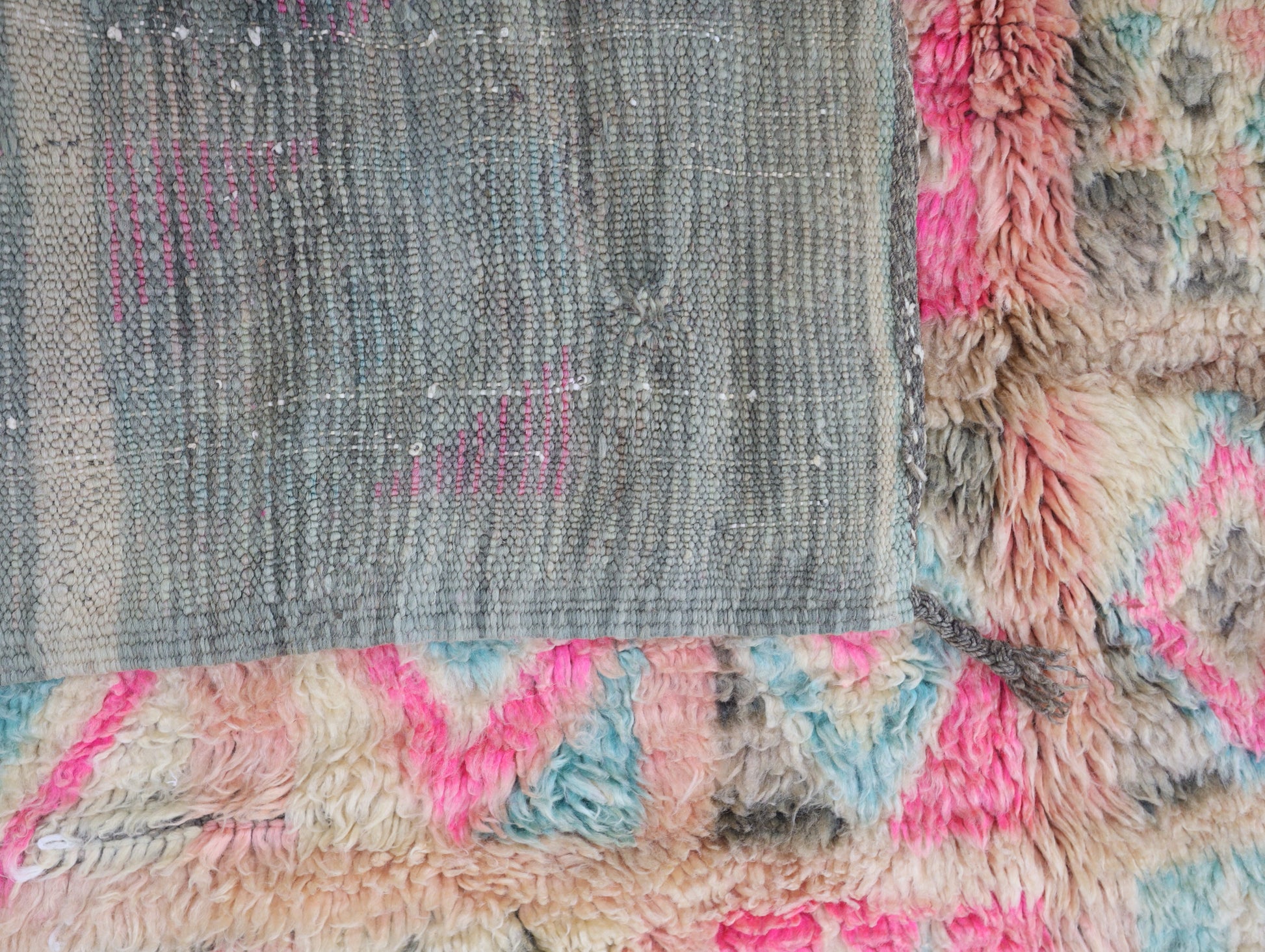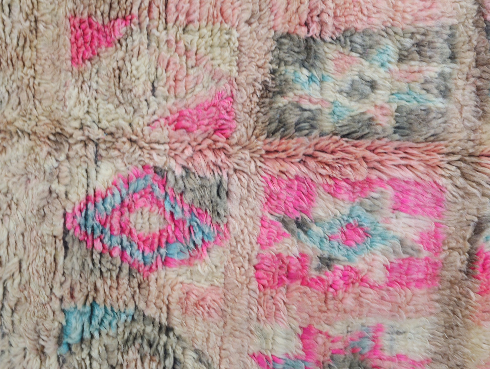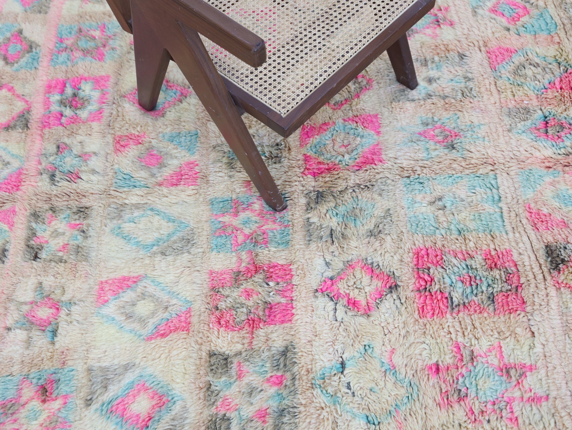 Originating in the Holy town of Boujad, these rugs, woven by diverse tribes, exhibit a wide spectrum of color, composition, and weave. Described as surreal, mystic, and mesmerizing, Boujad rugs transport us to a world beyond reality. Their construction, with twice as many horizontal as vertical knots, renders them floppy and easy to move.