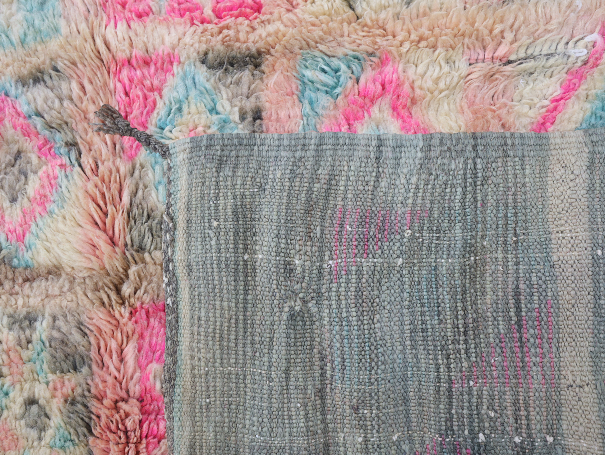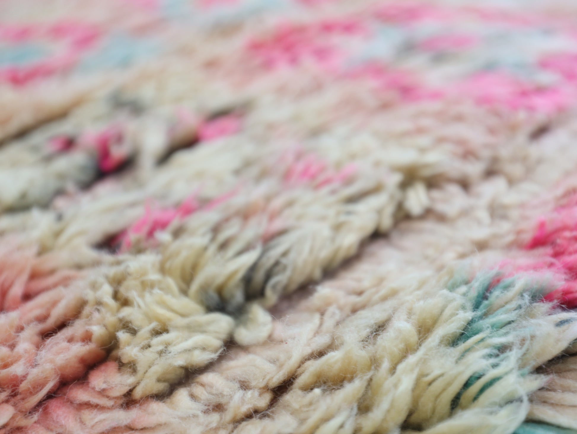 Wool, a sacred material for the Amazigh (Berber) people, forms the cornerstone of Moroccan rug design. Durable, long-lasting, and soft underfoot, wool is both functional and comfortable. In this piece, the wool pile is expertly knotted onto a wool foundation, adding substance and allowing it to gracefully embrace the floor.
