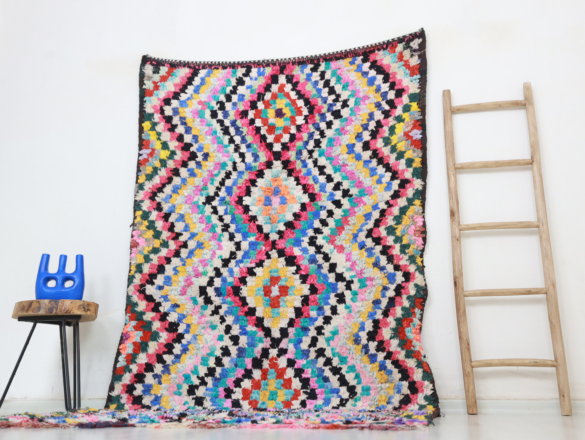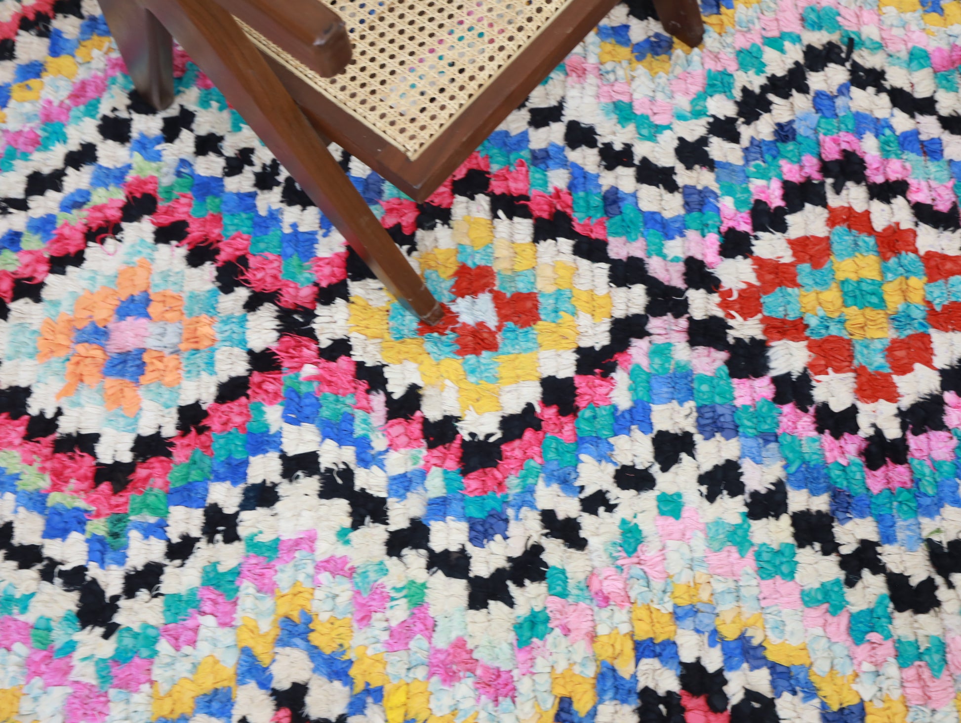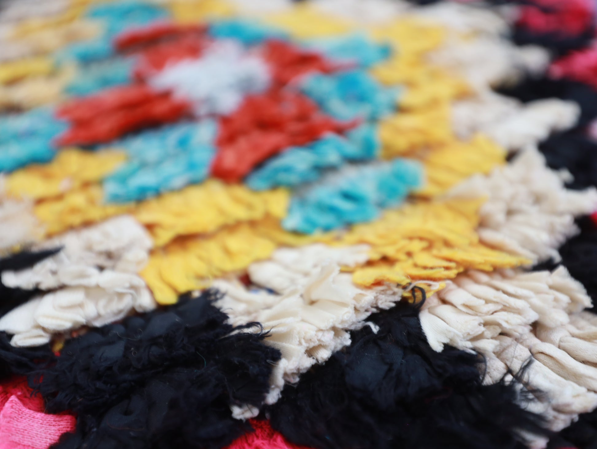 Azilal rugs boast abstract, painterly designs reminiscent of rugs from Ourika. What sets them apart is a vibrant color palette, achieved through the incorporation of cotton alongside wool..