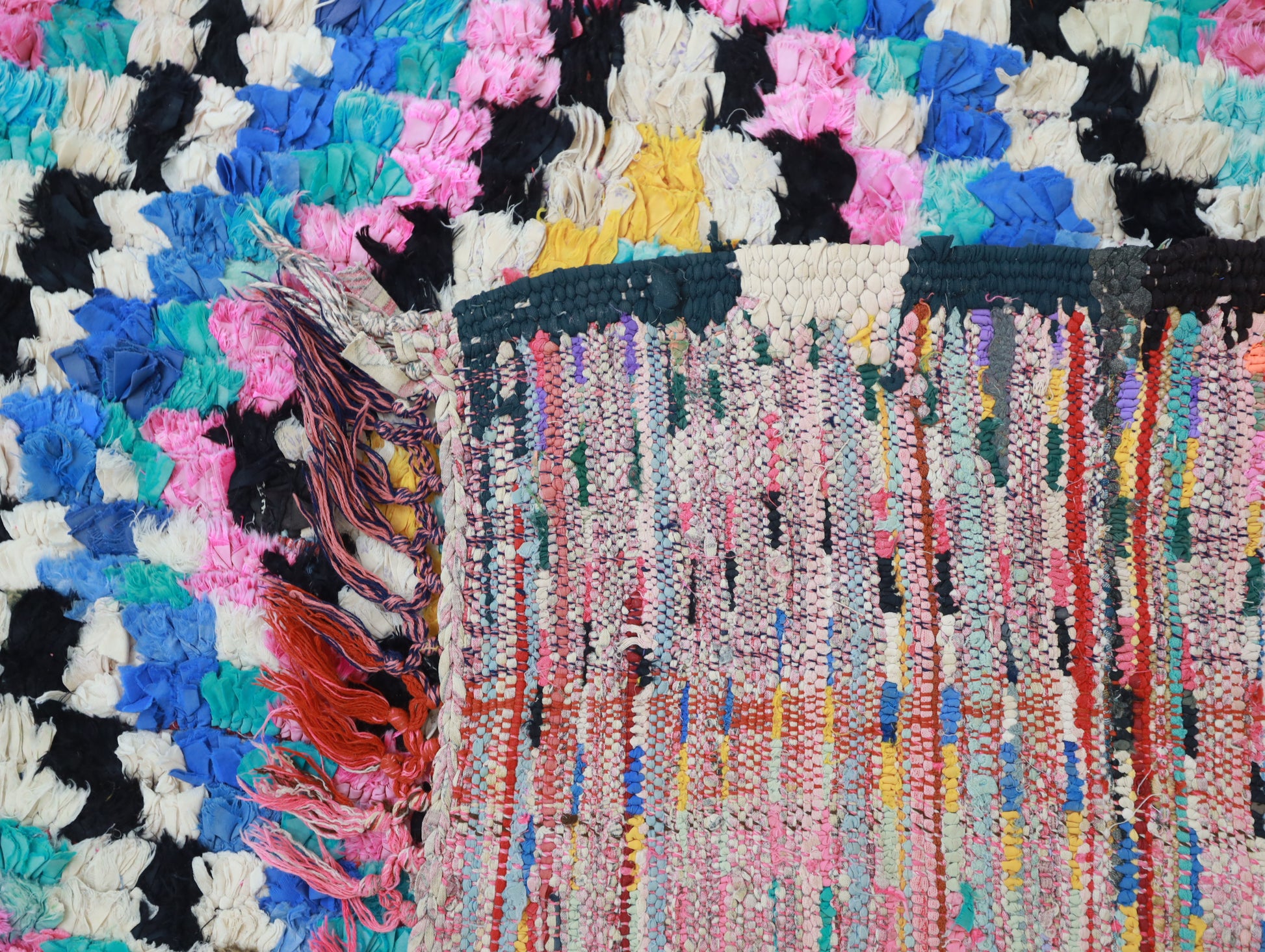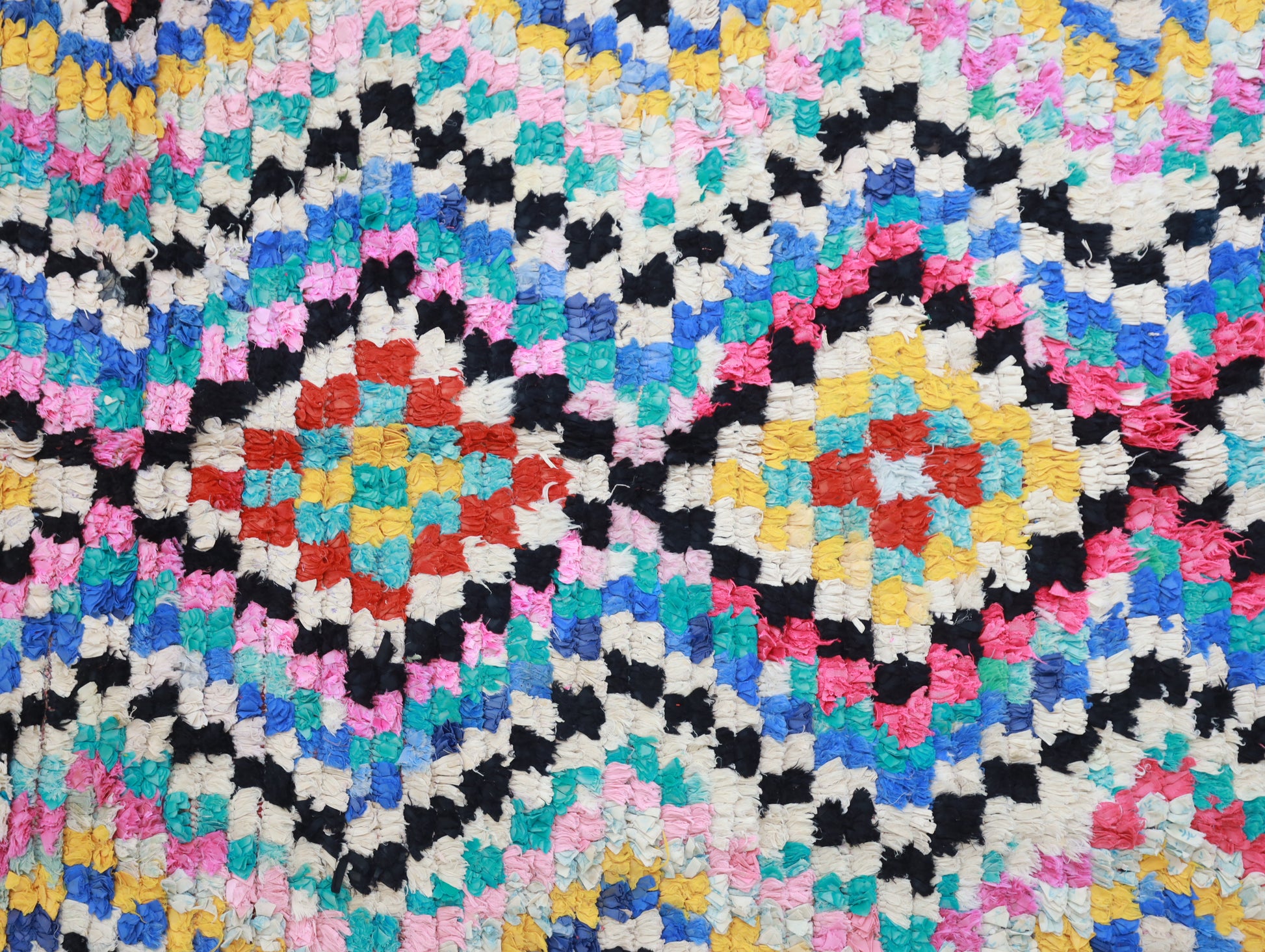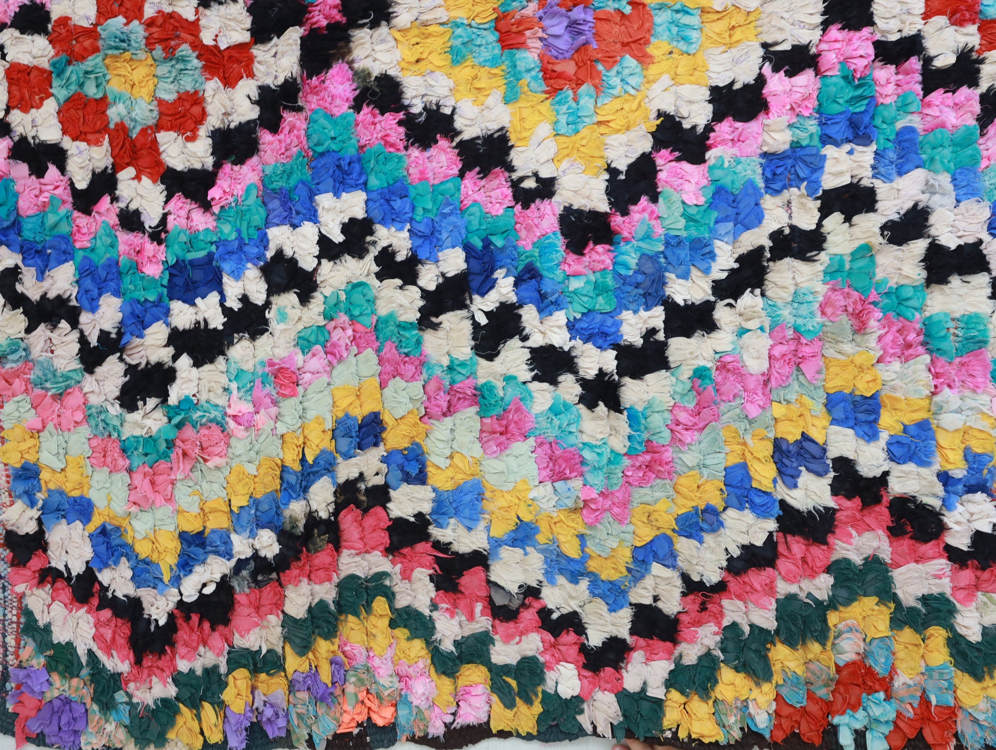 An unparalleled vintage masterpiece, carefully crafted by Berber Tribes in the Boucherouite style using upcycled textiles. Measurements: 4'9" x 9'1" (150 cm x 277 cm),