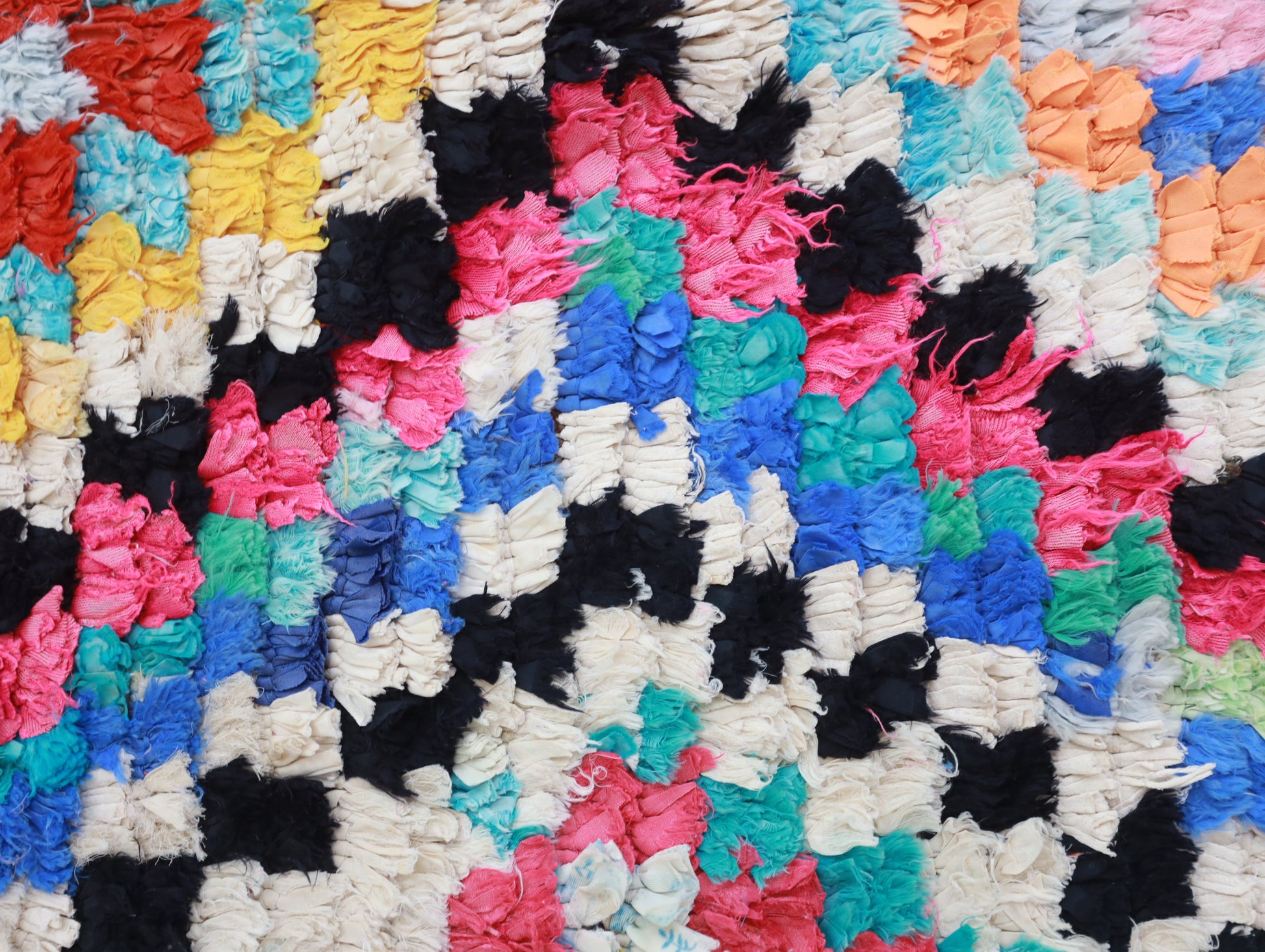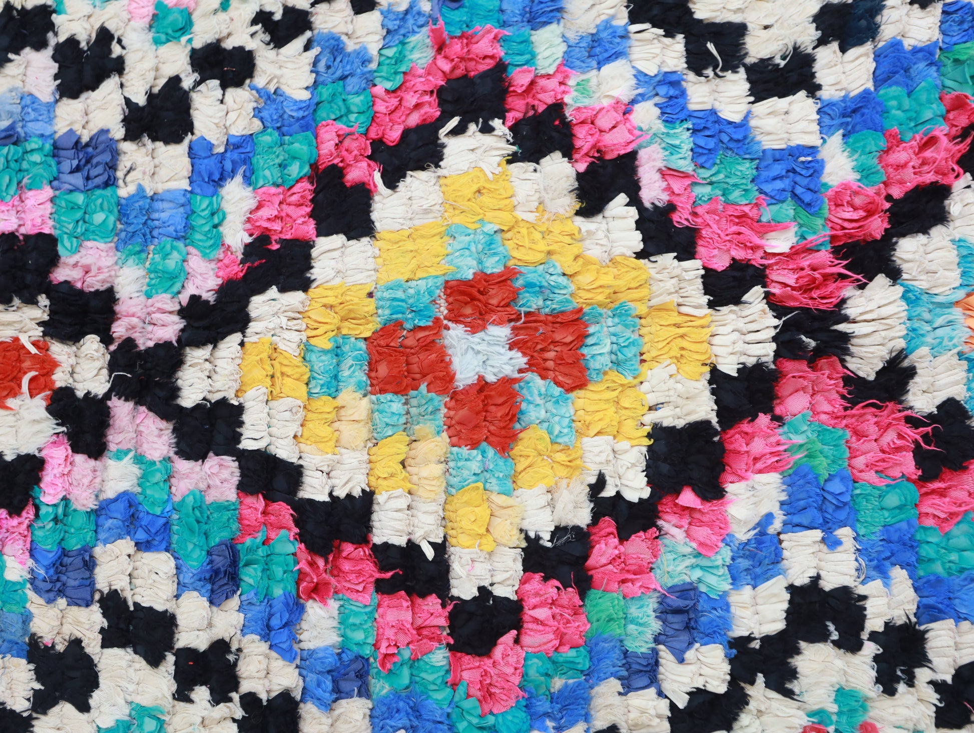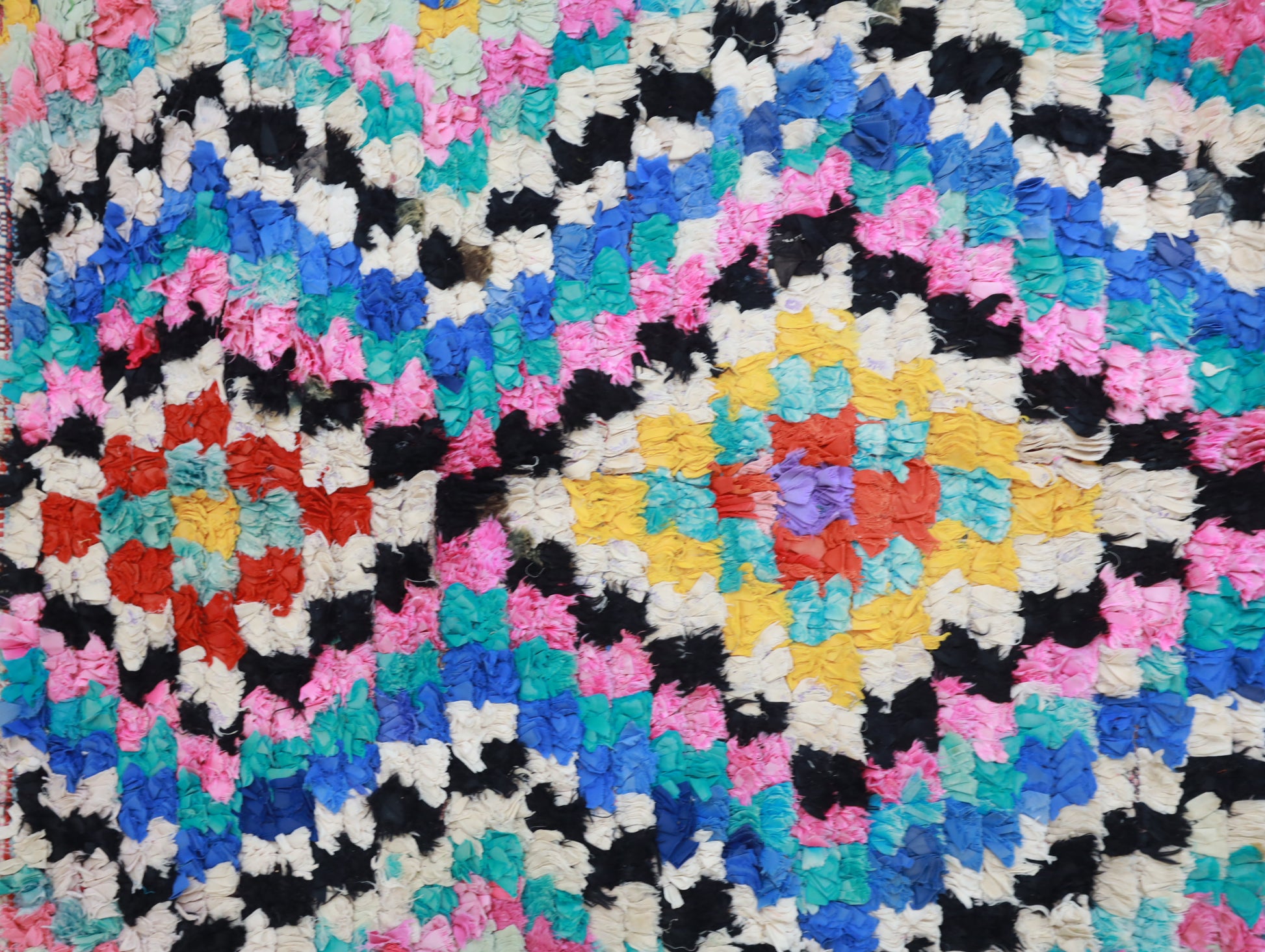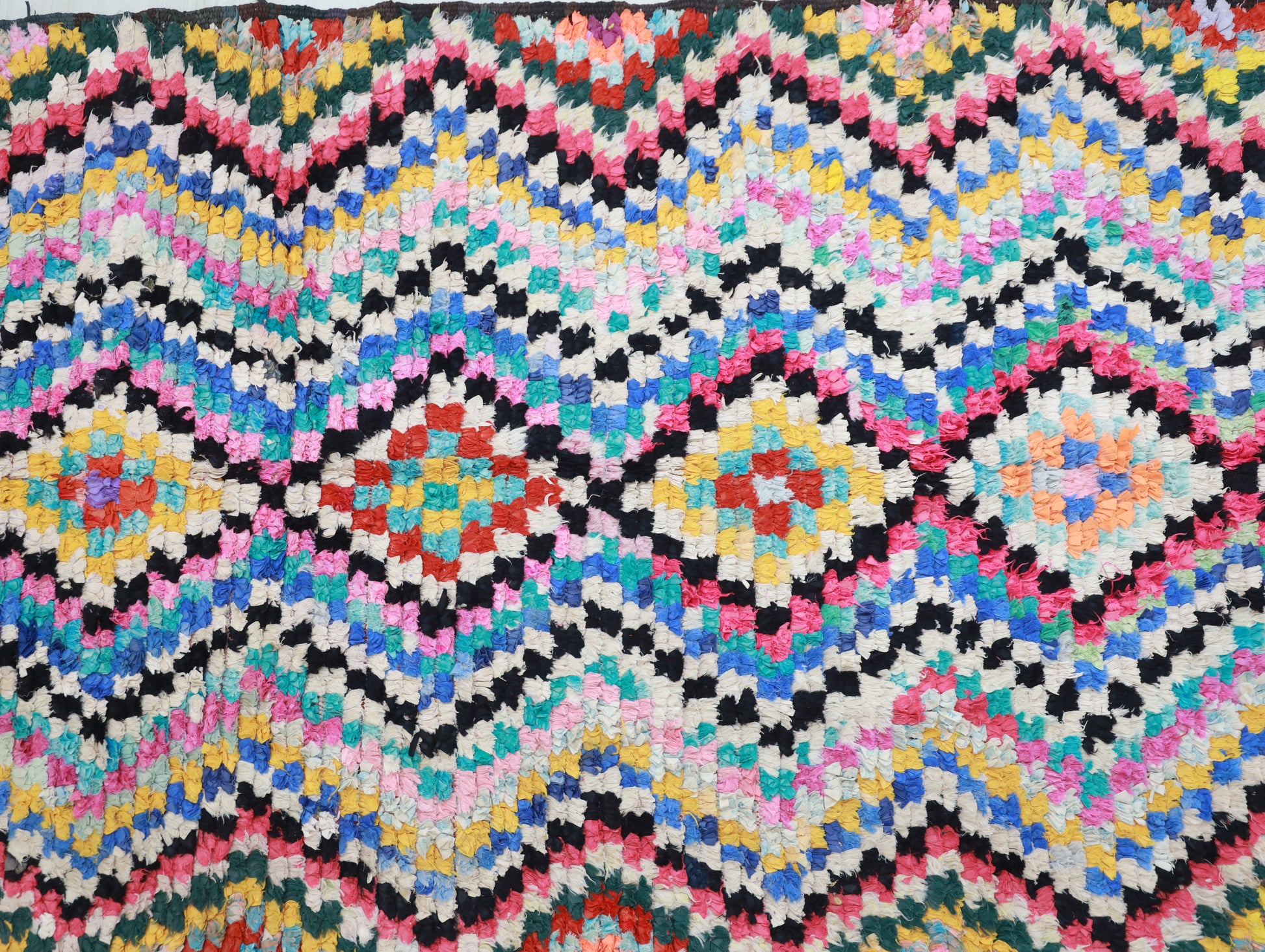 An unparalleled vintage masterpiece, carefully crafted by Berber Tribes in the Boucherouite style using upcycled textiles. Measurements: 4'9" x 9'1" (150 cm x 277 cm),