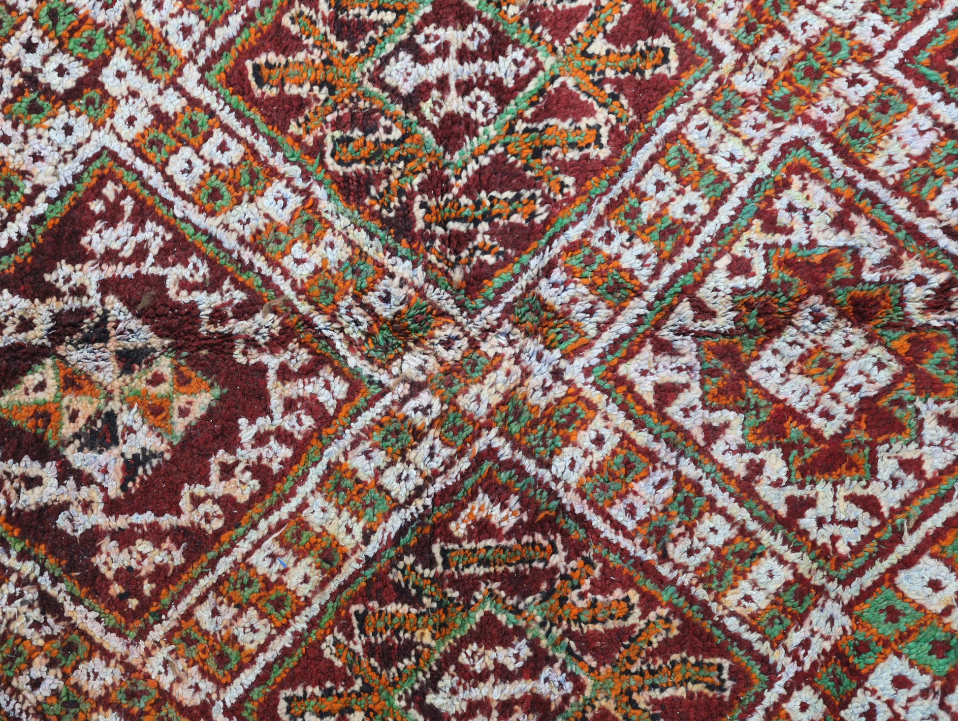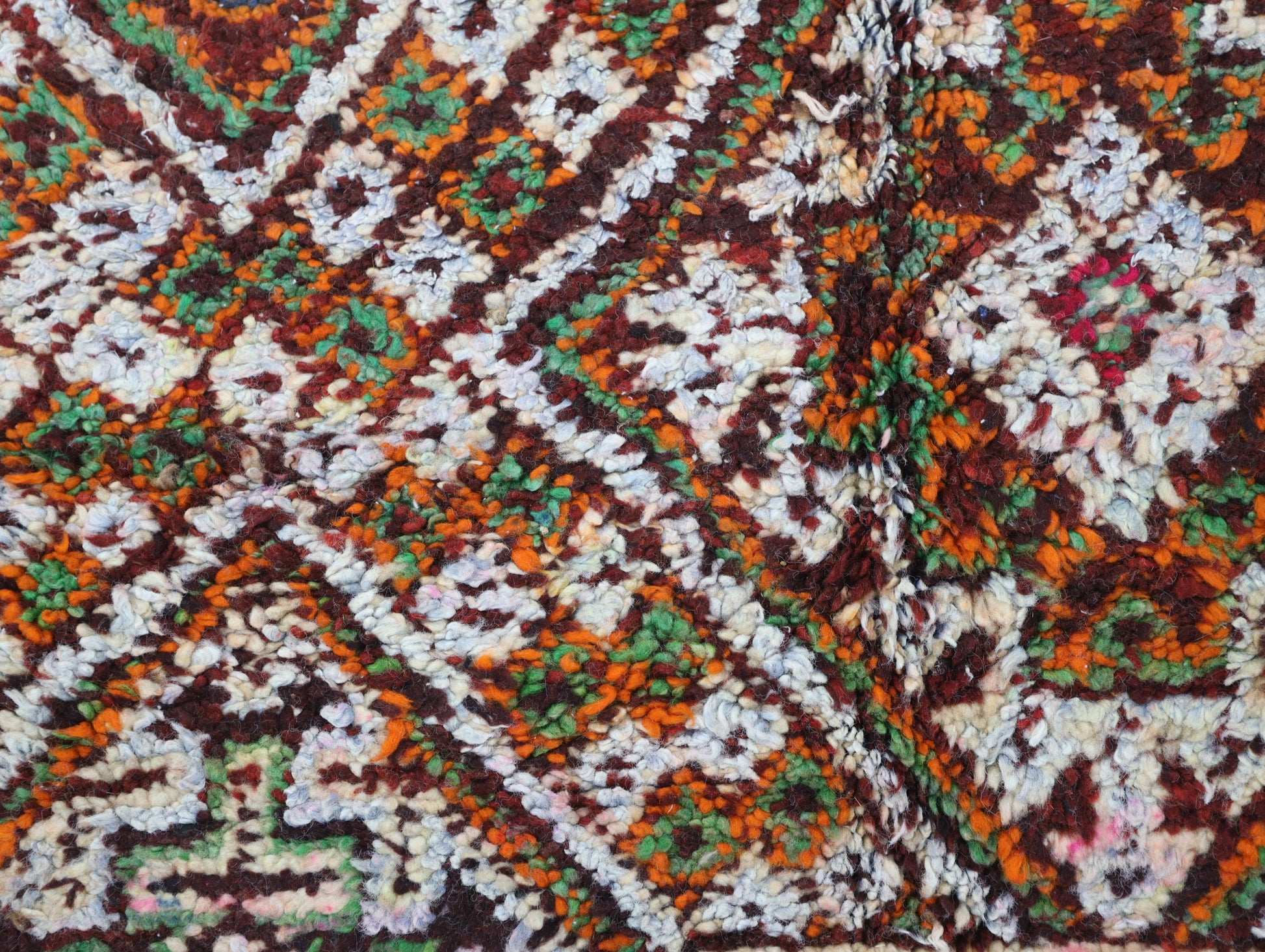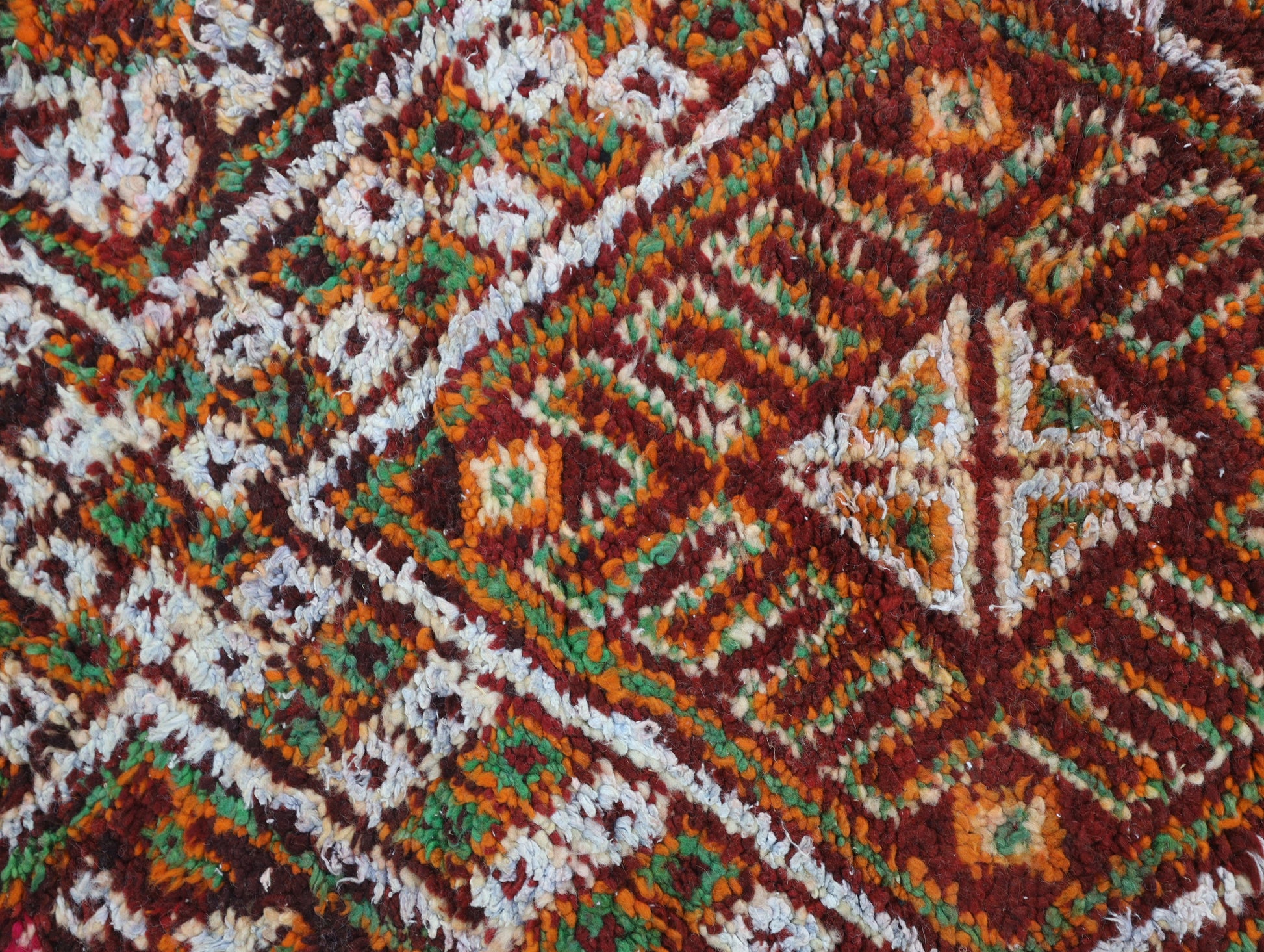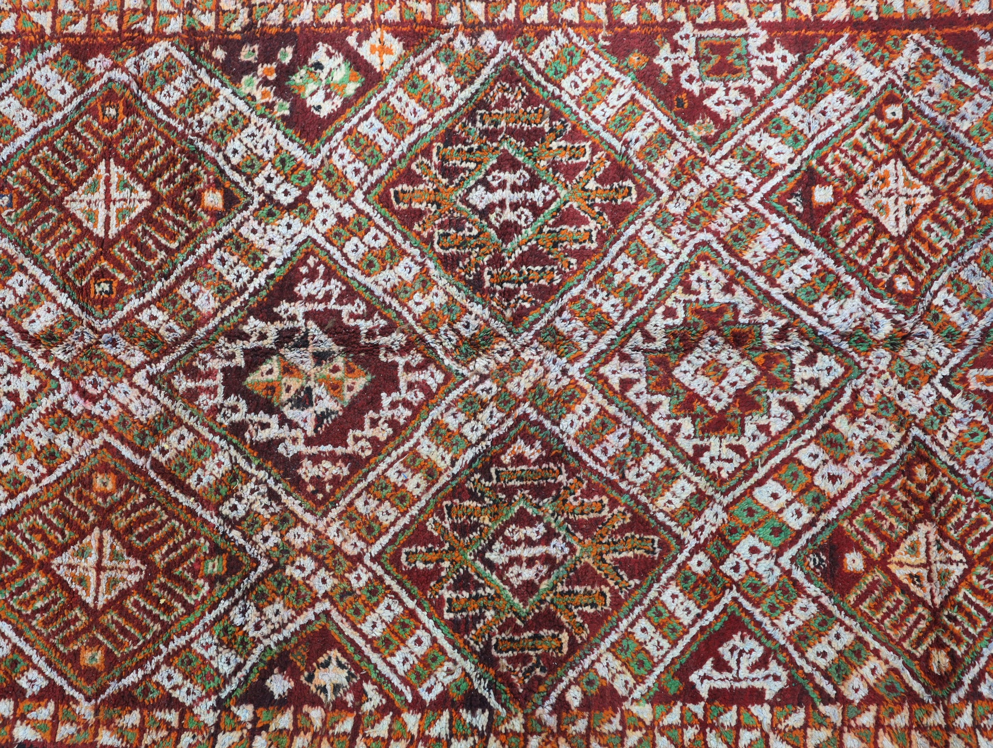Originating in the Holy town of Boujad, these rugs, woven by diverse tribes, exhibit a wide spectrum of color, composition, and weave. Described as surreal, mystic, and mesmerizing, Boujad rugs transport us to a world beyond reality. Their construction, with twice as many horizontal as vertical knots, renders them floppy and easy to move.
