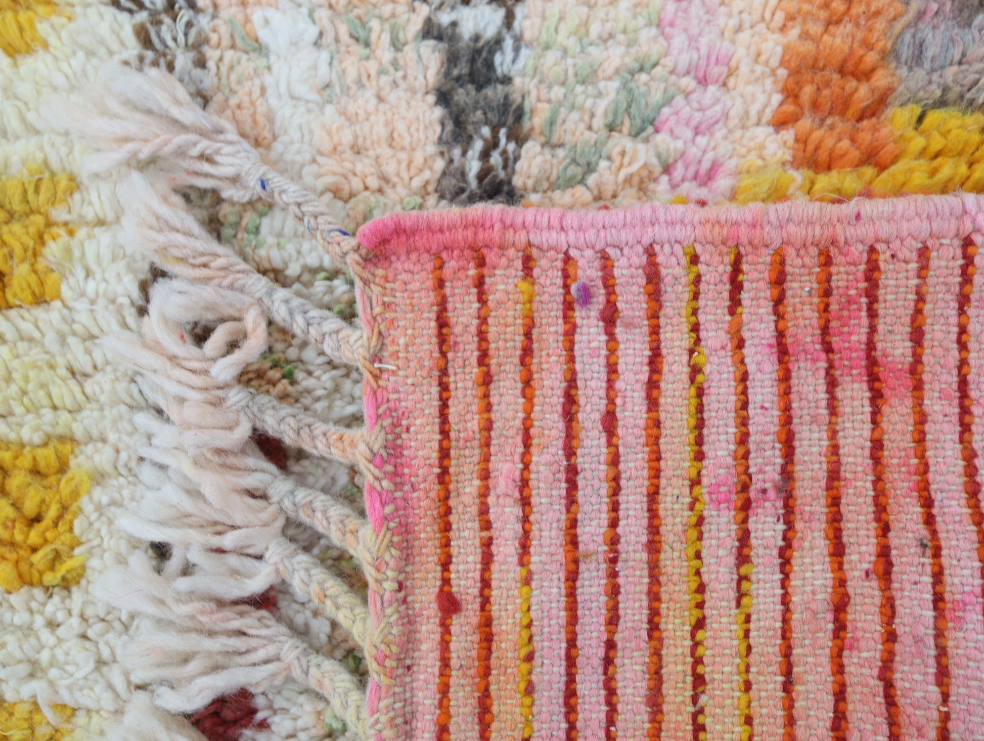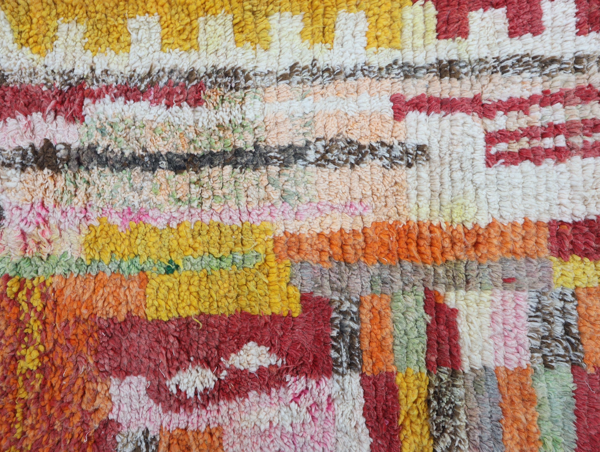 Originating in the Holy town of Boujad, these rugs, woven by diverse tribes, exhibit a wide spectrum of color, composition, and weave. Described as surreal, mystic, and mesmerizing, Boujad rugs transport us to a world beyond reality. Their construction, with twice as many horizontal as vertical knots, renders them floppy and easy to move.