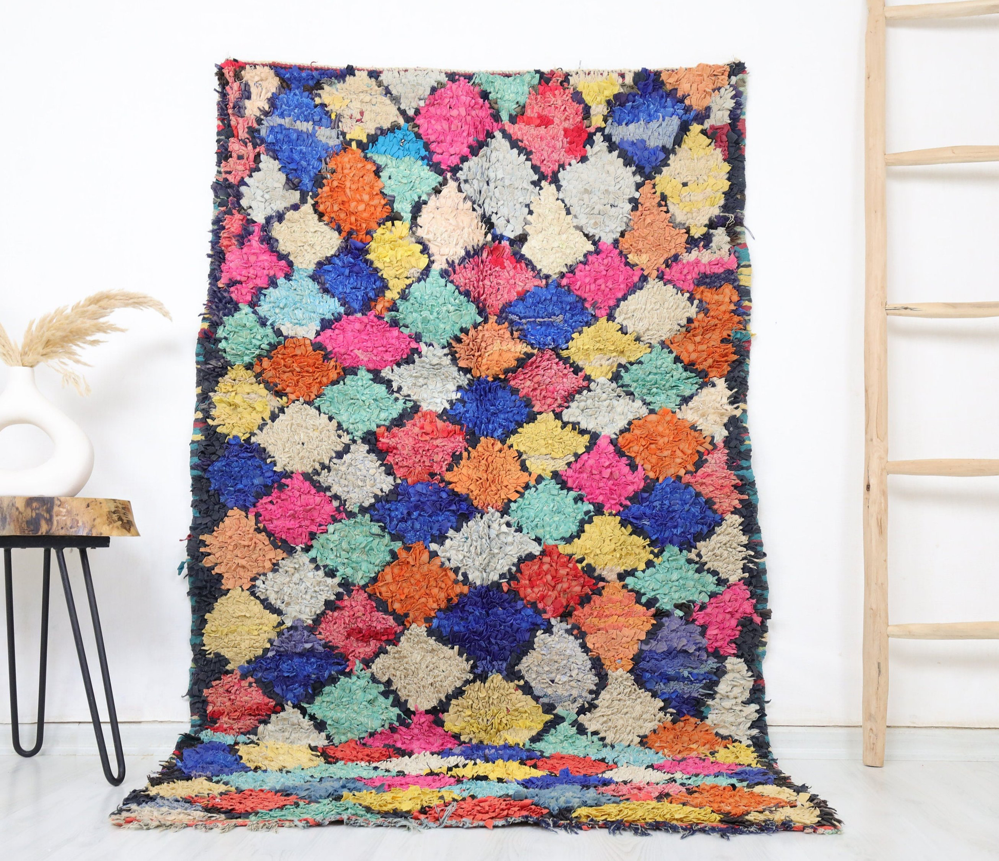 An unparalleled vintage masterpiece, carefully crafted  by Berber Tribes in the Boucherouite style using upcycled textiles. Measurements: 3'6"X 6'2" (110 cm x 190 cm),