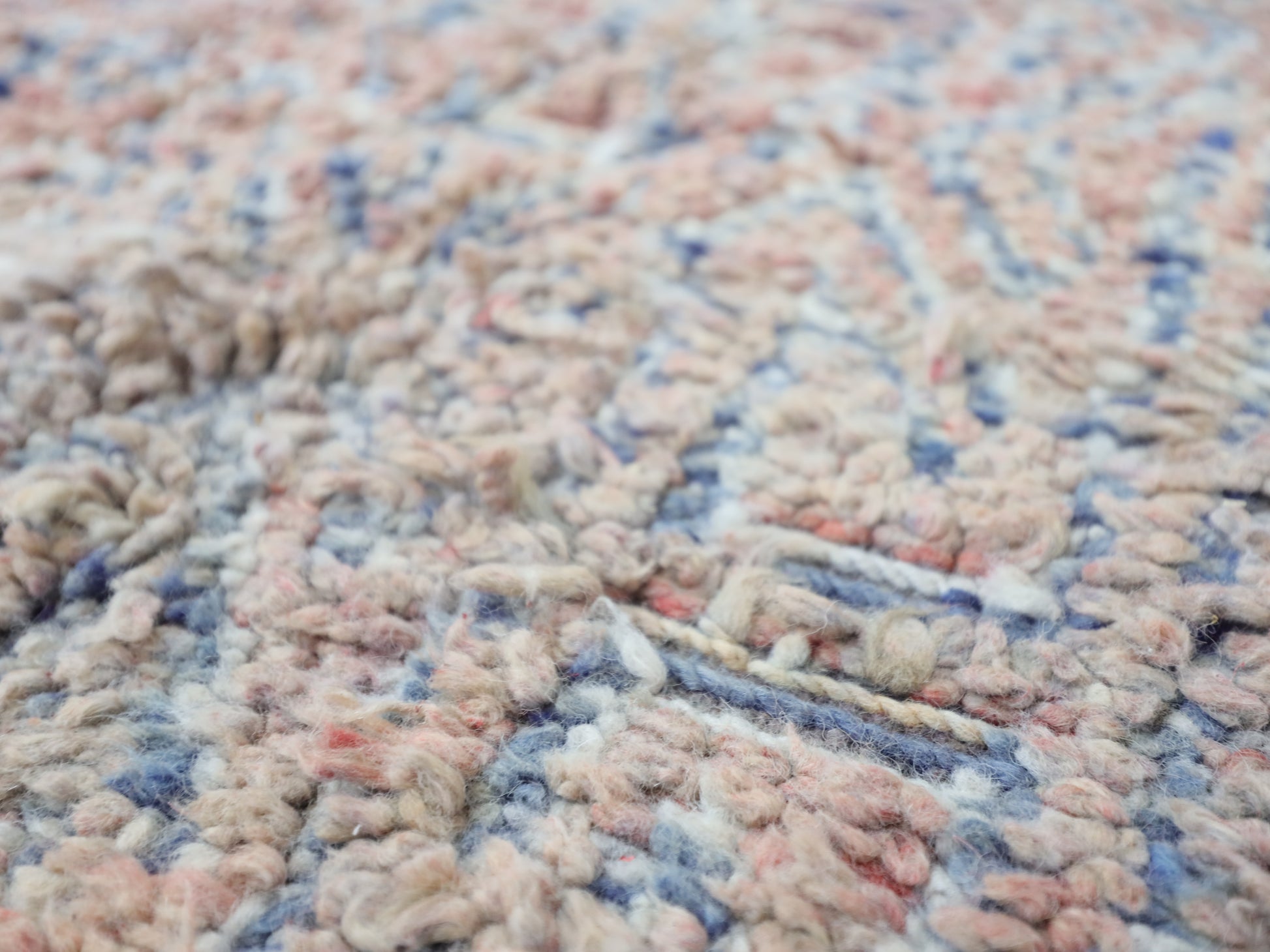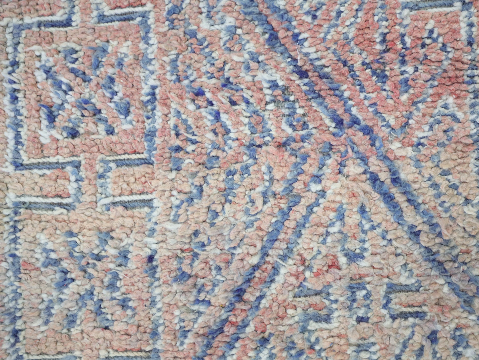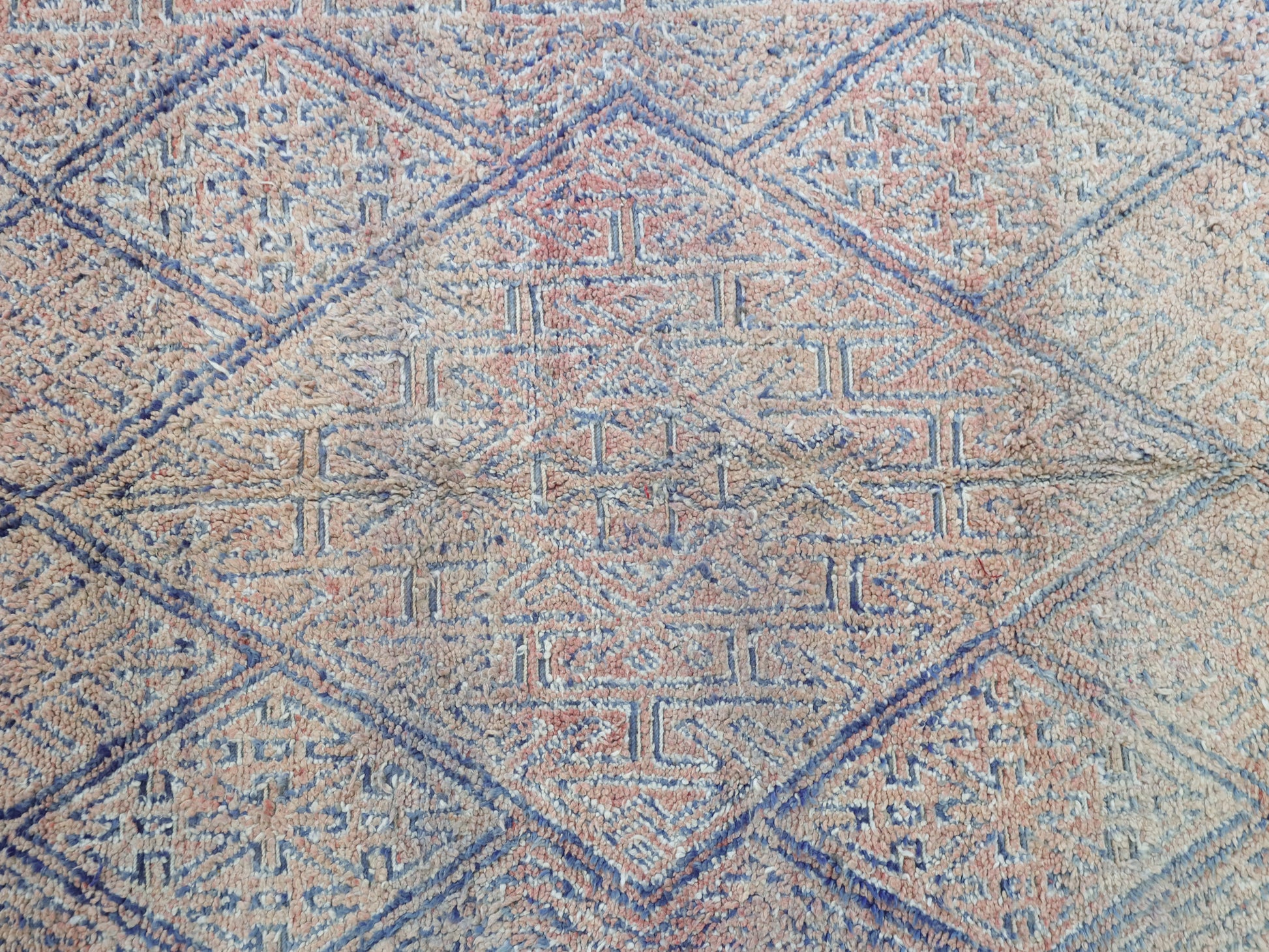 Wool, a sacred material for the Amazigh (Berber) people, forms the cornerstone of Moroccan rug design. Durable, long-lasting, and soft underfoot, wool is both functional and comfortable. In this piece, the wool pile is expertly knotted onto a wool foundation, adding substance and allowing it to gracefully embrace the floor.