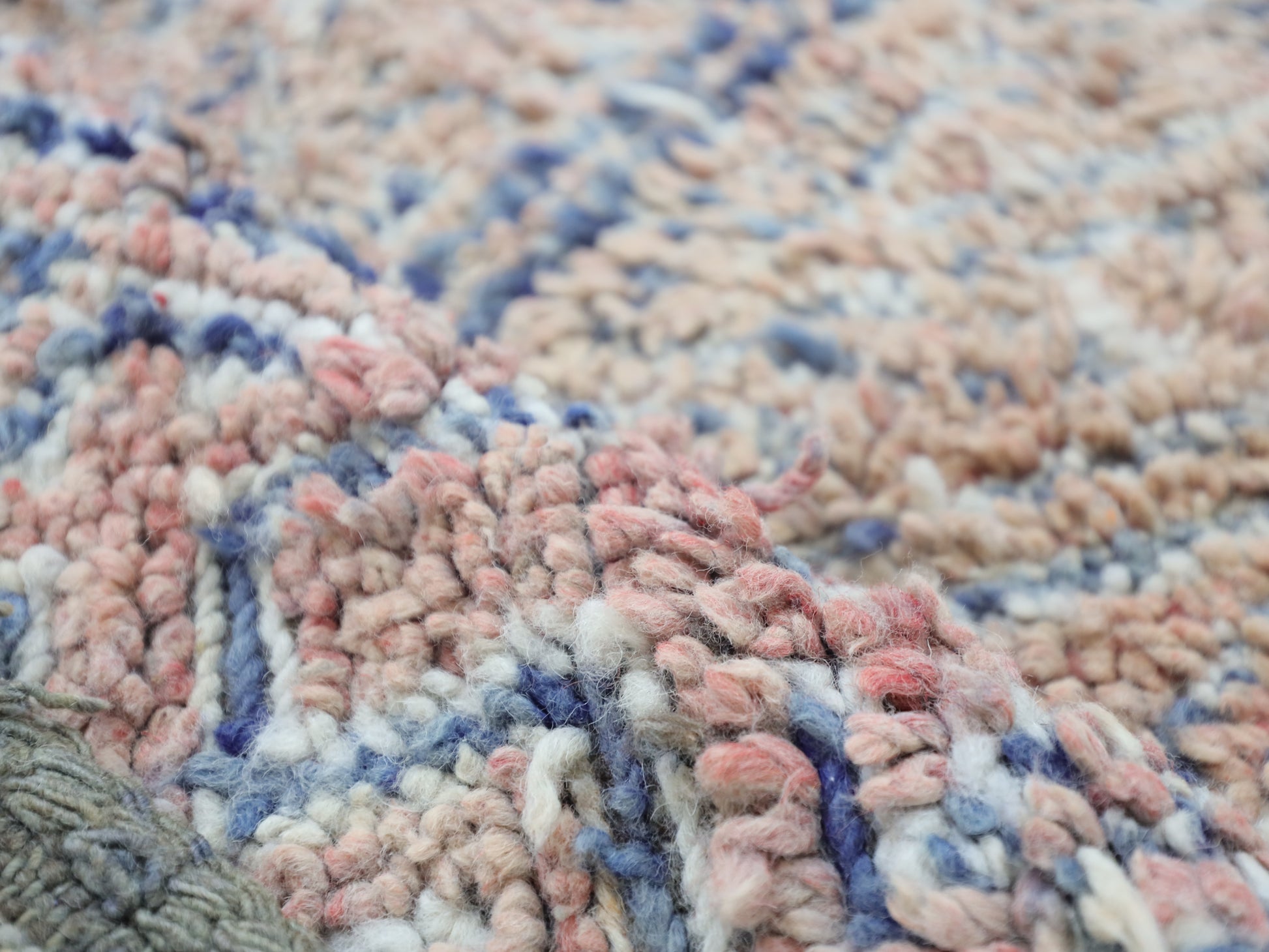 Locally sourced Moroccan wool produces a thick, strong pile with a soft feel underfoot. Having weathered time, this hand-processed wool exudes an untamed, nubby appearance, a testament to its journey through diverse environments.