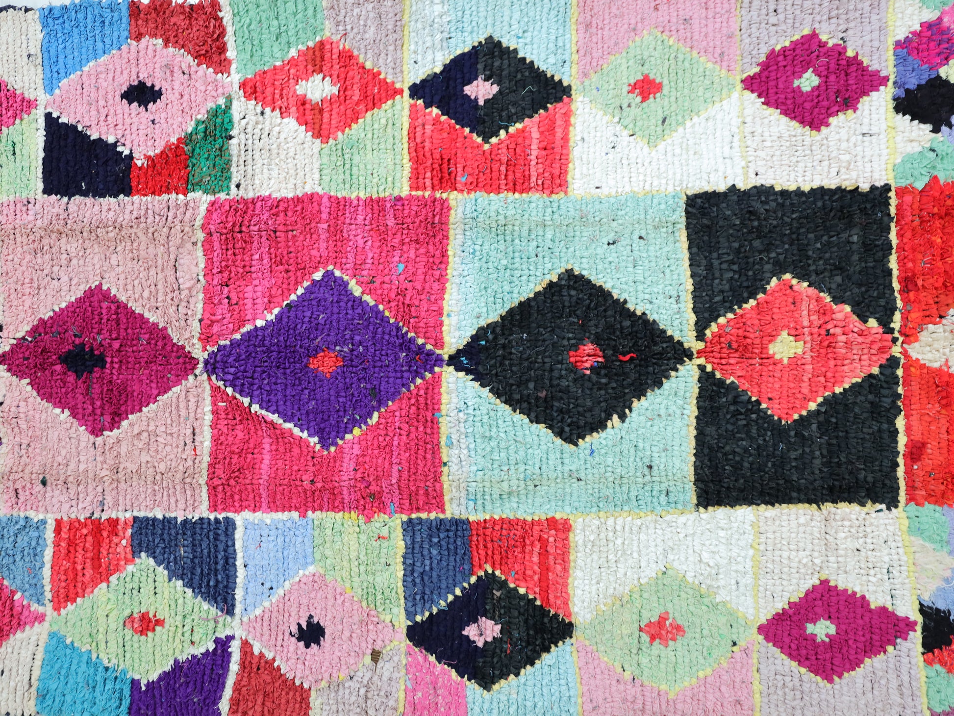 Azilal rugs boast abstract, painterly designs reminiscent of rugs from Ourika. What sets them apart is a vibrant color palette, achieved through the incorporation of cotton alongside wool..
