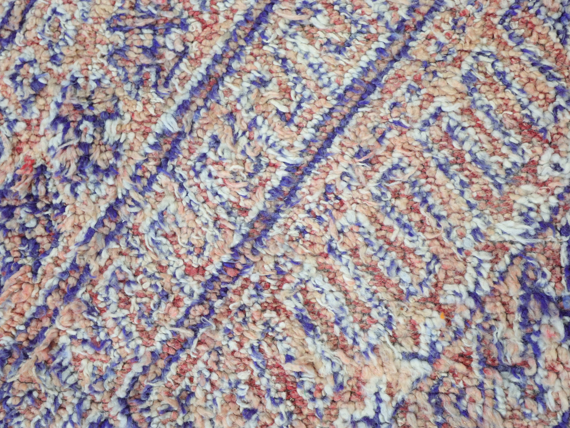 Originating in the Holy town of Boujad, these rugs, woven by diverse tribes, exhibit a wide spectrum of color, composition, and weave. Described as surreal, mystic, and mesmerizing, Boujad rugs transport us to a world beyond reality. Their construction, with twice as many horizontal as vertical knots, renders them floppy and easy to move.