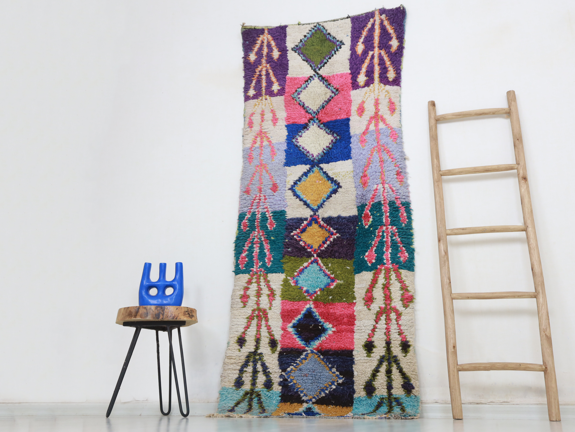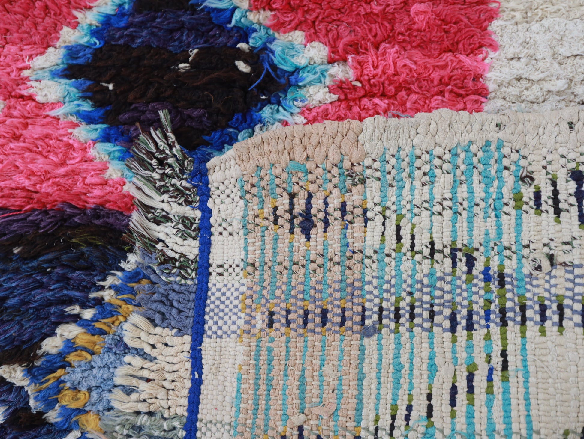 Azilal rugs boast abstract, painterly designs reminiscent of rugs from Ourika. What sets them apart is a vibrant color palette, achieved through the incorporation of cotton alongside wool..