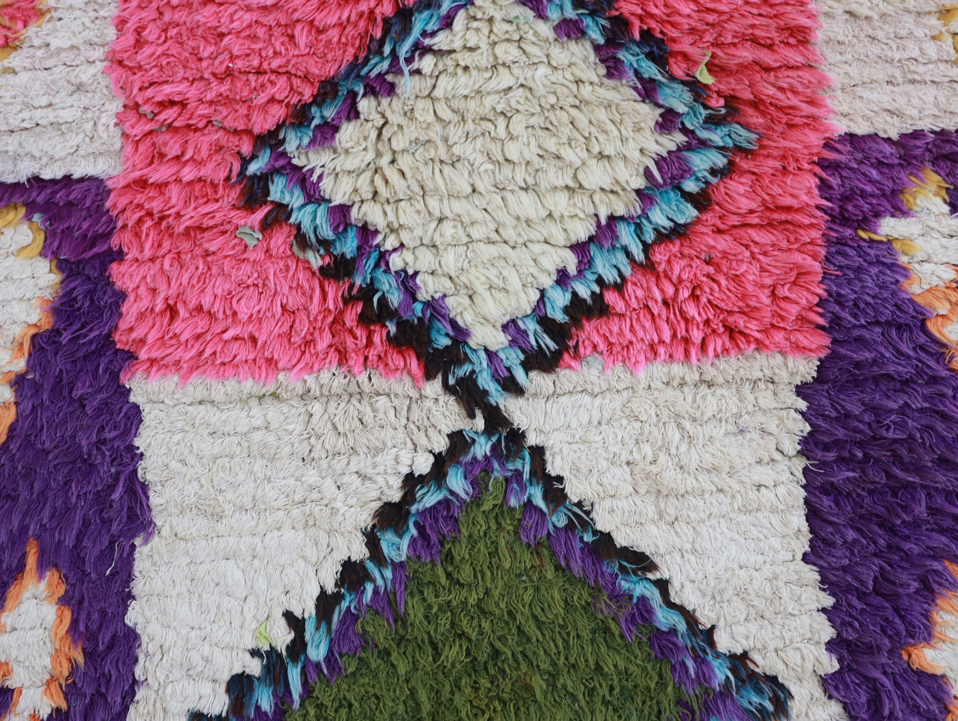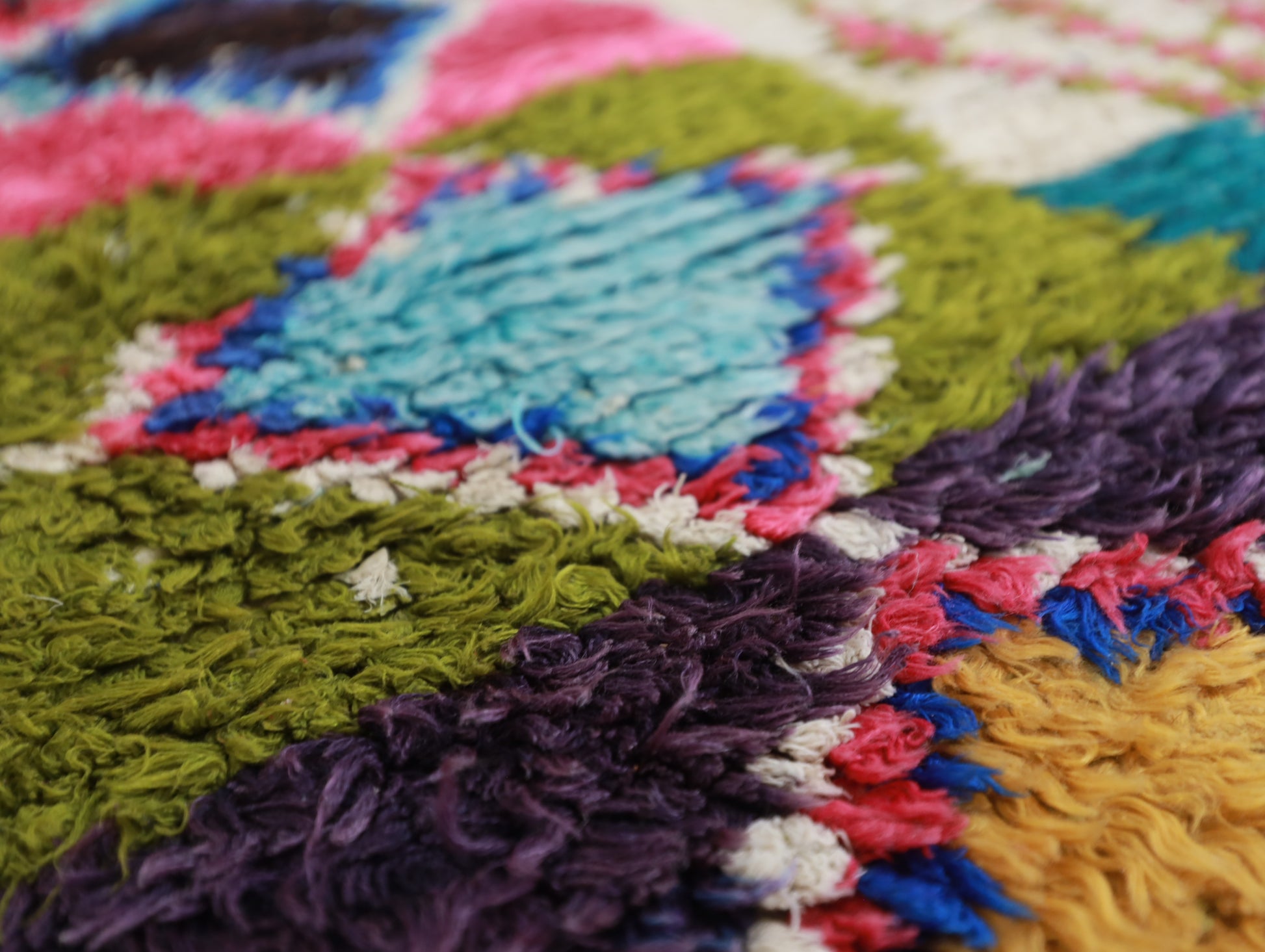 Sourced locally, Moroccan wool produces a dense, sturdy pile that feels soft and fluffy underfoot. While a touch of shedding is natural, it's a small price to pay for the cherished wild, tousled texture of the high pile—a comfort beloved for its durability, longevity, and the soft embrace it offers with every step.