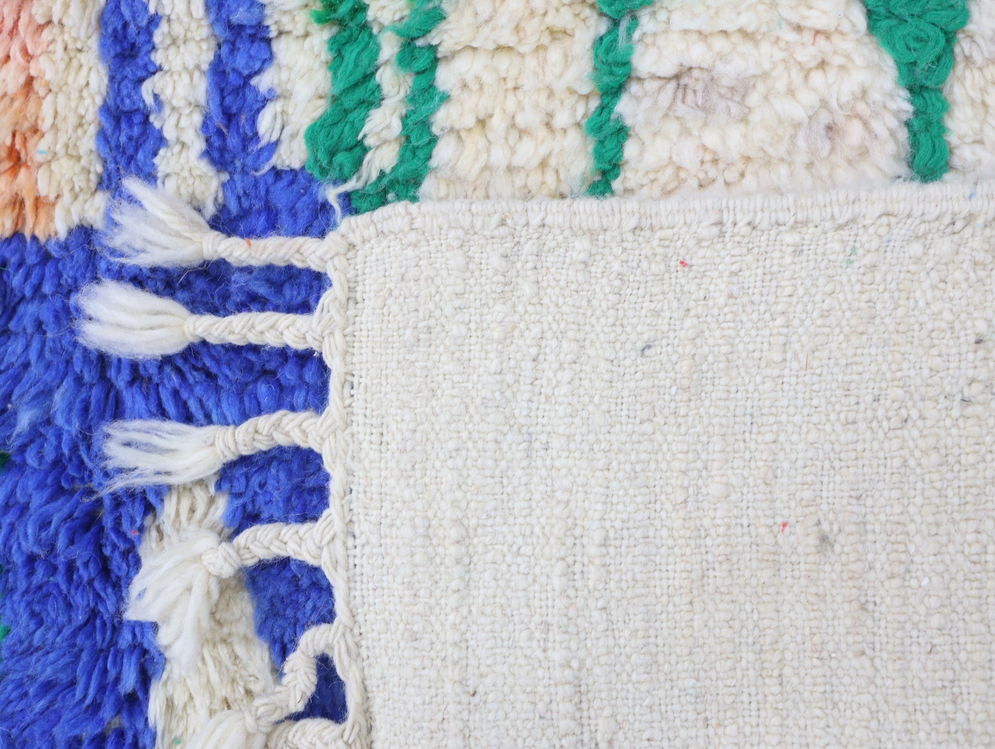 Wool, a sacred material for the Amazigh (Berber) people, forms the cornerstone of Moroccan rug design. Durable, long-lasting, and soft underfoot, wool is both functional and comfortable. In this piece, the wool pile is expertly knotted onto a wool foundation, adding substance and allowing it to gracefully embrace the floor.