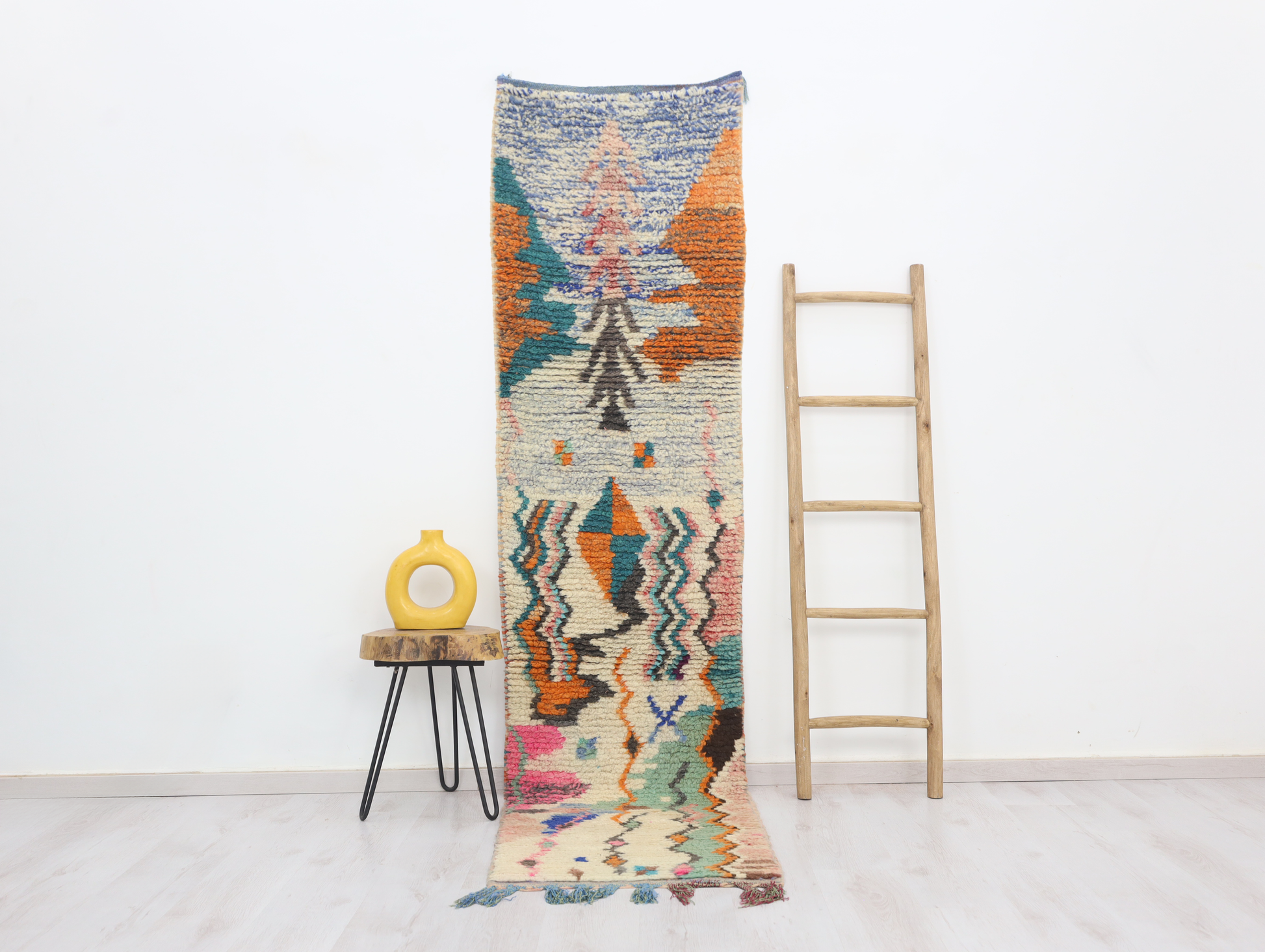 A singular moroccan rug, meticulously woven in the small city of Boujaad in Morocco's Chaouia-Ouardigha region. Size: 2'2" x 9'0" (66 cm x 273 cm).