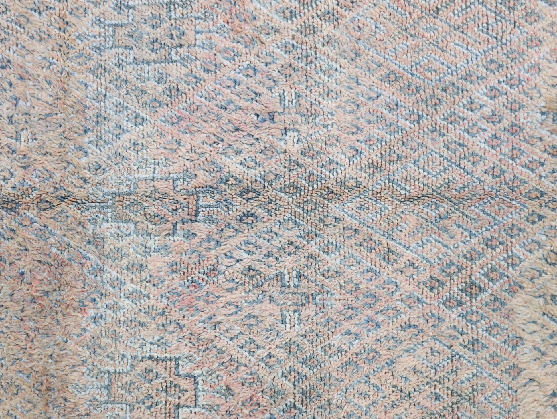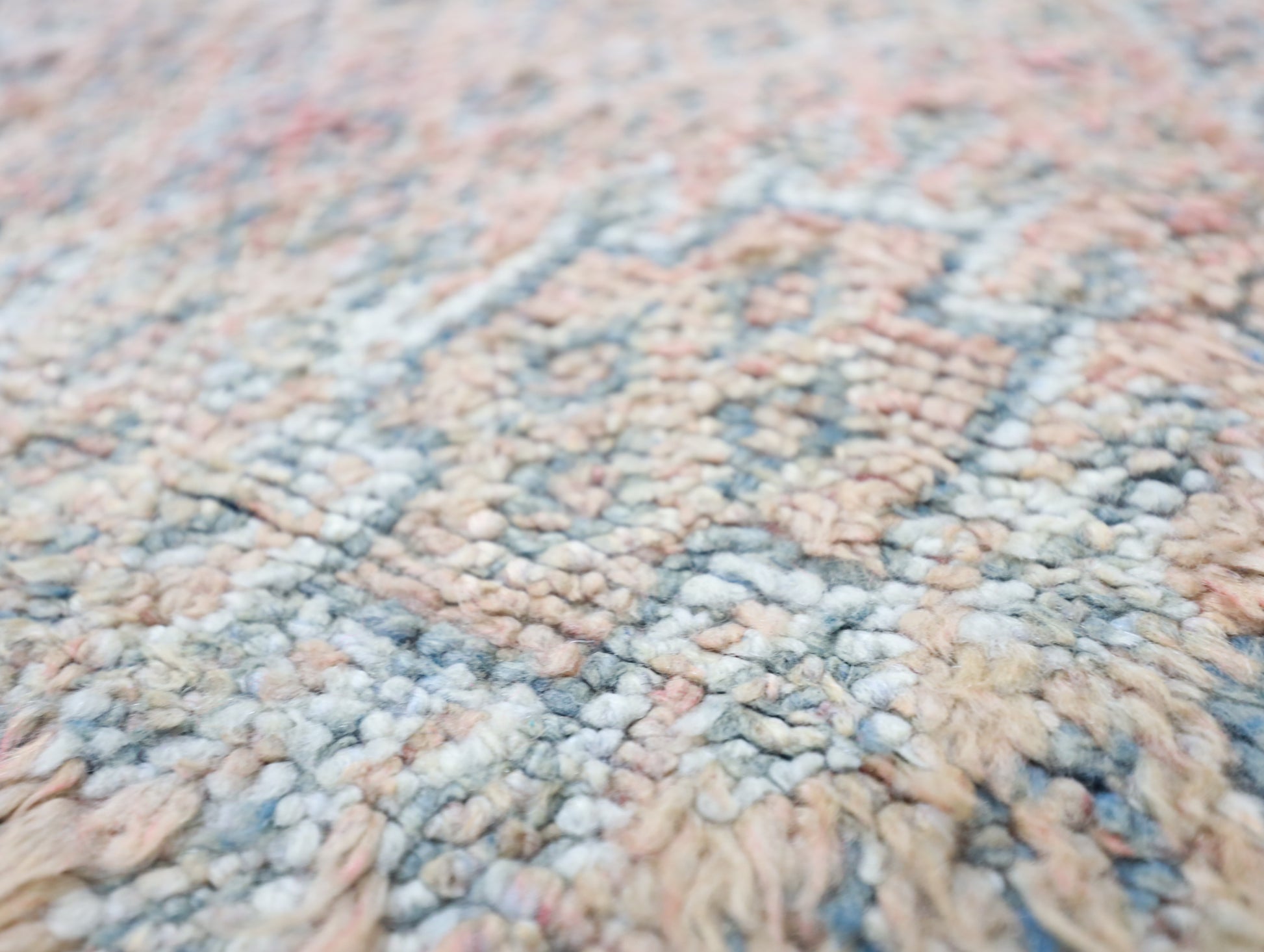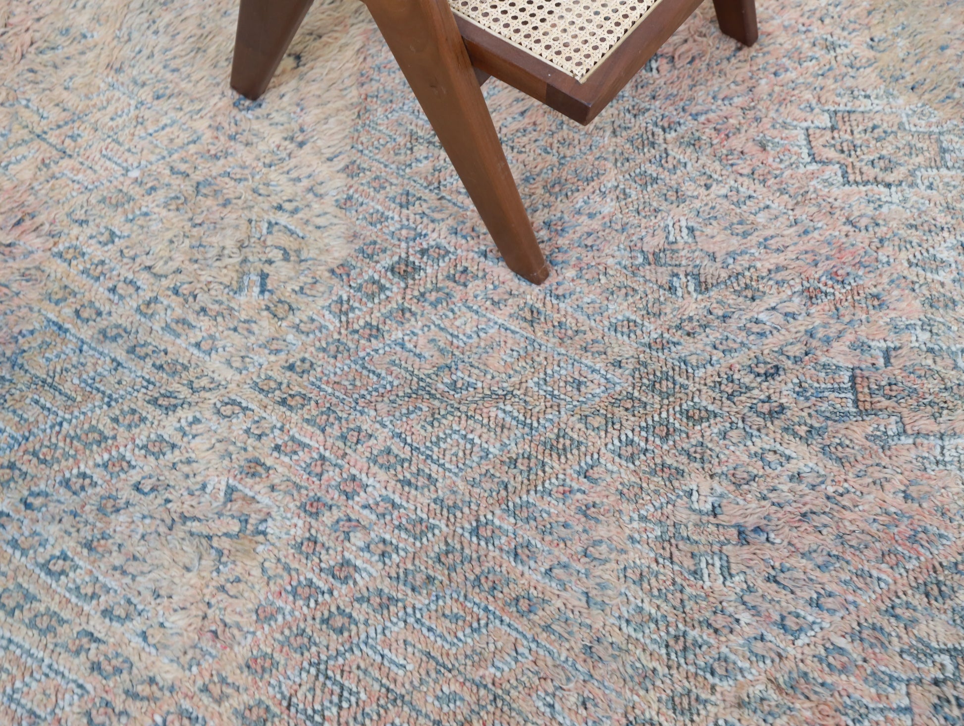 Wool, a sacred material for the Amazigh (Berber) people, forms the cornerstone of Moroccan rug design. Durable, long-lasting, and soft underfoot, wool is both functional and comfortable. In this piece, the wool pile is expertly knotted onto a wool foundation, adding substance and allowing it to gracefully embrace the floor.