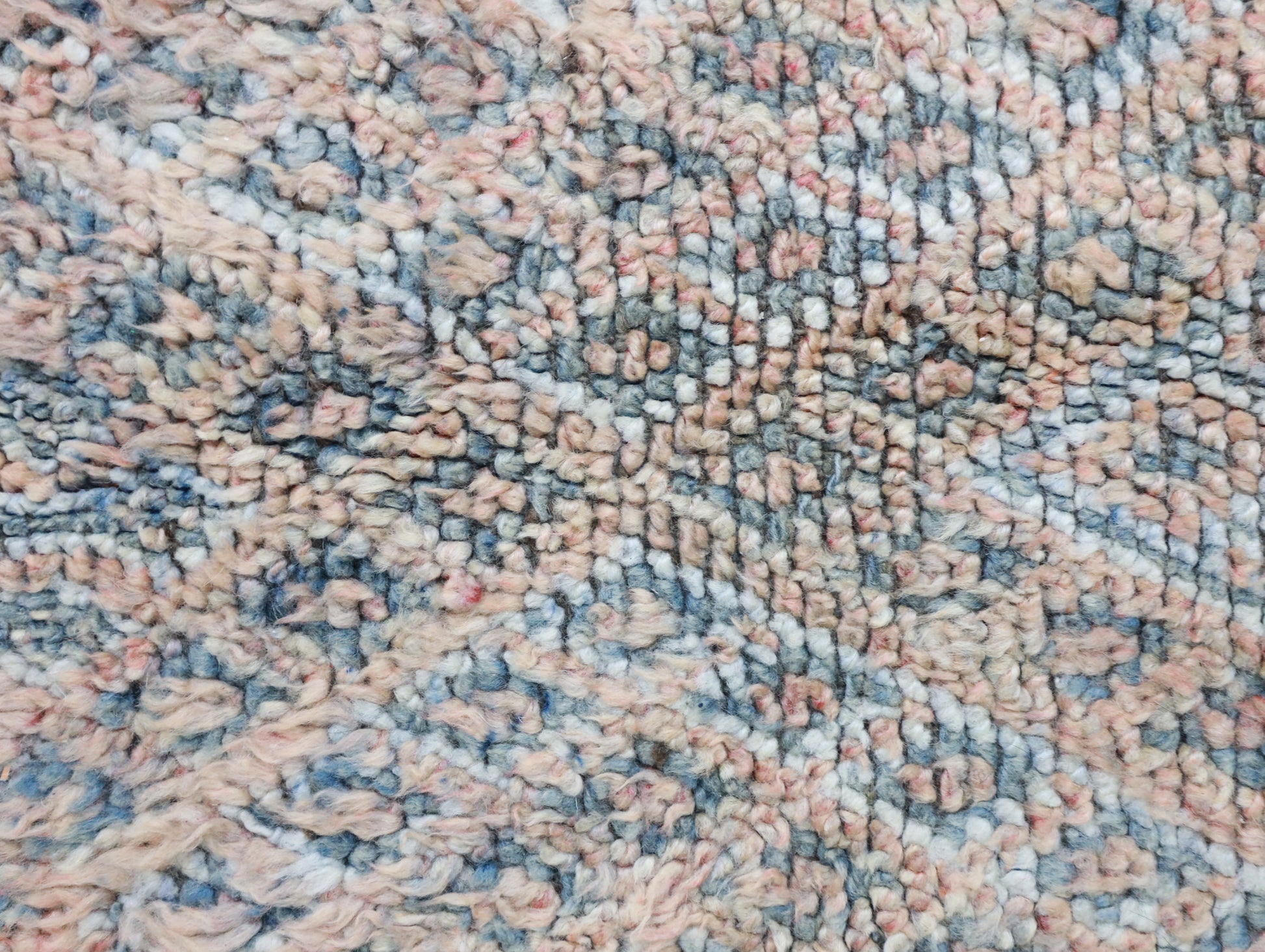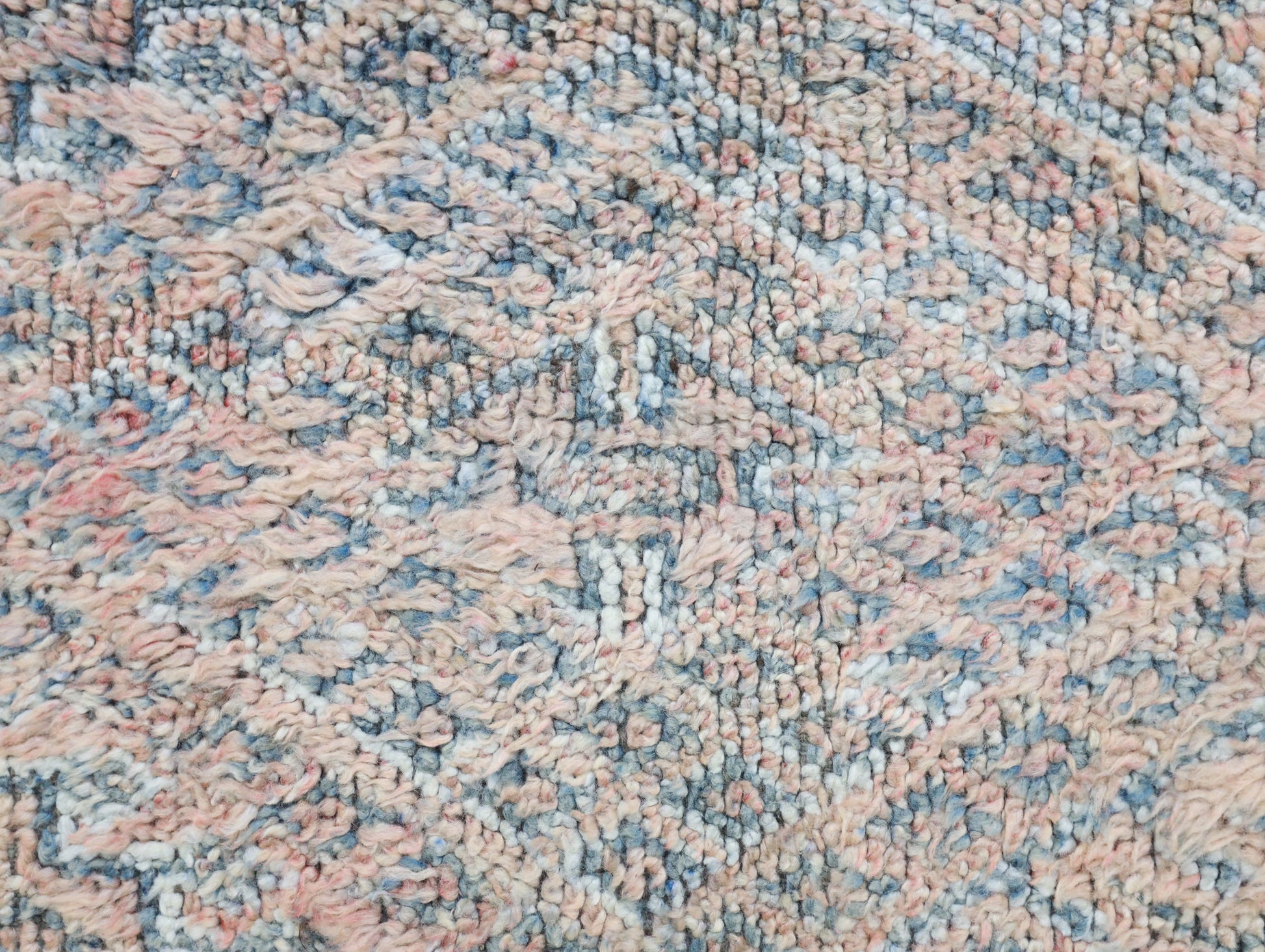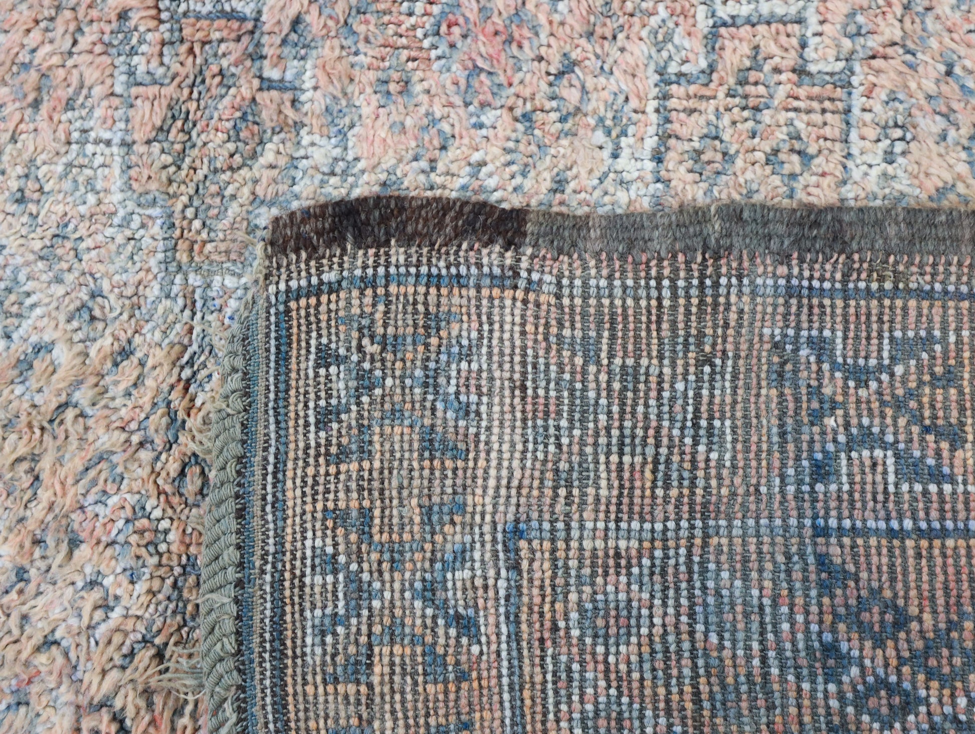 Wool, a sacred material for the Amazigh (Berber) people, forms the cornerstone of Moroccan rug design. Durable, long-lasting, and soft underfoot, wool is both functional and comfortable. In this piece, the wool pile is expertly knotted onto a wool foundation, adding substance and allowing it to gracefully embrace the floor.