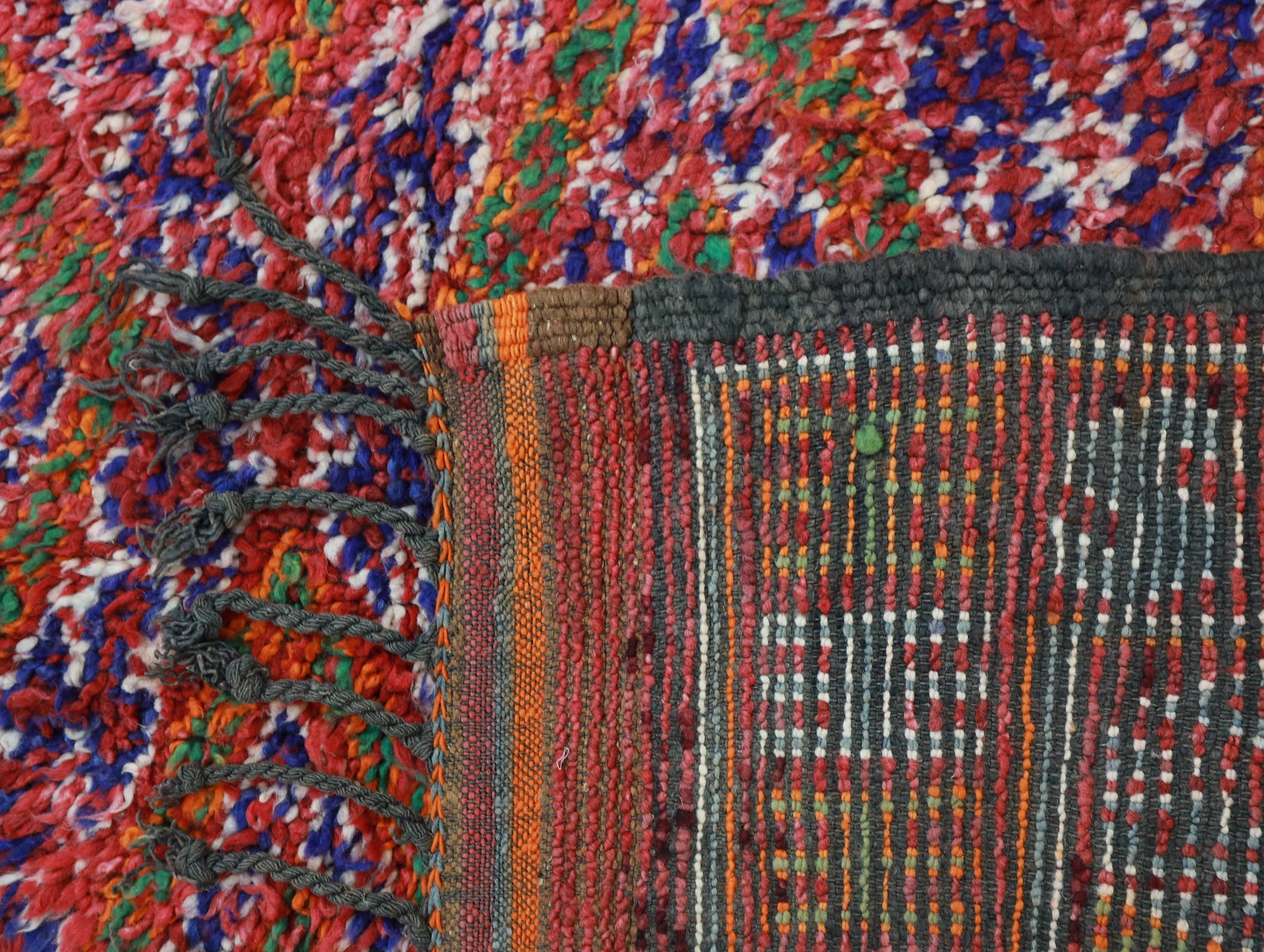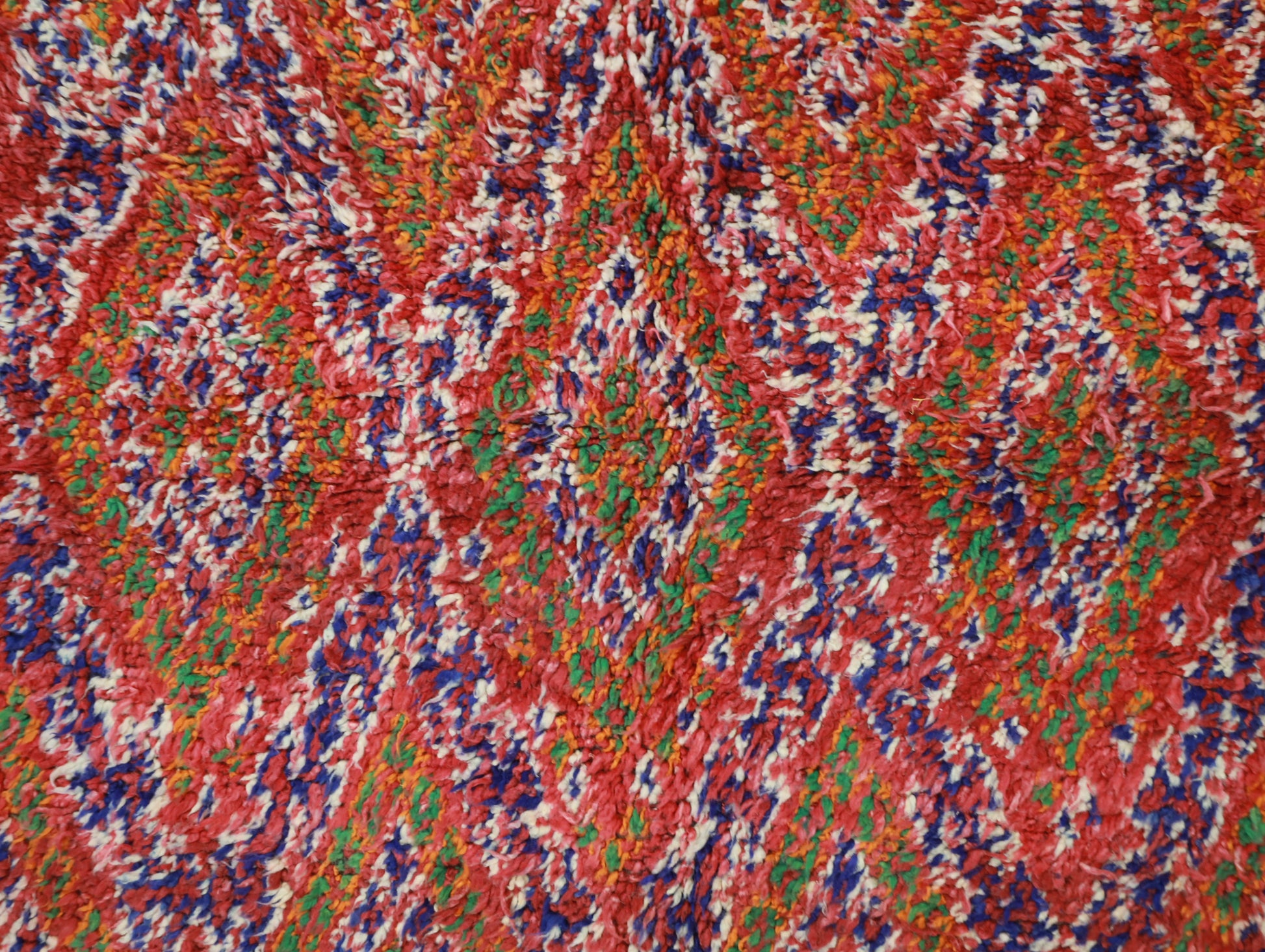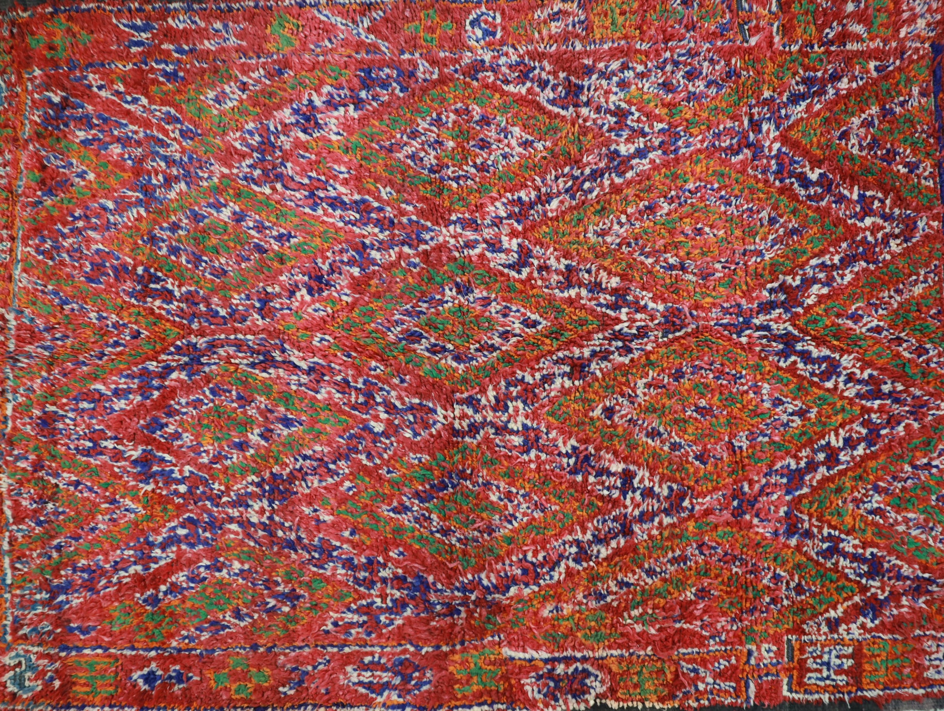 Originating in the Holy town of Boujad, these rugs, woven by diverse tribes, exhibit a wide spectrum of color, composition, and weave. Described as surreal, mystic, and mesmerizing, Boujad rugs transport us to a world beyond reality. Their construction, with twice as many horizontal as vertical knots, renders them floppy and easy to move.