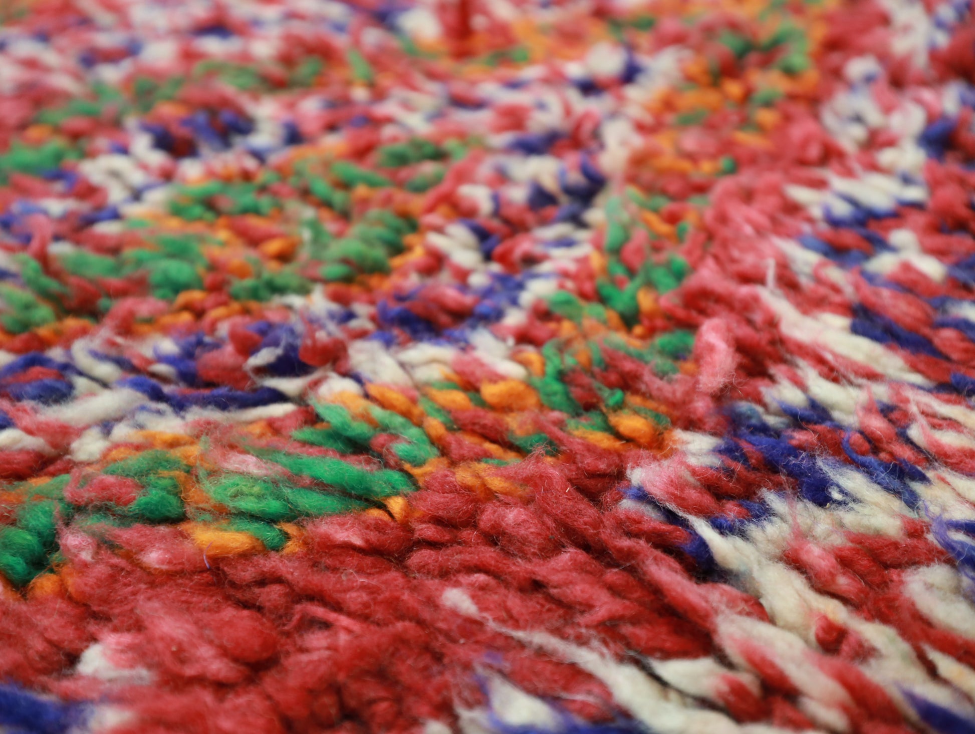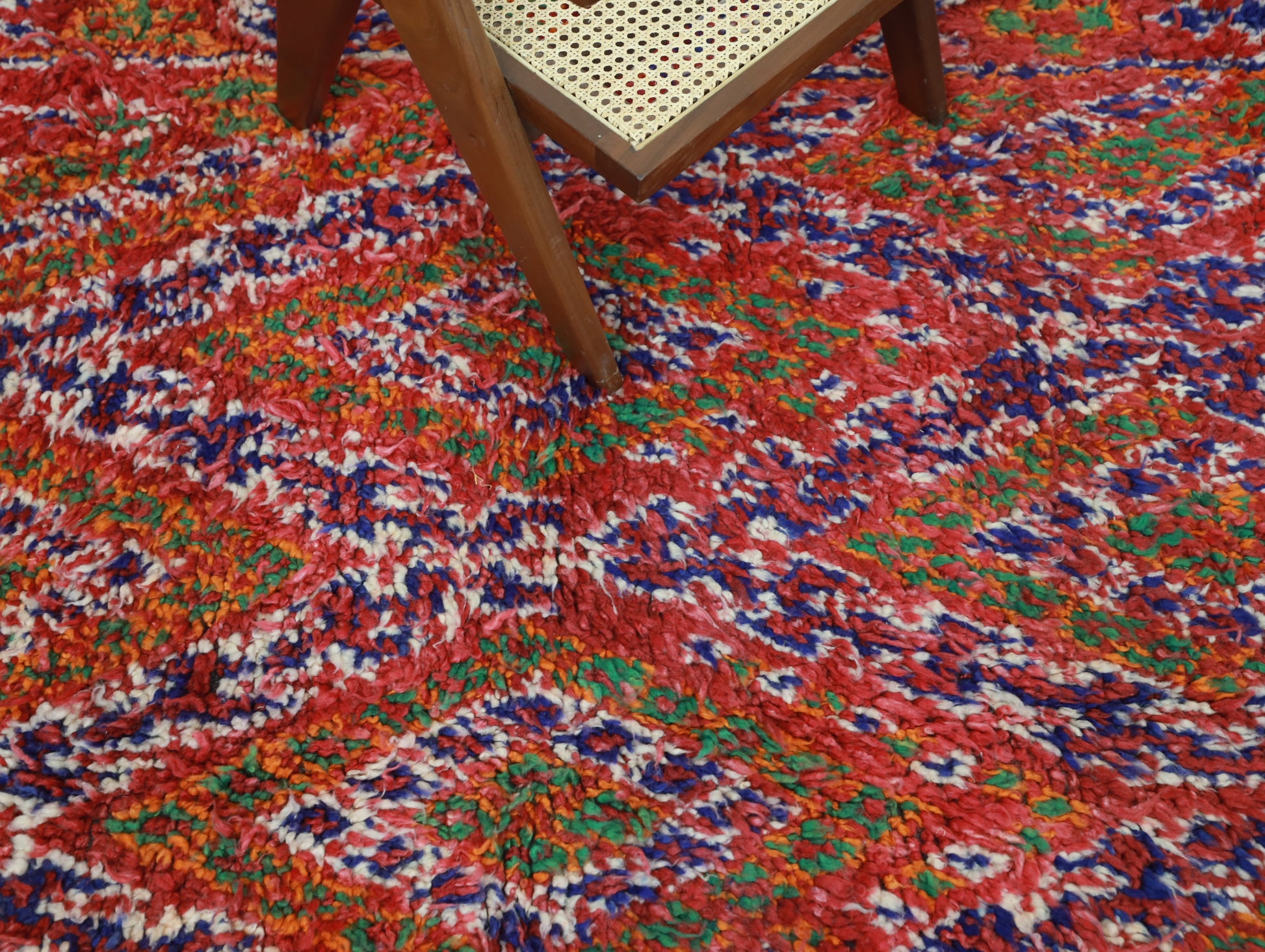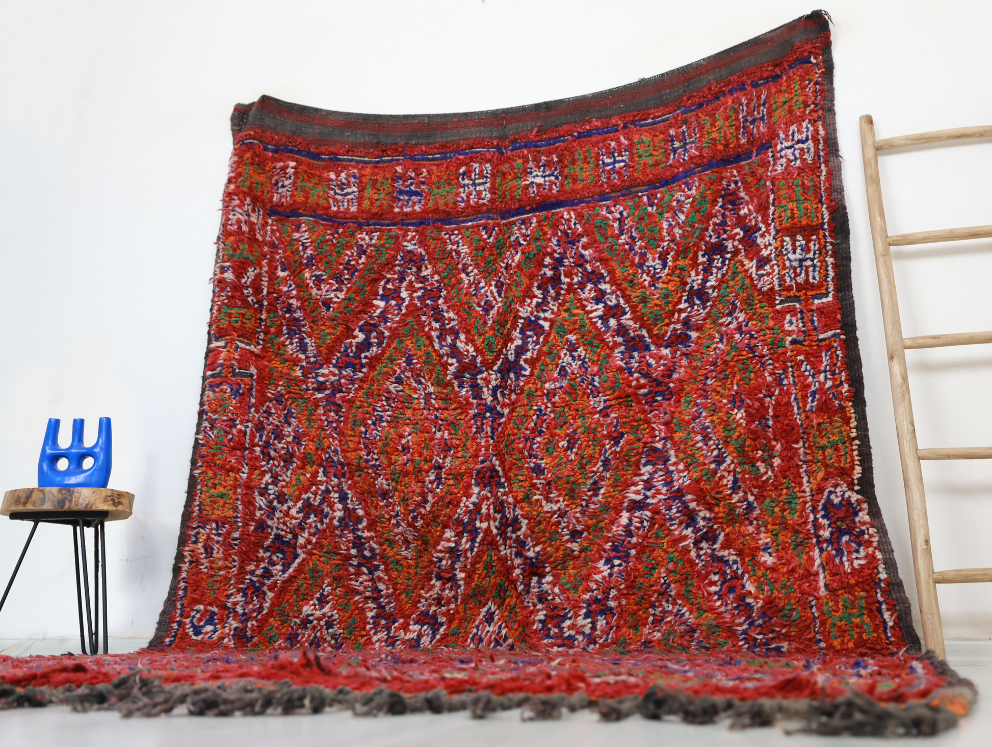 Originating in the Holy town of Boujad, these rugs, woven by diverse tribes, exhibit a wide spectrum of color, composition, and weave. Described as surreal, mystic, and mesmerizing, Boujad rugs transport us to a world beyond reality. Their construction, with twice as many horizontal as vertical knots, renders them floppy and easy to move.